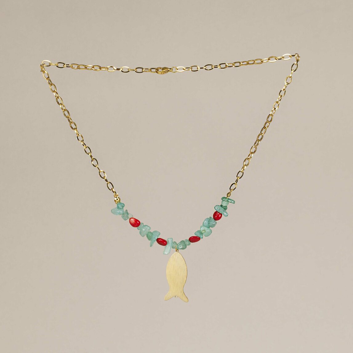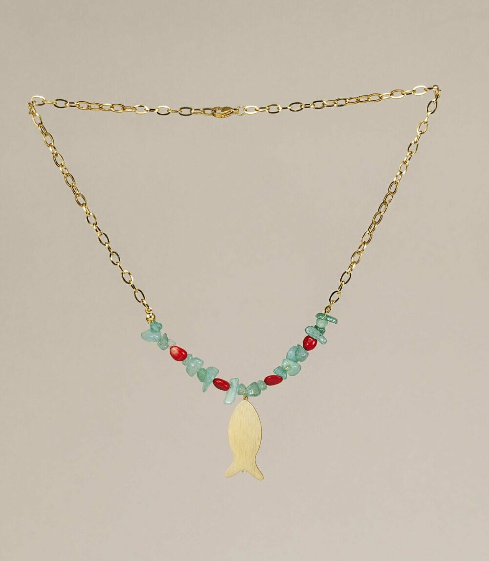 Está montada con una cadena de eslabones dorados, piedras verdes  de amazonita y piedras rojas de corales.