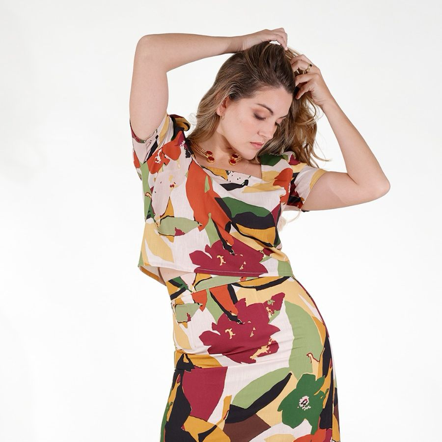 Se compone de un crop top combinado con la falda midi Flori, confeccionado en fresco tejido de lino y disponible en dos colores increíbles: terracota, flores y  verde.