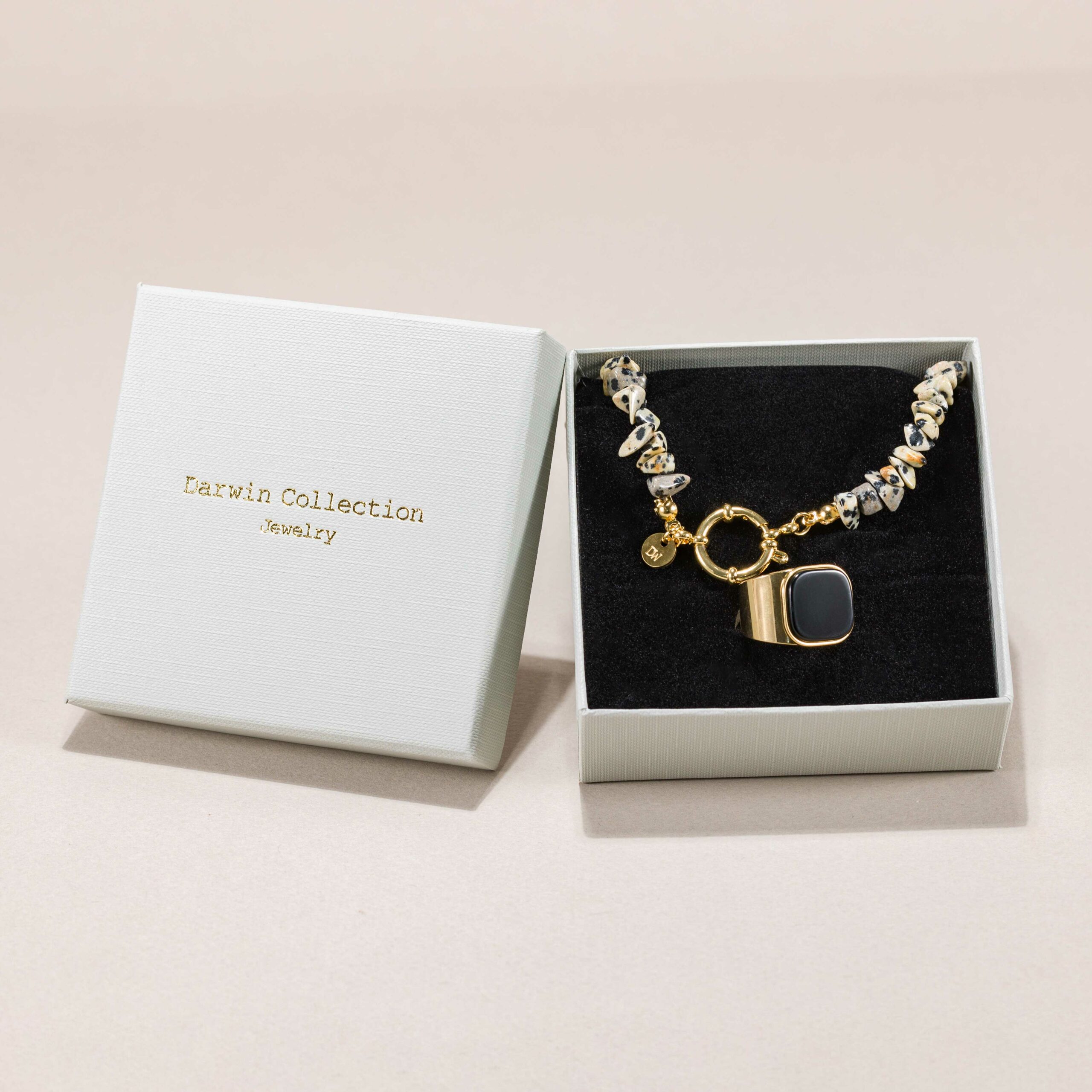 Por otro lado, el Collar Mauricio es una joya artesanal que destaca por su singularidad. Montado a mano en nuestro taller, está compuesto por piedras naturales en tonos vainilla con manchas negras, creando un diseño exclusivo y lleno de carácter. Su cierre marinero en acero inoxidable es práctico y resistente, ideal para lucirlo sin preocuparte por el agua o el desgaste. Si quieres personalizarlo aún más, puedes añadirle un charm como el Charm Grecia, con ónix negro para un toque adicional de elegancia.