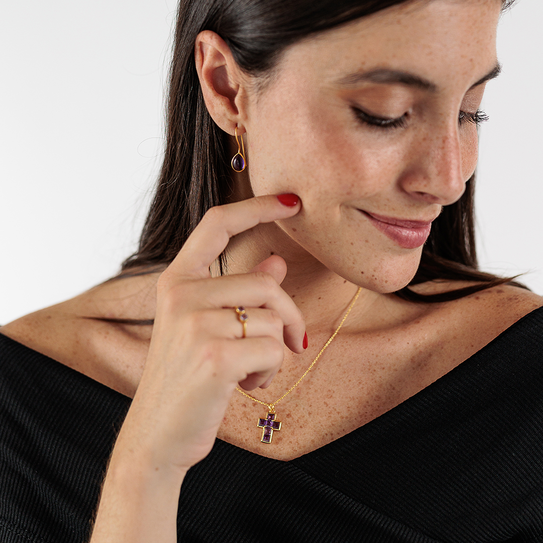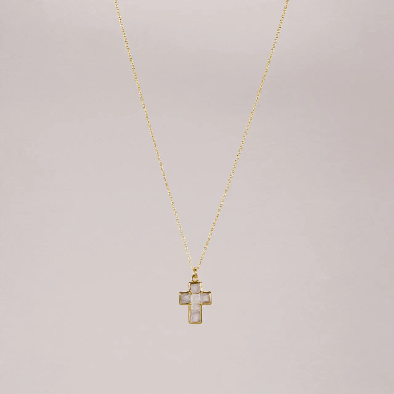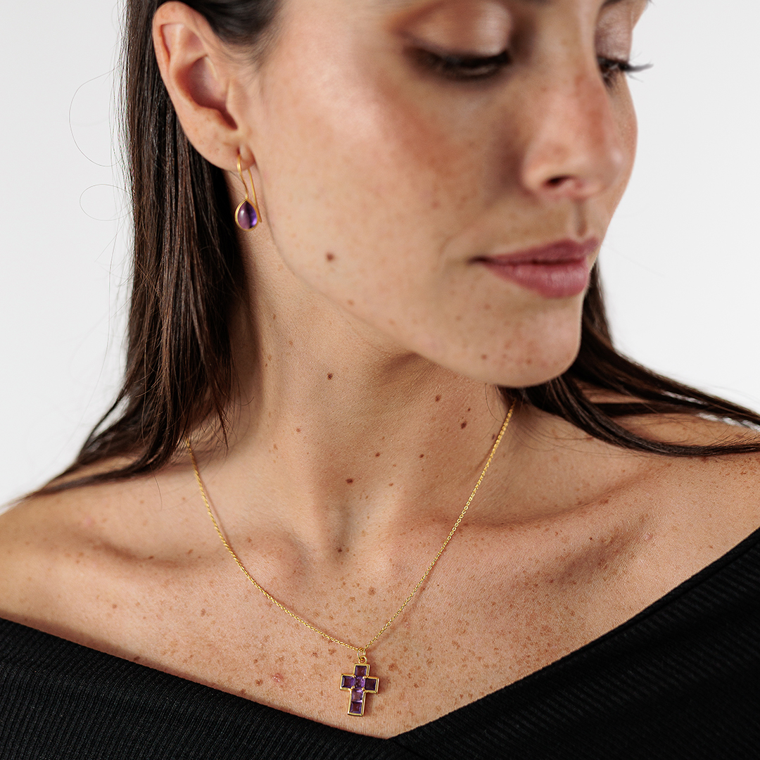 Con un largo de 42/44 centímetros, esta cruz tiene la proporción perfecta para lucirla como collar, ajustándose cómodamente al cuello y complementando cualquier look, desde un estilo casual hasta uno más formal. La piedra natural añade un toque exclusivo y distintivo, haciendo que cada pieza sea única y especial, ideal para quienes buscan un accesorio que combine significado y sofisticación.