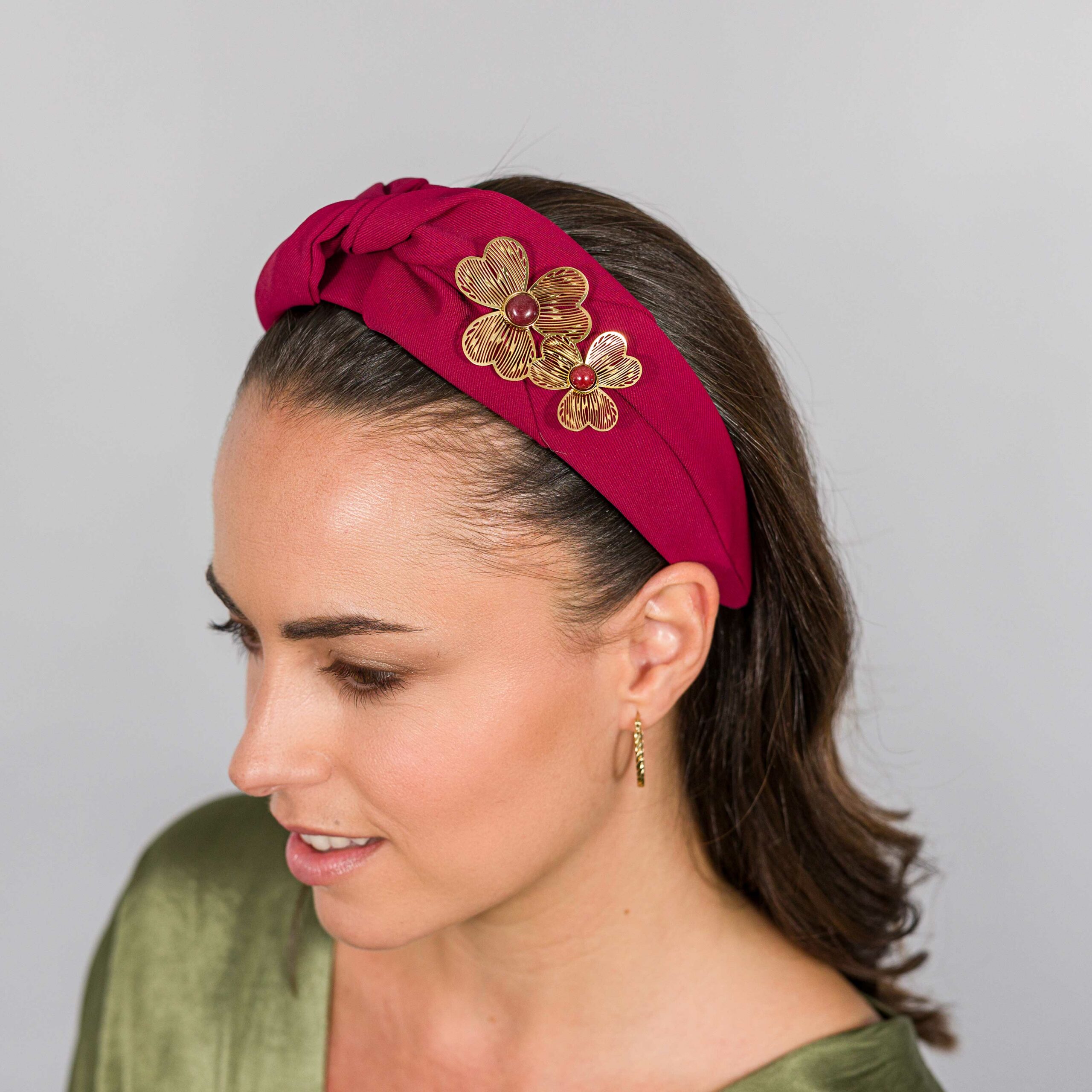 La Diadema para invitada Margot en burdeos lleva  como detalle un adorno de dos flores con piedra en forma redondeada.