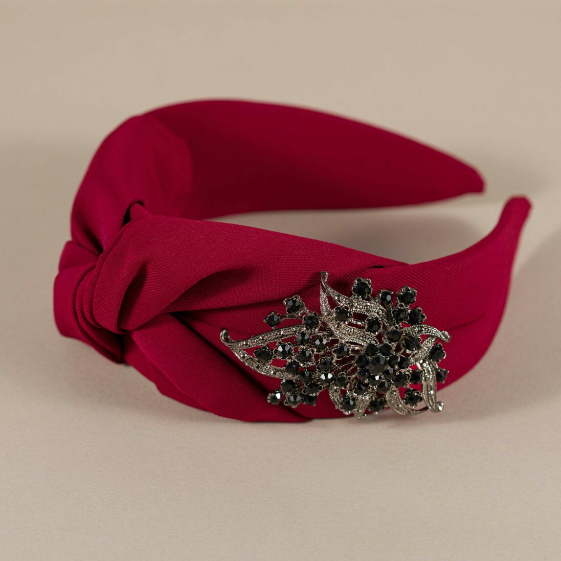 La Diadema Magnolia burdeos es especialmente llamativa, con un aplique en forma de lazo desigual en color plateado envejecido, adornado con circonitas verdes que te harán brillar.