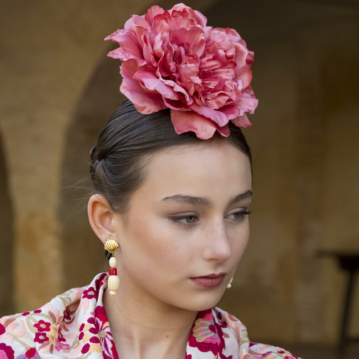 Esta flor de estilo peonía es todo lo que necesitas para darle el toque final perfecto a tu peinado flamenco, tiene un vibrante color salmón envejecido.