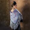 El mantoncillo Carmen DW azul klein es perfecto para cualquier look flamenco 2025. Un mantoncillo azul bordado en seda con colores y fleco de borlón.