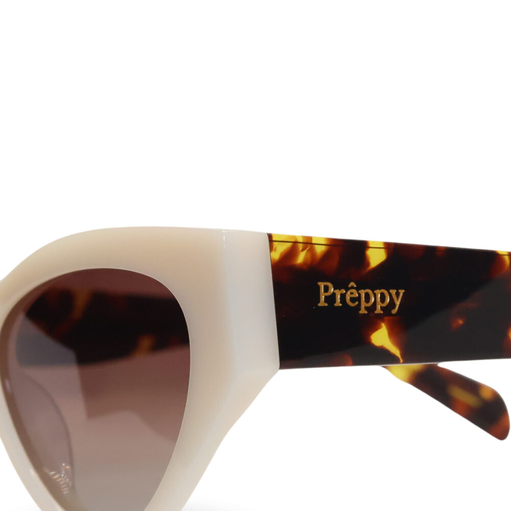 Gafas de sol estilo cat eye en color crema con varillas carey, lentes rosa degradado polarizadas y graduables. Diseño elegante y original de la mano de Preppy, óptica sevillana con mucha personalidad.