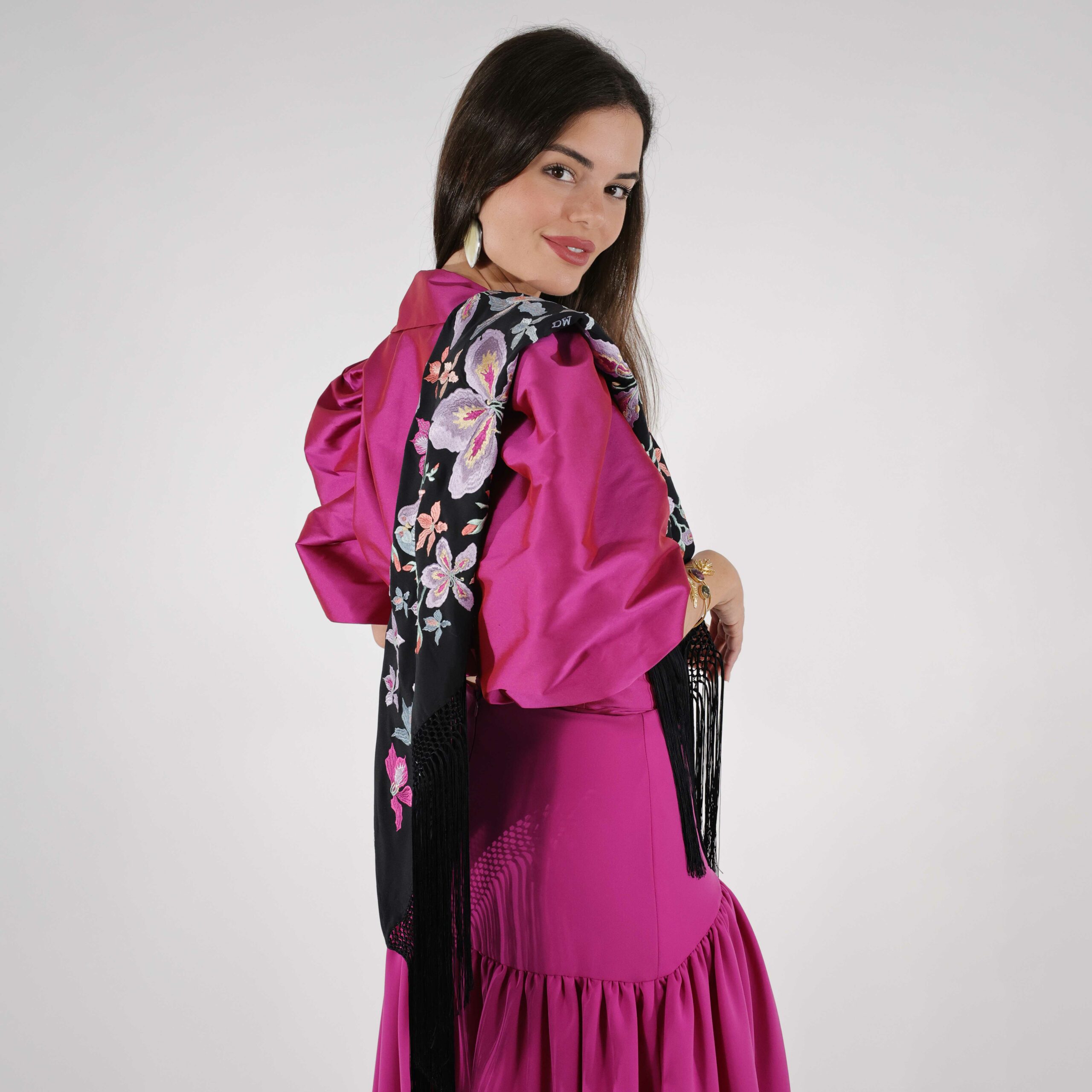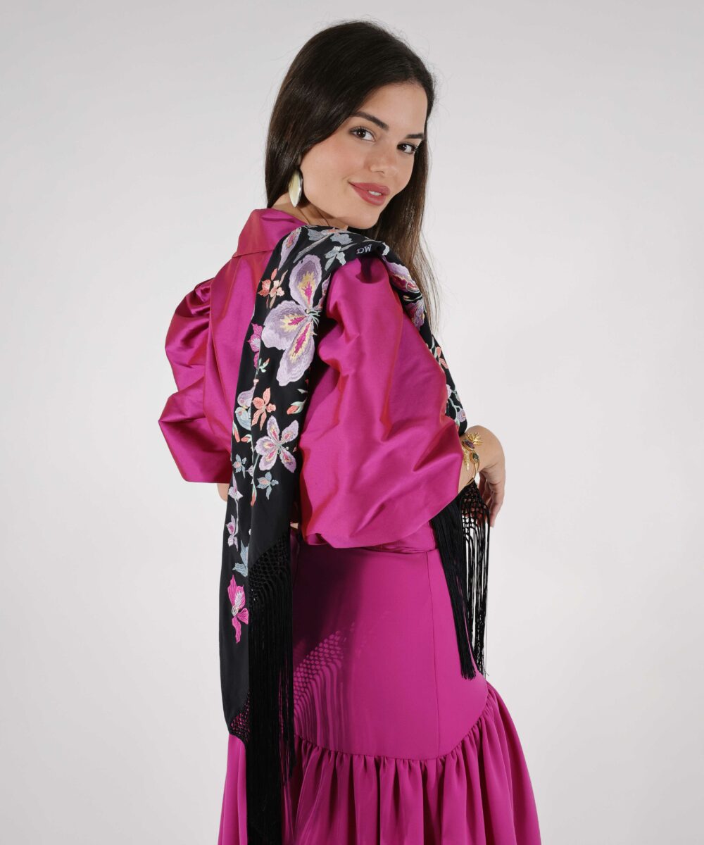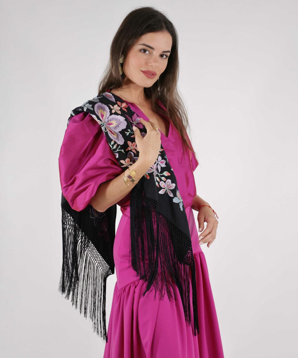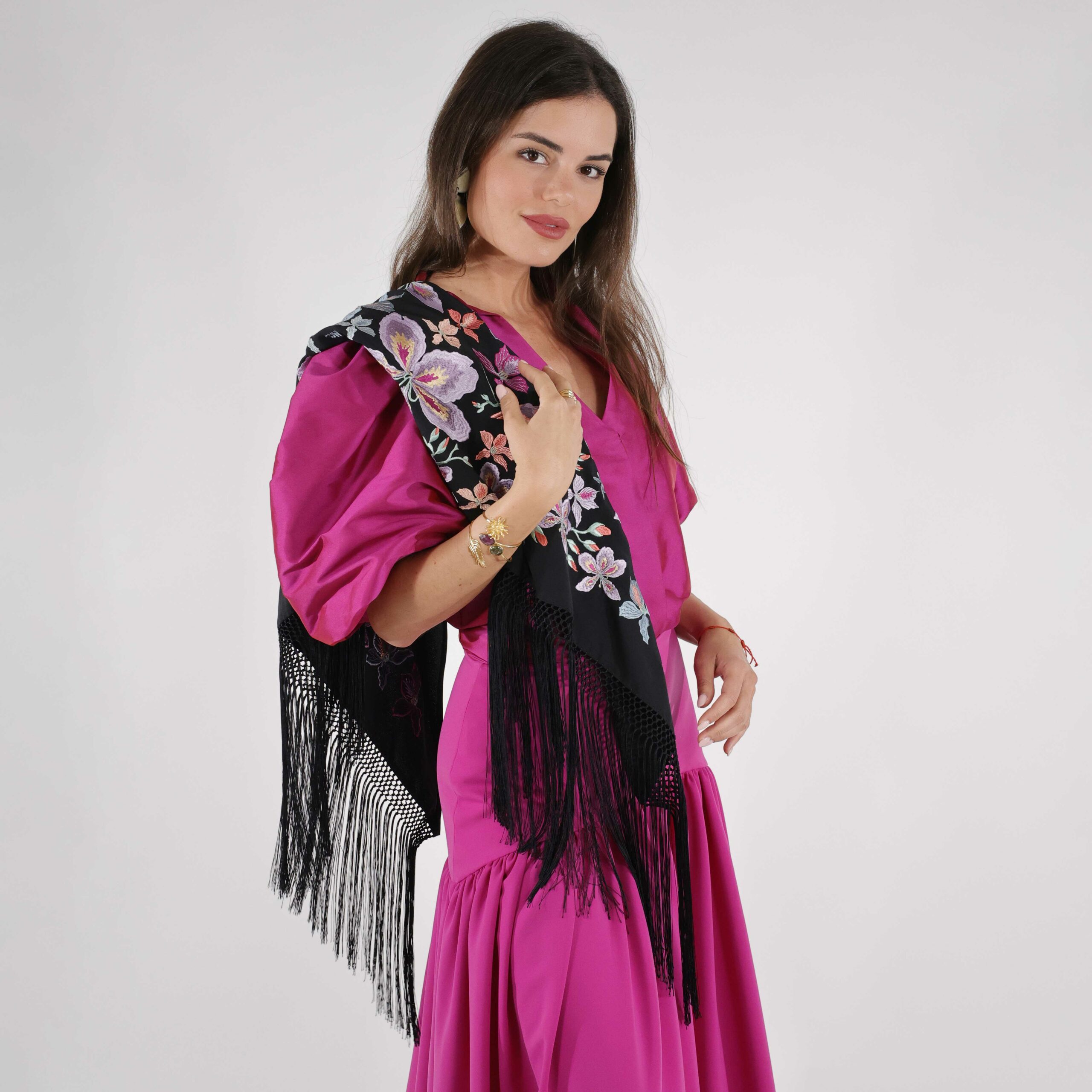 El flecado de nuestros mantones se realiza con gran destreza de forma artesanal. Además, este mantón de flamenca está bordado en varios colores, lo que le proporciona infinitas posibilidades de combinación.