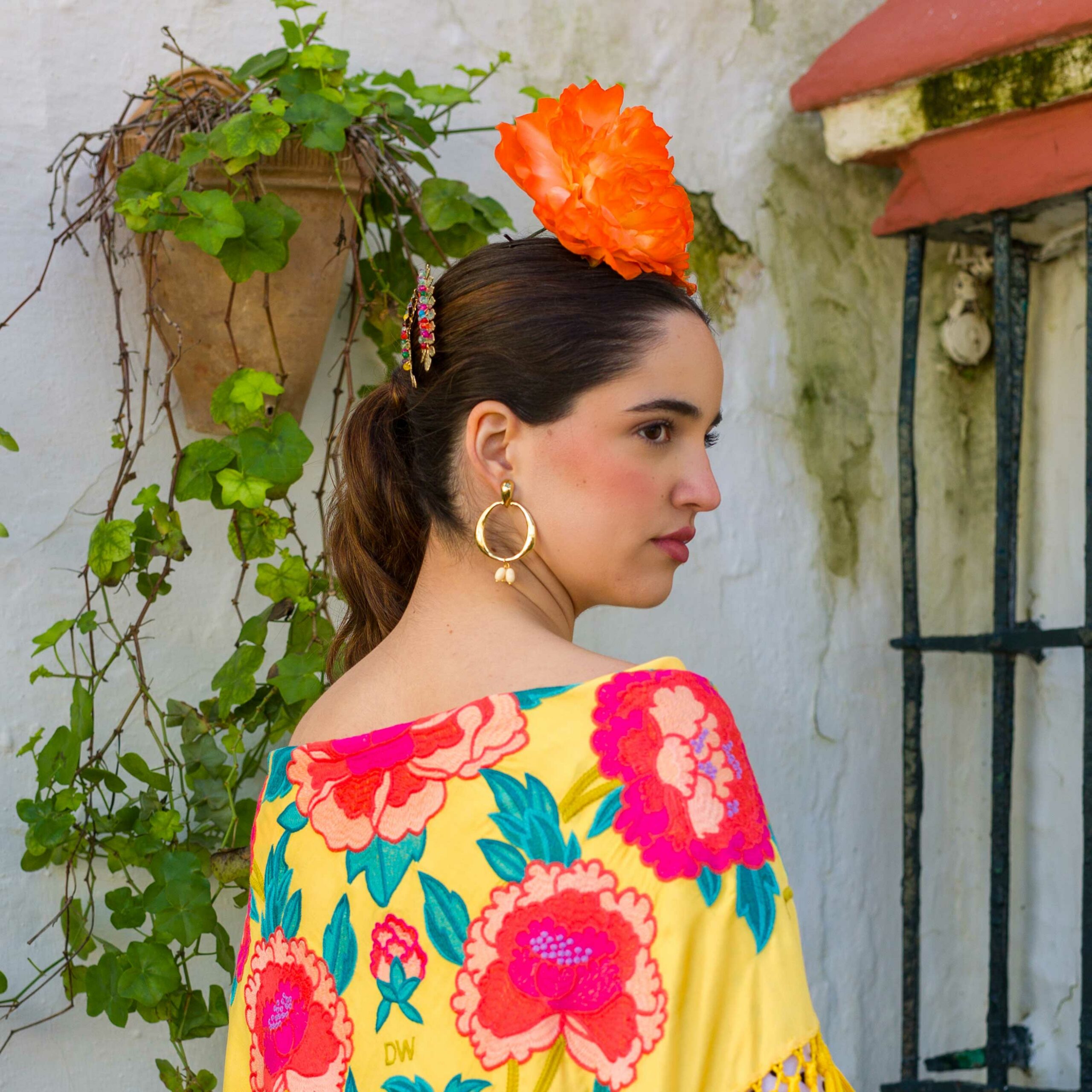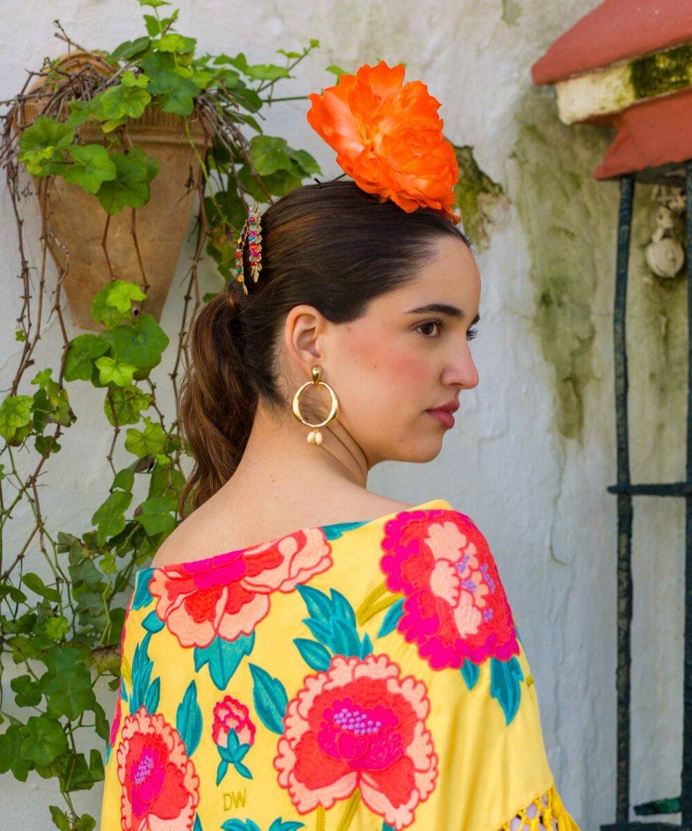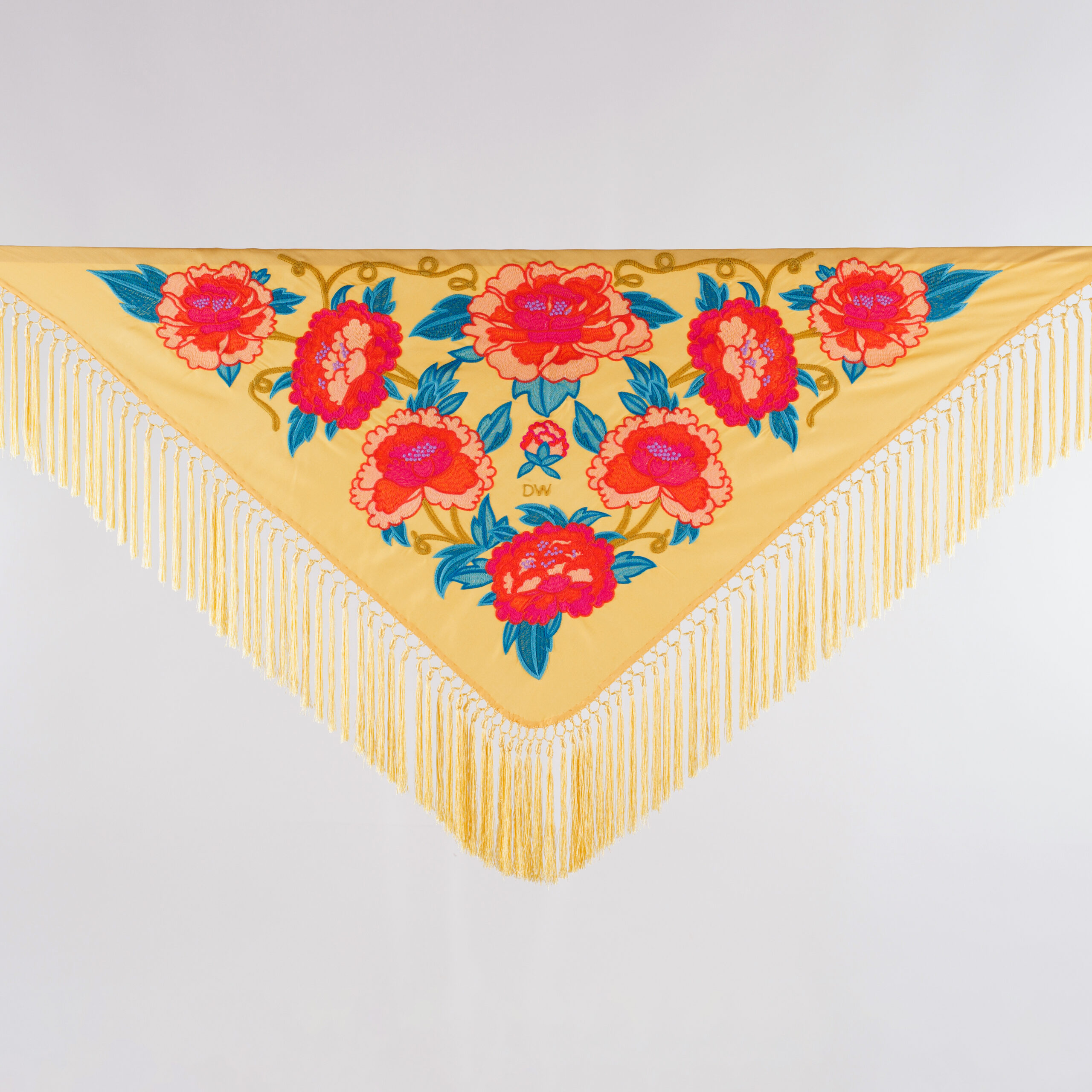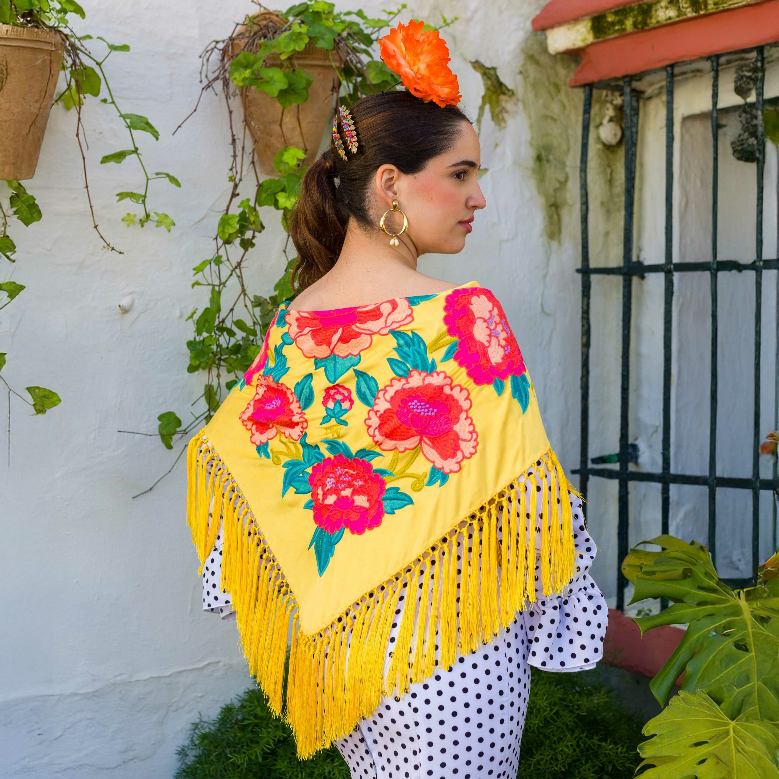 El Mantoncillo Carmen Amarillo es una de esas piezas especiales que Darwin Collection ha creado con mimo para la temporada de Feria 2025. Este diseño exclusivo y de unidades limitadas es una verdadera obra de arte hecha para lucir en esos momentos especiales que solo la feria y las tradiciones andaluzas pueden ofrecer. Inspirado en un estilo clásico, el mantoncillo está completamente bordado con rosas de gran tamaño y tonos vibrantes, que capturan todas las miradas por la frescura y viveza de su combinación de colores.