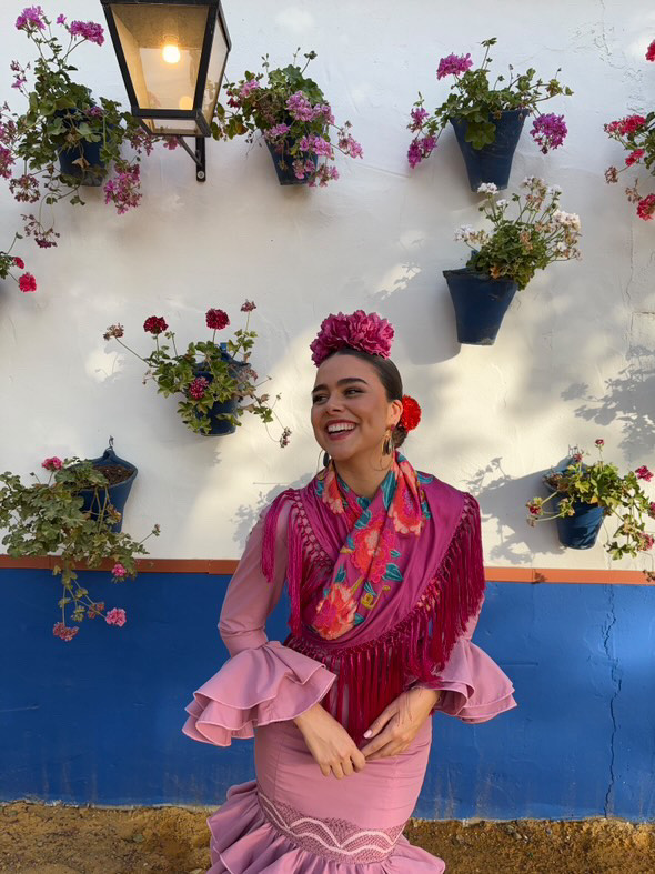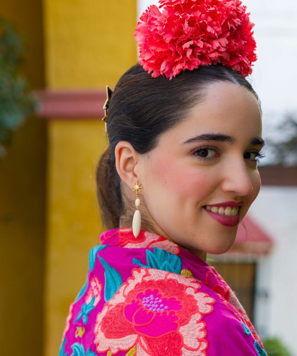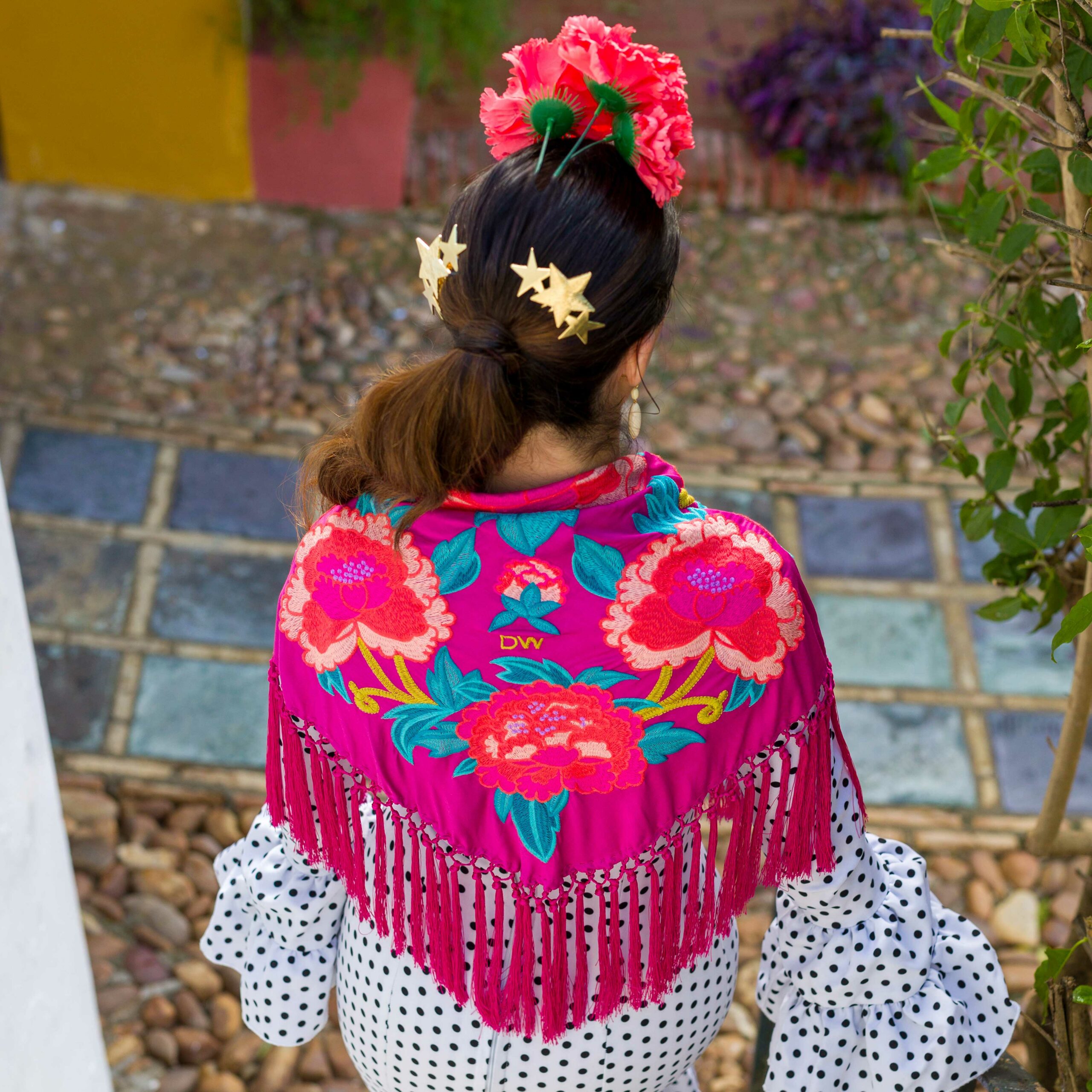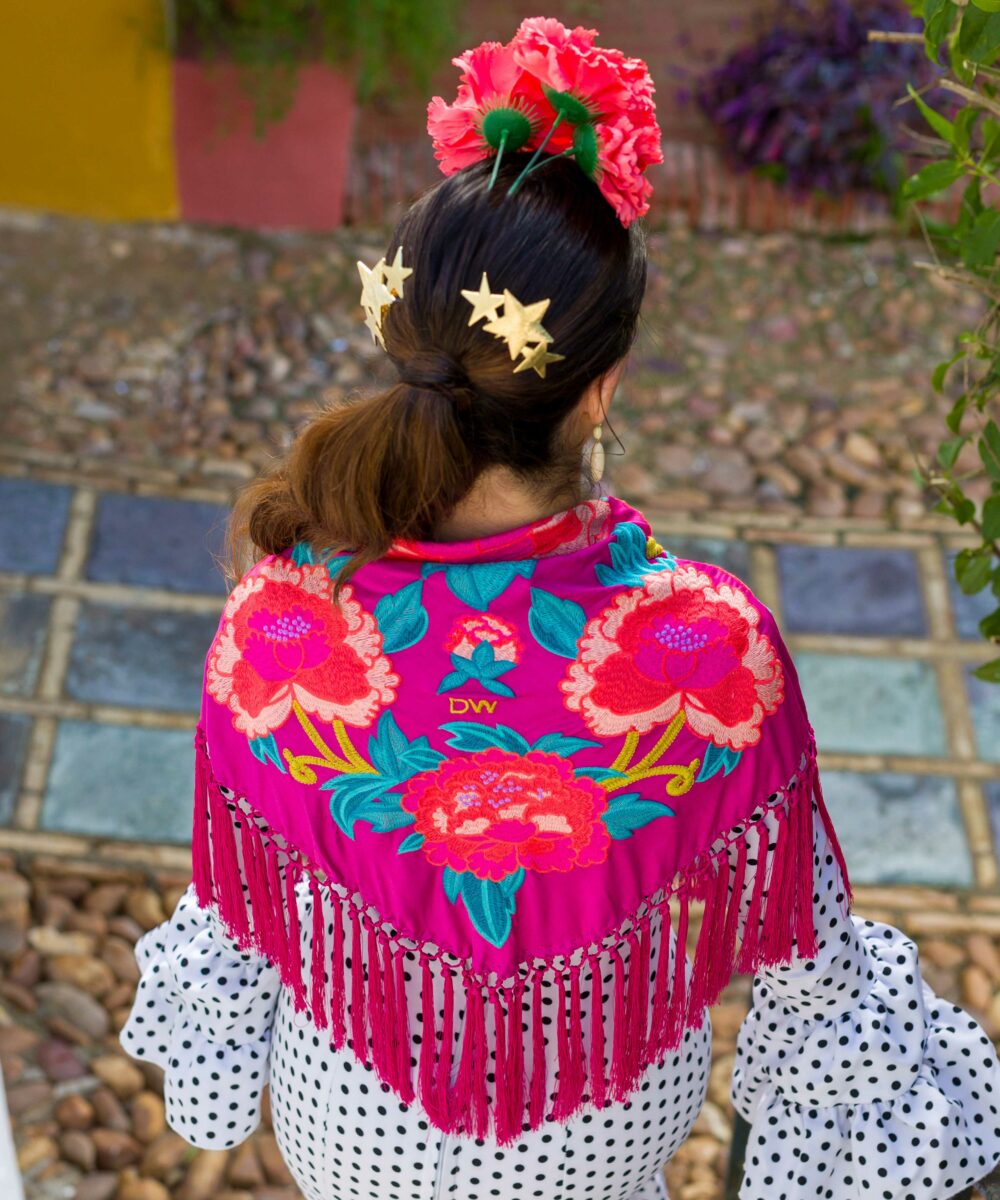 El Mantoncillo Carmen Buganvilla es una de esas piezas especiales que Darwin Collection ha creado con mimo para la temporada de Feria 2025. Este diseño exclusivo y de unidades limitadas es una verdadera obra de arte hecha para lucir en esos momentos especiales que solo la feria y las tradiciones andaluzas pueden ofrecer. Inspirado en un estilo clásico, el mantoncillo está completamente bordado con rosas de gran tamaño y tonos vibrantes, que capturan todas las miradas por la frescura y viveza de su combinación de colores.