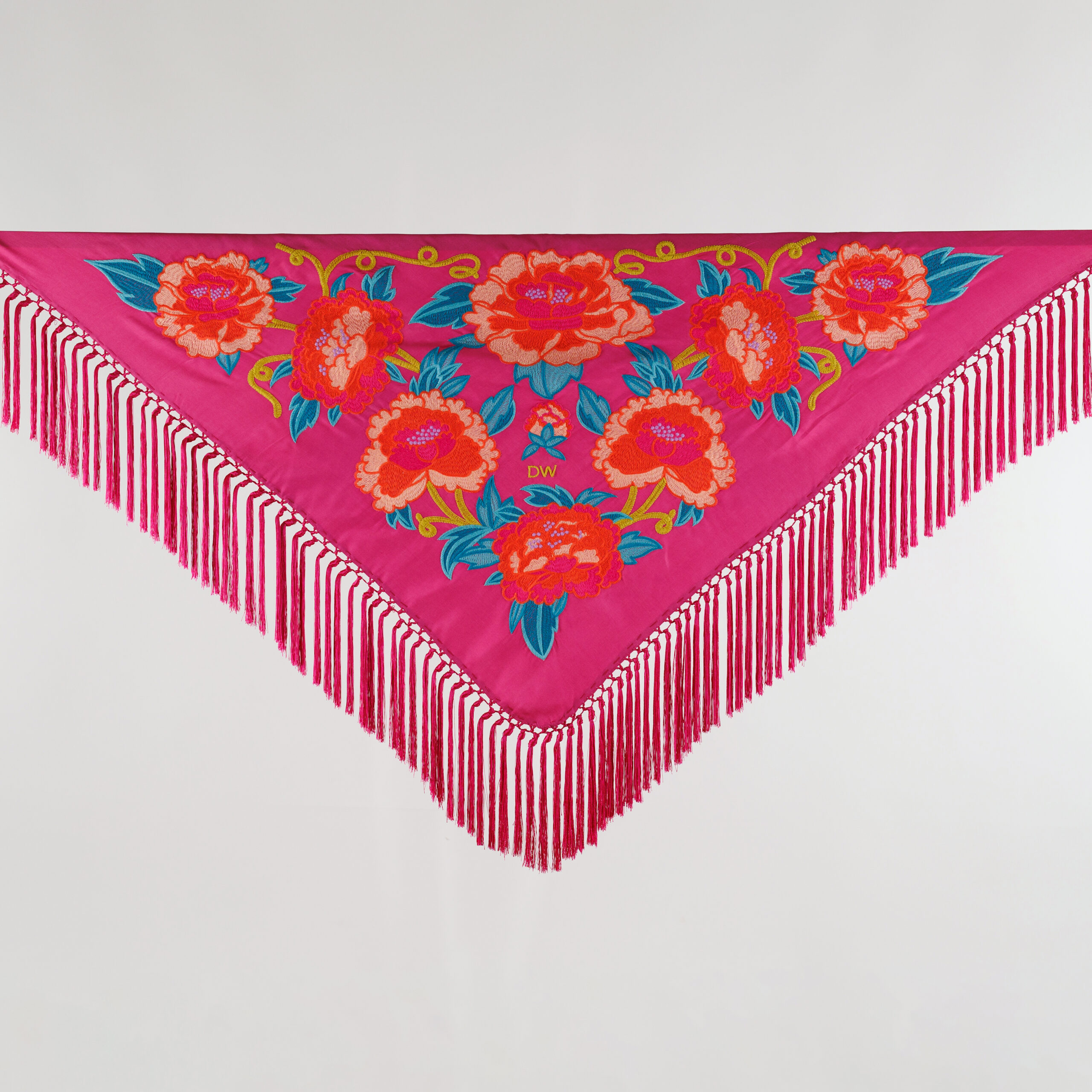 Para esta pieza, comenzamos con un boceto a mano alzada, digitalizando luego el diseño y seleccionando cuidadosamente cada color, tanto del bordado como de la base de seda. Las rosas están bordadas en tonos fucsia, naranja, salmón y malva, mientras que las hojas en azul y los detalles de ramitas en verde lima crean un contraste espectacular. Además, en el pico del mantón se encuentran las iniciales “DW”, un sello de identidad que garantiza su exclusividad.