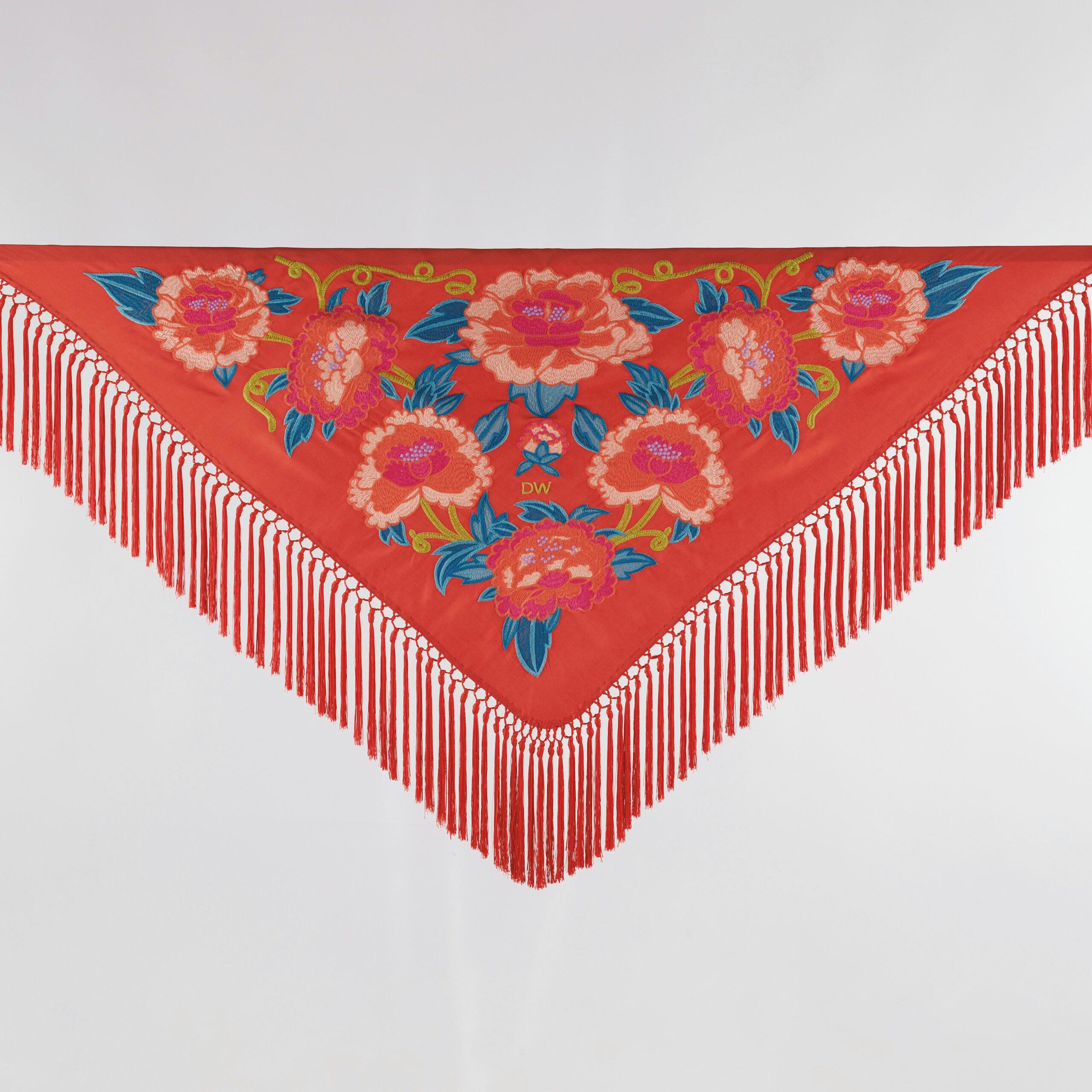 Para esta pieza, comenzamos con un boceto a mano alzada, digitalizando luego el diseño y seleccionando cuidadosamente cada color, tanto del bordado como de la base de seda. Las rosas están bordadas en tonos fucsia, naranja, salmón y malva, mientras que las hojas en azul y los detalles de ramitas en verde lima crean un contraste espectacular. Además, en el pico del mantón se encuentran las iniciales “DW”, un sello de identidad que garantiza su exclusividad.