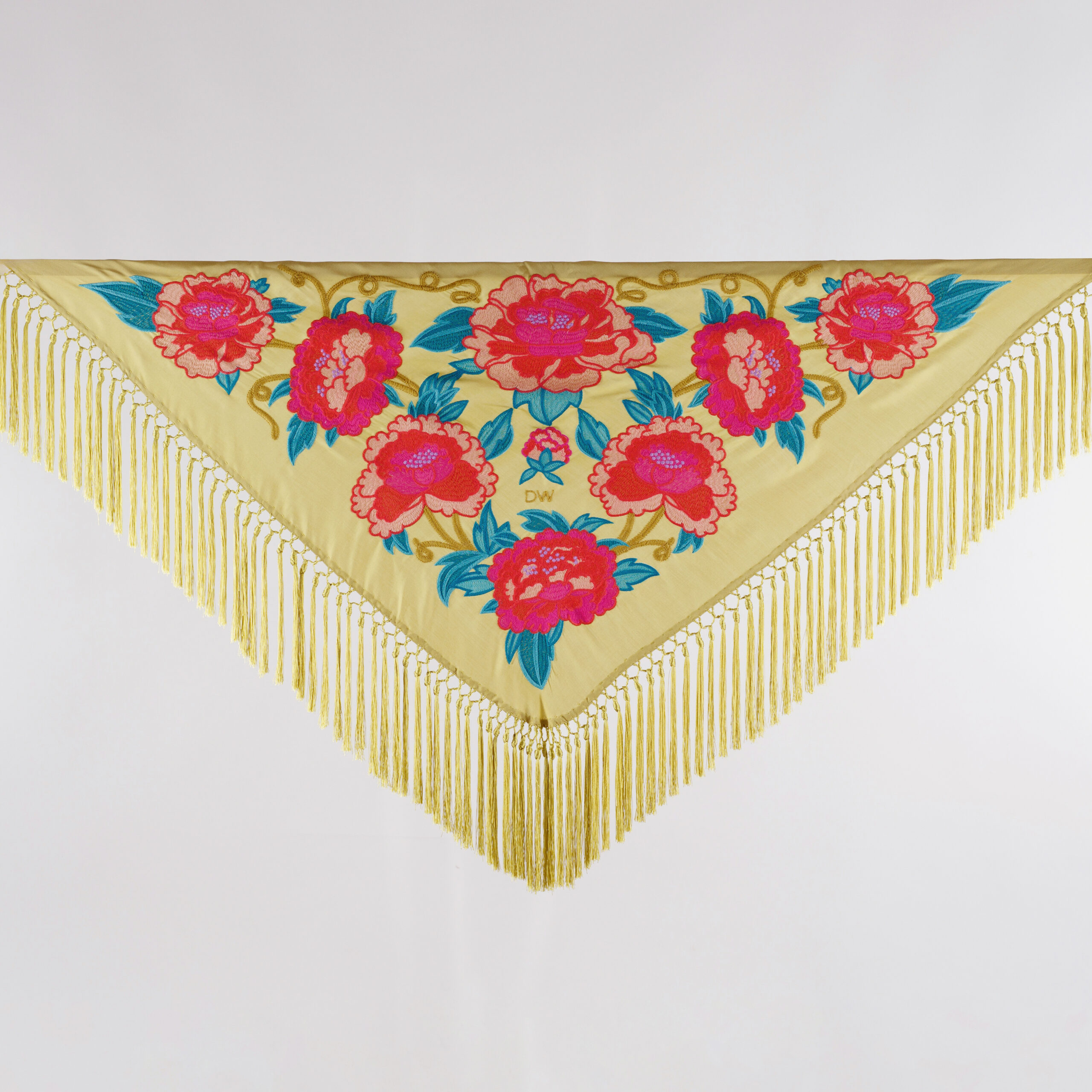 Para esta pieza, comenzamos con un boceto a mano alzada, digitalizando luego el diseño y seleccionando cuidadosamente cada color, tanto del bordado como de la base de seda. Las rosas están bordadas en tonos fucsia, naranja, salmón y malva, mientras que las hojas en azul y los detalles de ramitas en verde lima crean un contraste espectacular. Además, en el pico del mantón se encuentran las iniciales “DW”, un sello de identidad que garantiza su exclusividad.