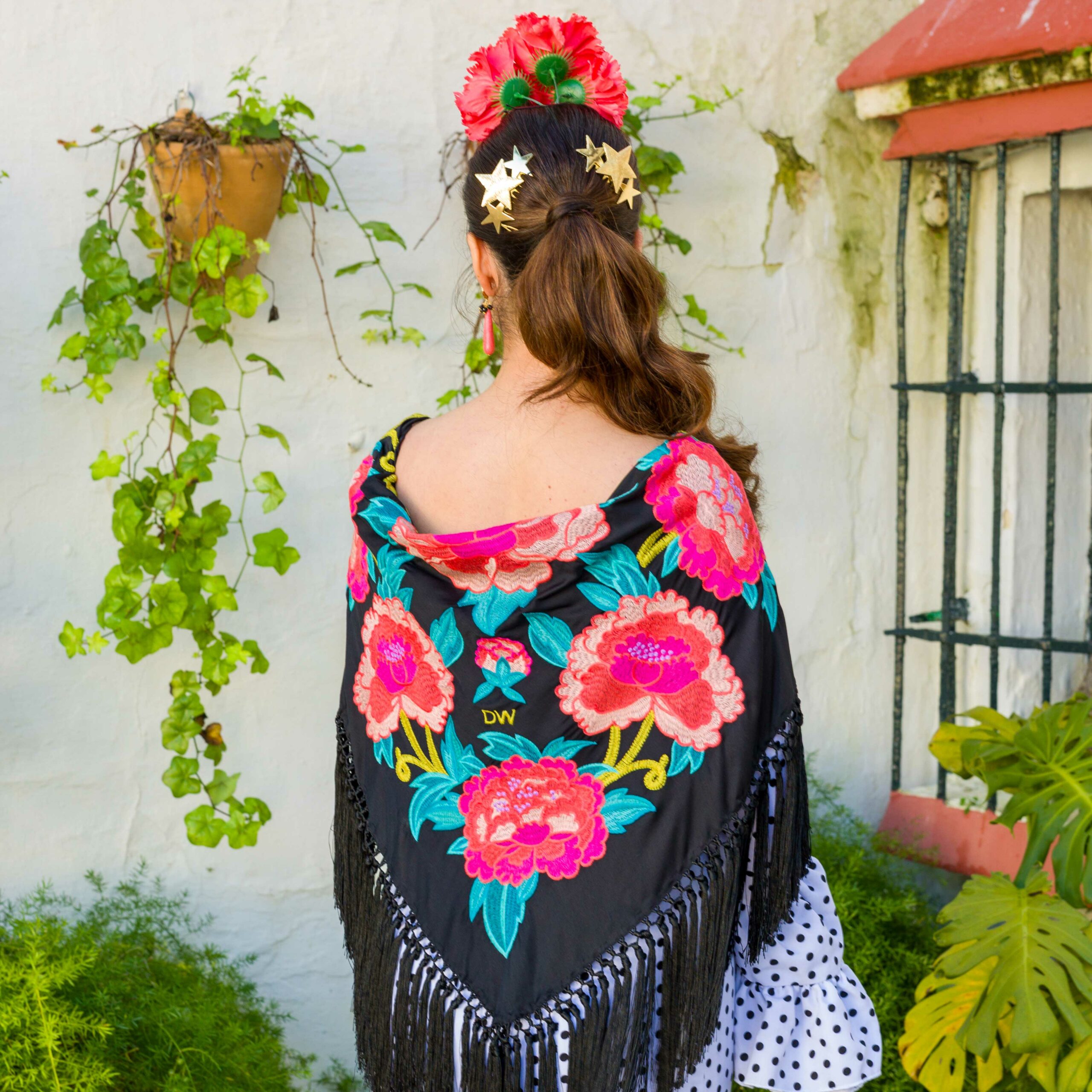 El Mantoncillo Carmen Negro es una de esas piezas especiales que Darwin Collection ha creado con mimo para la temporada de Feria 2025. Este diseño exclusivo y de unidades limitadas es una verdadera obra de arte hecha para lucir en esos momentos especiales que solo la feria y las tradiciones andaluzas pueden ofrecer. Inspirado en un estilo clásico, el mantoncillo está completamente bordado con rosas de gran tamaño y tonos vibrantes, que capturan todas las miradas por la frescura y viveza de su combinación de colores.