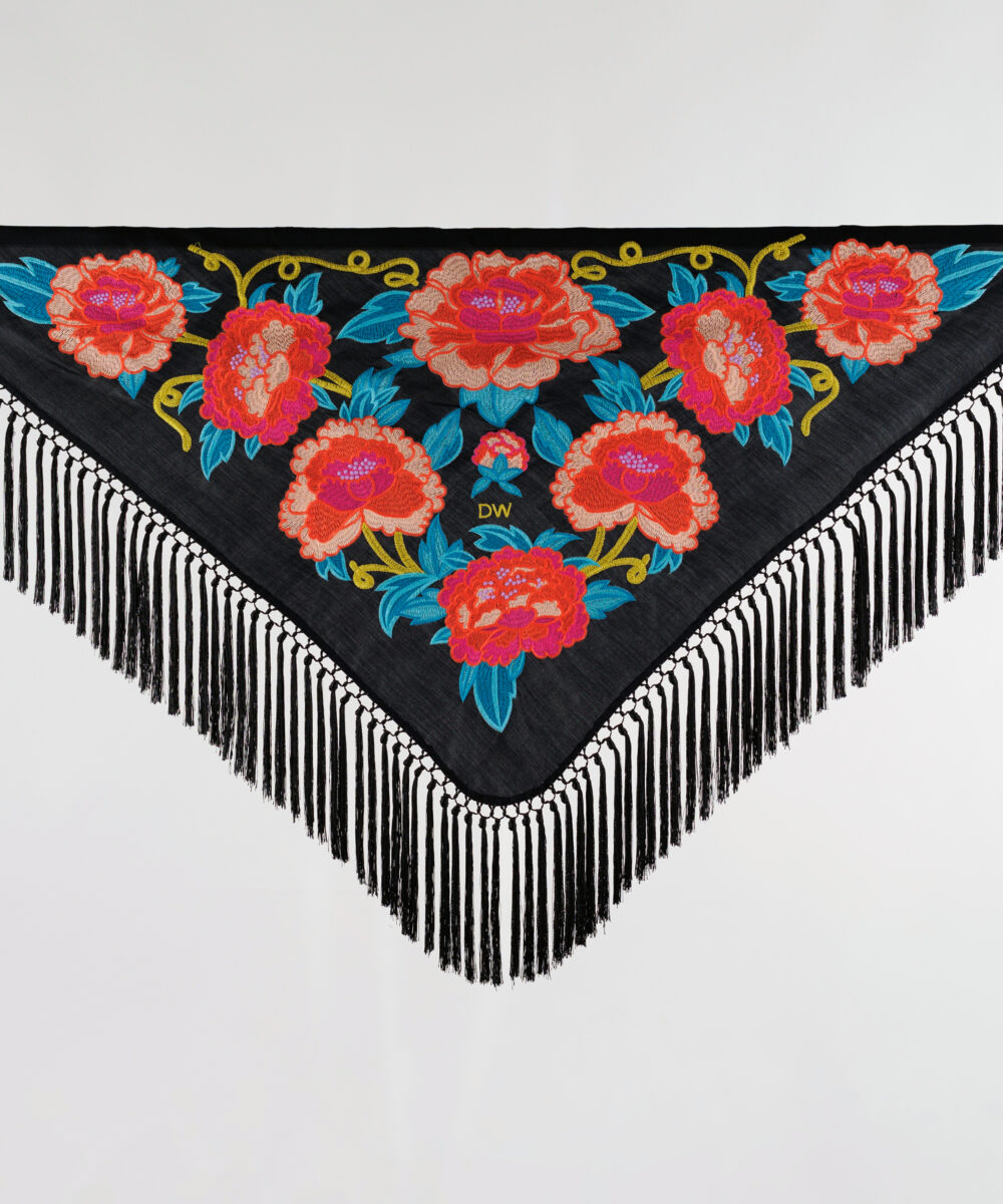 Para esta pieza, comenzamos con un boceto a mano alzada, digitalizando luego el diseño y seleccionando cuidadosamente cada color, tanto del bordado como de la base de seda. Las rosas están bordadas en tonos fucsia, naranja, salmón y malva, mientras que las hojas en azul y los detalles de ramitas en verde lima crean un contraste espectacular. Además, en el pico del mantón se encuentran las iniciales “DW”, un sello de identidad que garantiza su exclusividad.