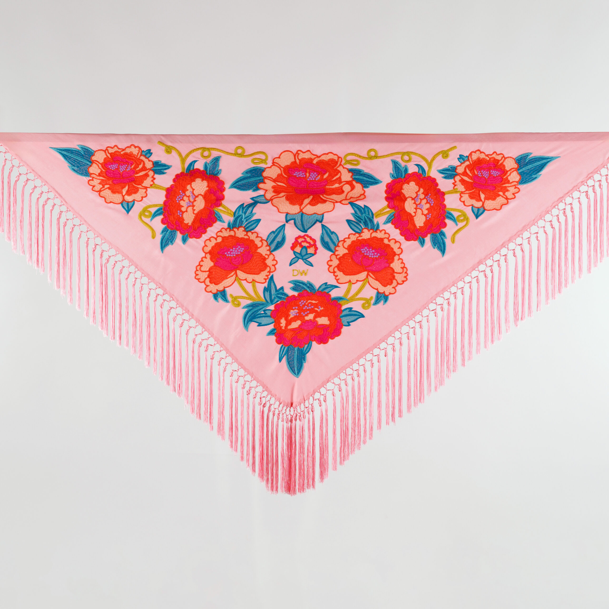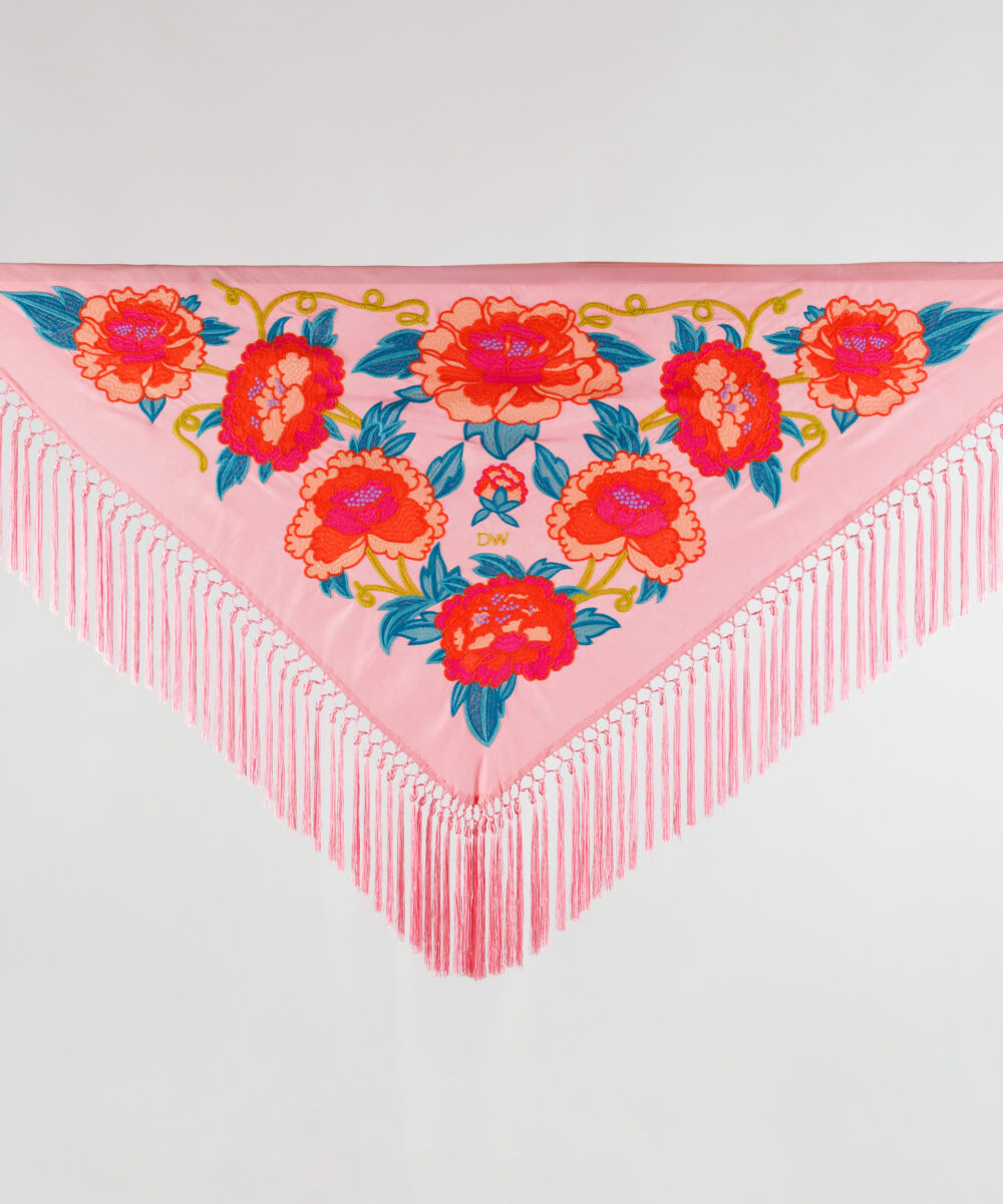 Para esta pieza, comenzamos con un boceto a mano alzada, digitalizando luego el diseño y seleccionando cuidadosamente cada color, tanto del bordado como de la base de seda. Las rosas están bordadas en tonos fucsia, naranja, salmón y malva, mientras que las hojas en azul y los detalles de ramitas en verde lima crean un contraste espectacular. Además, en el pico del mantón se encuentran las iniciales “DW”, un sello de identidad que garantiza su exclusividad.