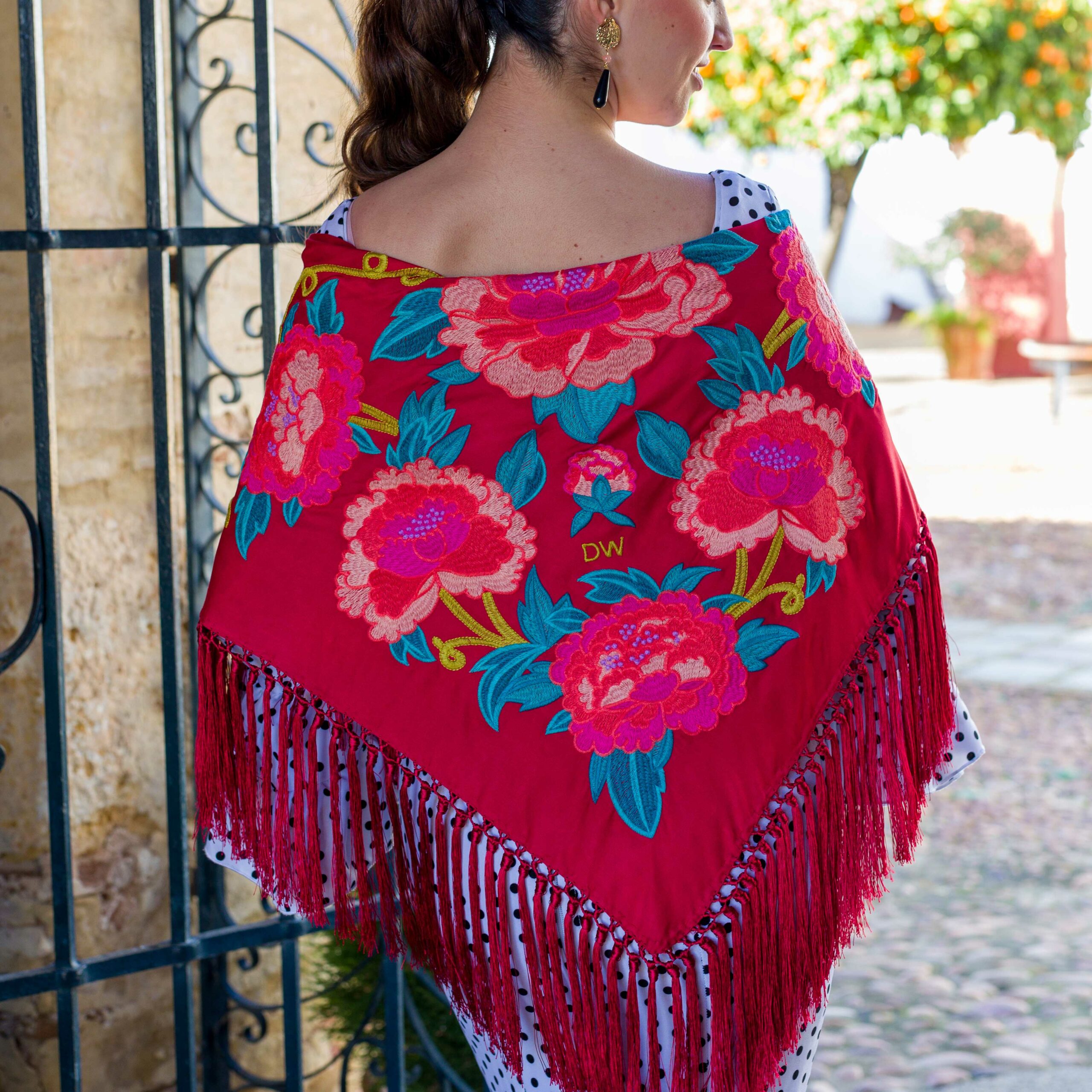 El Mantoncillo Carmen Vino es una de esas piezas especiales que Darwin Collection ha creado con mimo para la temporada de Feria 2025. Este diseño exclusivo y de unidades limitadas es una verdadera obra de arte hecha para lucir en esos momentos especiales que solo la feria y las tradiciones andaluzas pueden ofrecer. Inspirado en un estilo clásico, el mantoncillo está completamente bordado con rosas de gran tamaño y tonos vibrantes, que capturan todas las miradas por la frescura y viveza de su combinación de colores.