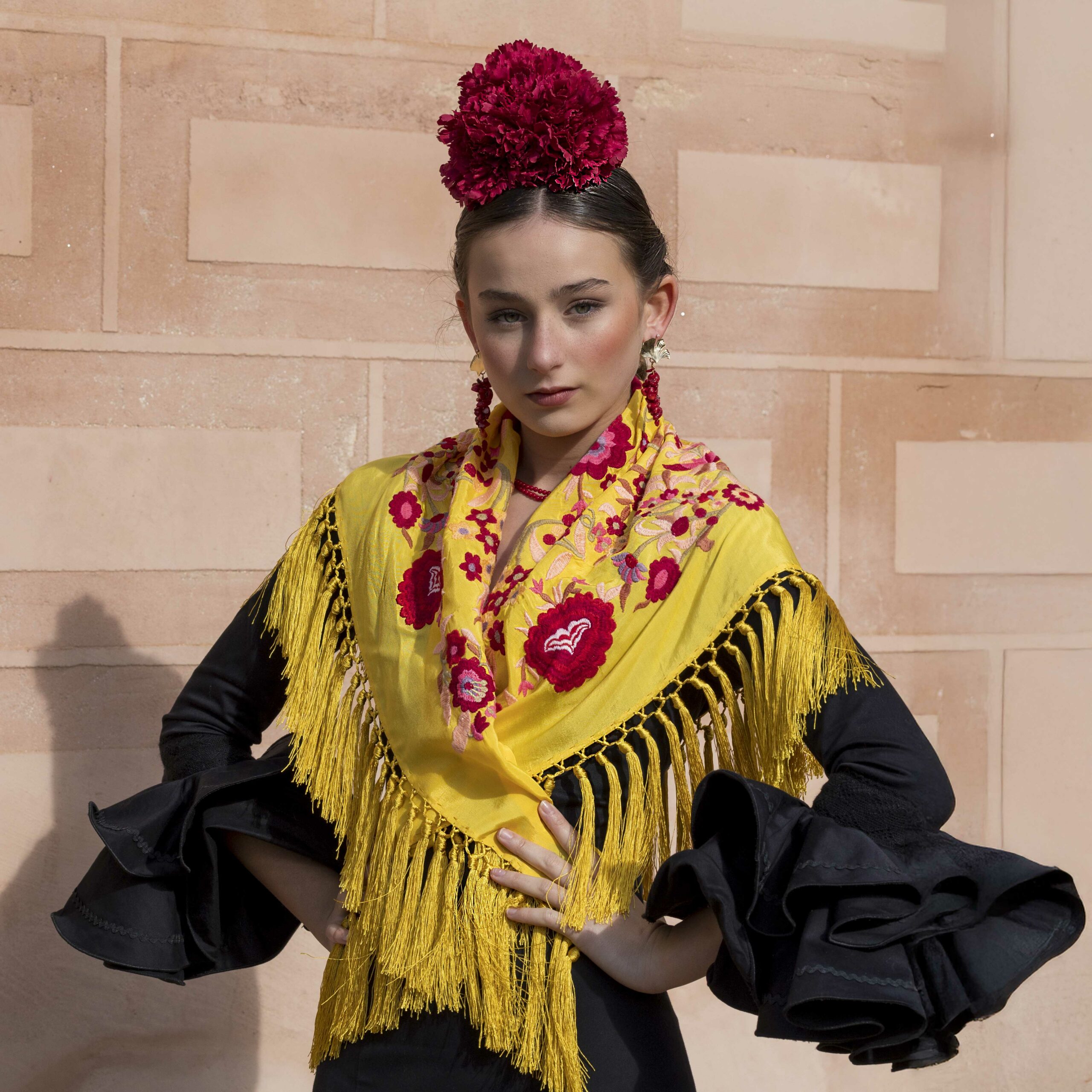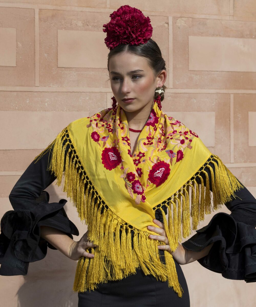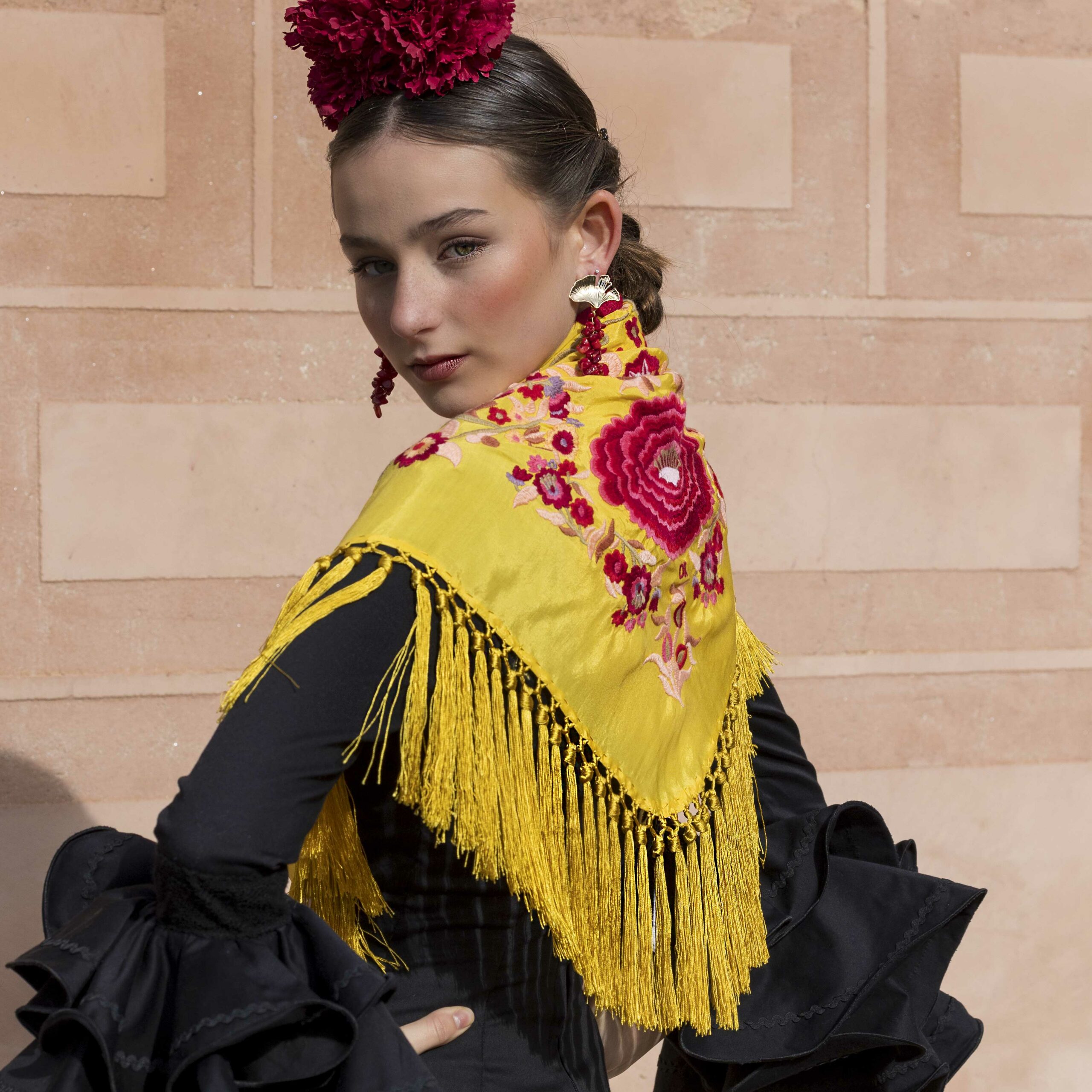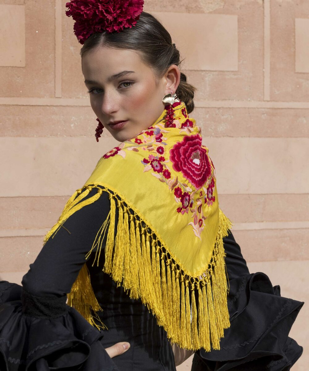 Además, no olvides explorar nuestra colección de complementos, como pendientes y peinecillos, diseñados y fabricados por nuestra marca aquí en el taller. ¡Atrévete a lucir única y elegante en la próxima feria con el Mantoncillo Lola DW en amarillo!