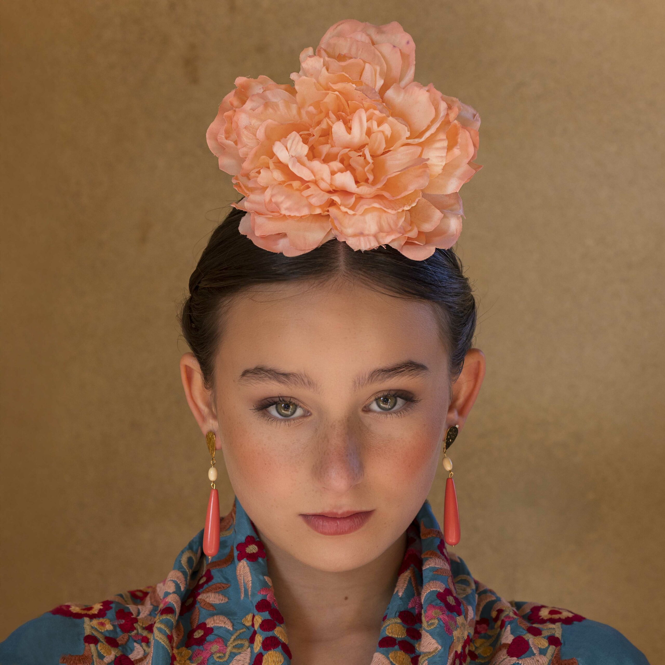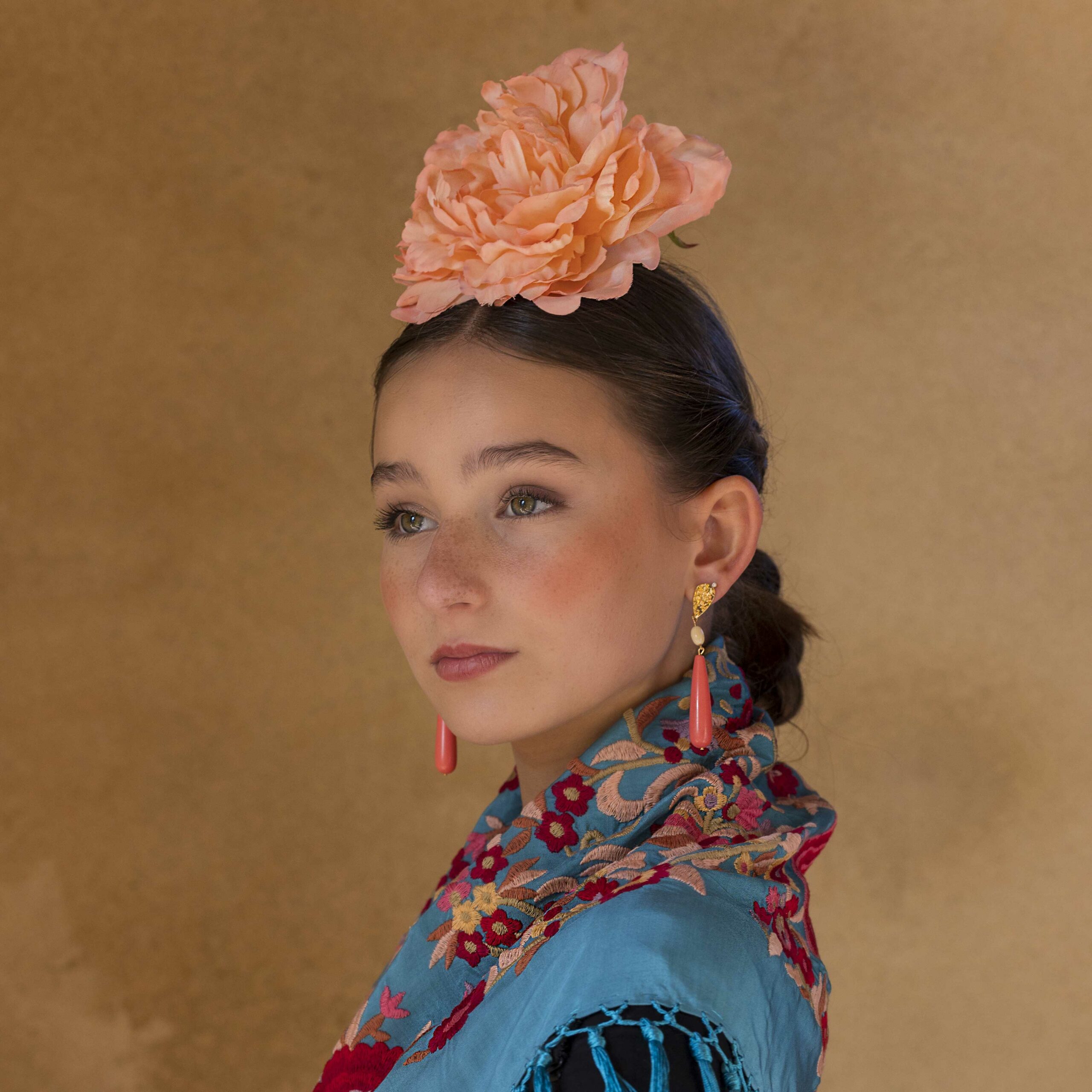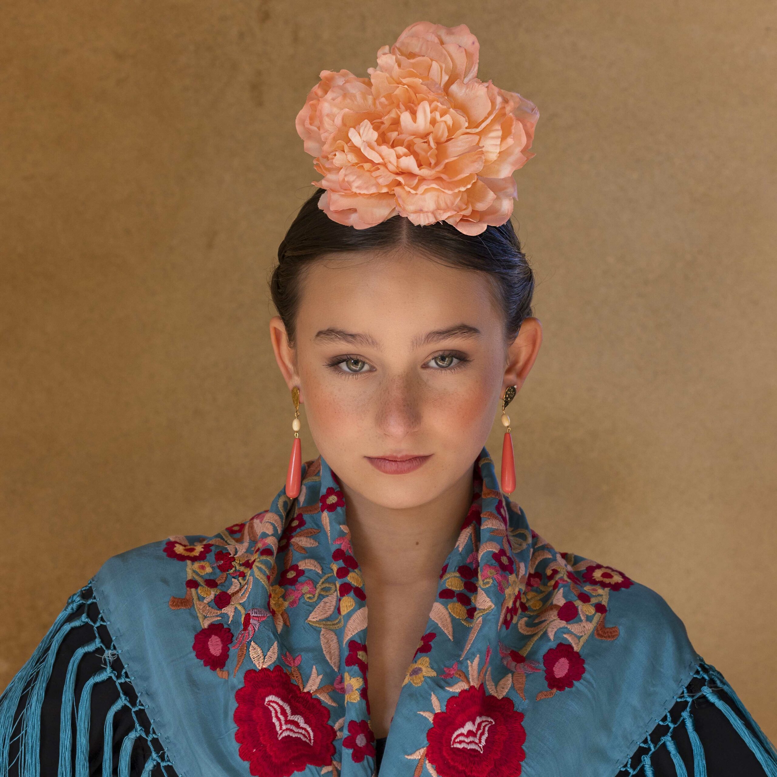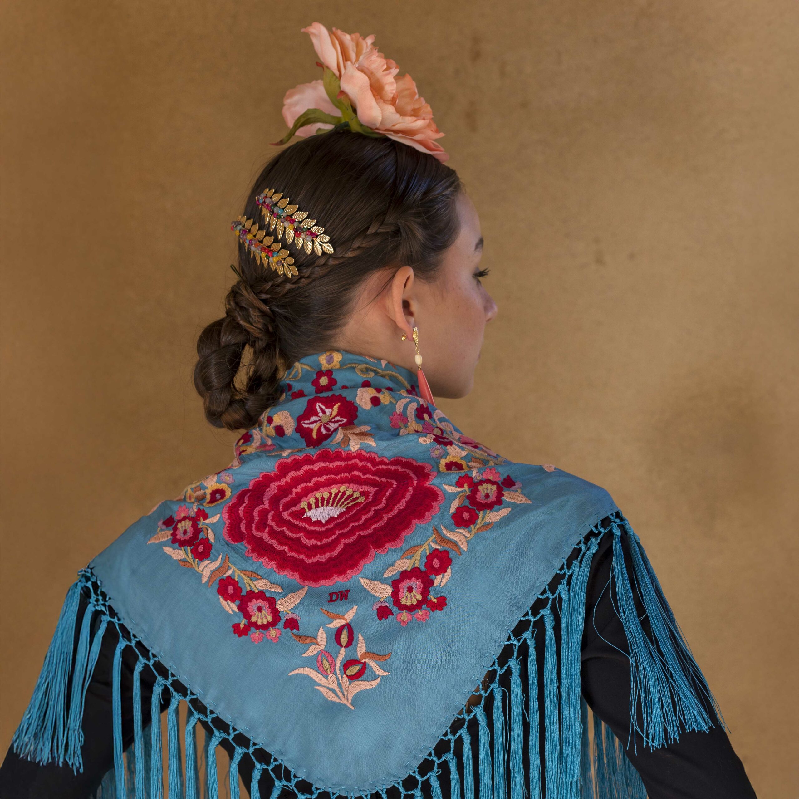 Además, no olvides explorar nuestra colección de complementos, como pendientes y peinecillos, diseñados y fabricados por nuestra marca aquí en el taller. ¡Atrévete a lucir única y elegante en la próxima feria con el Mantoncillo Lola DW en azul capri!