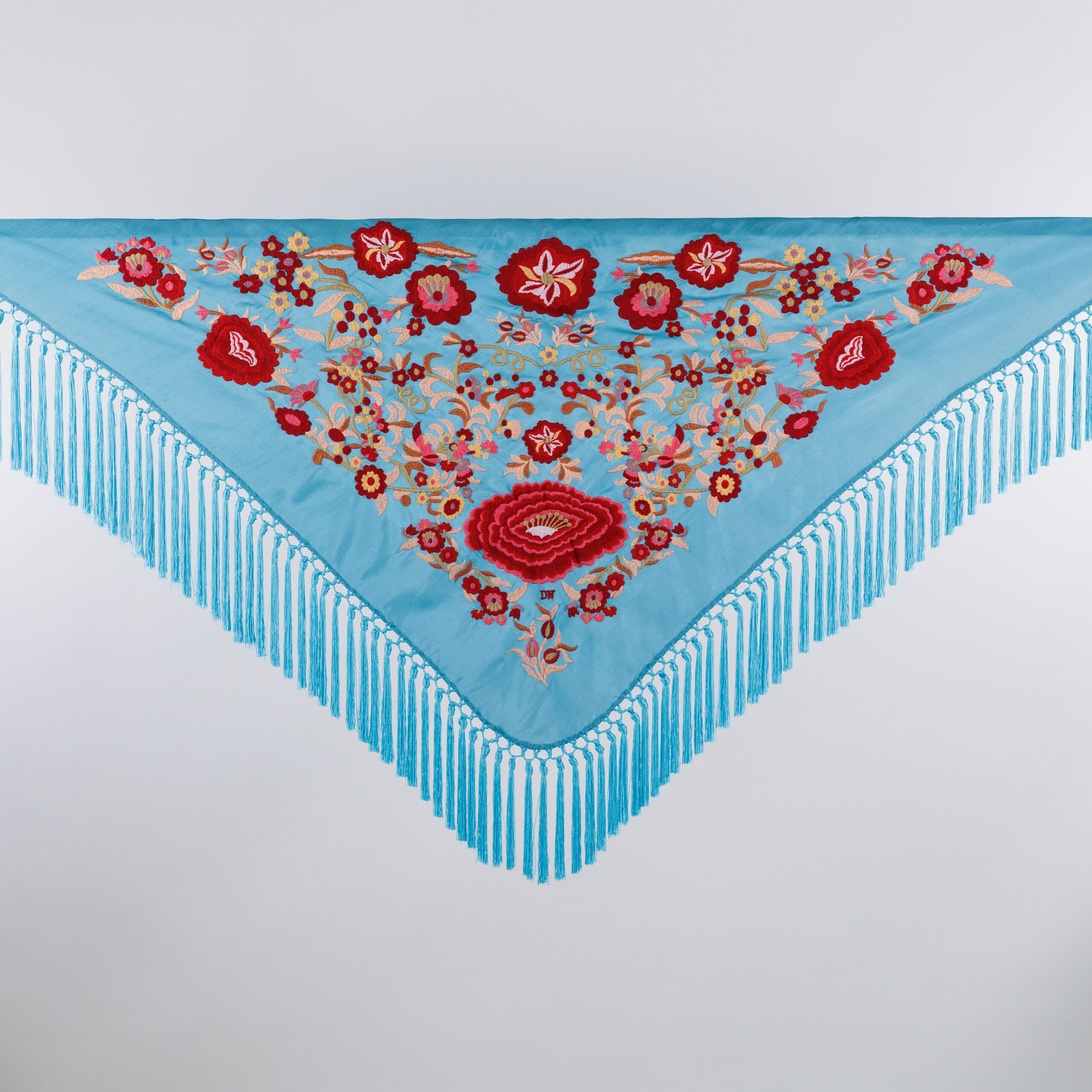 Nuestro mantoncillo está confeccionado en seda de algodón, bordado a máquina y flecado a mano .