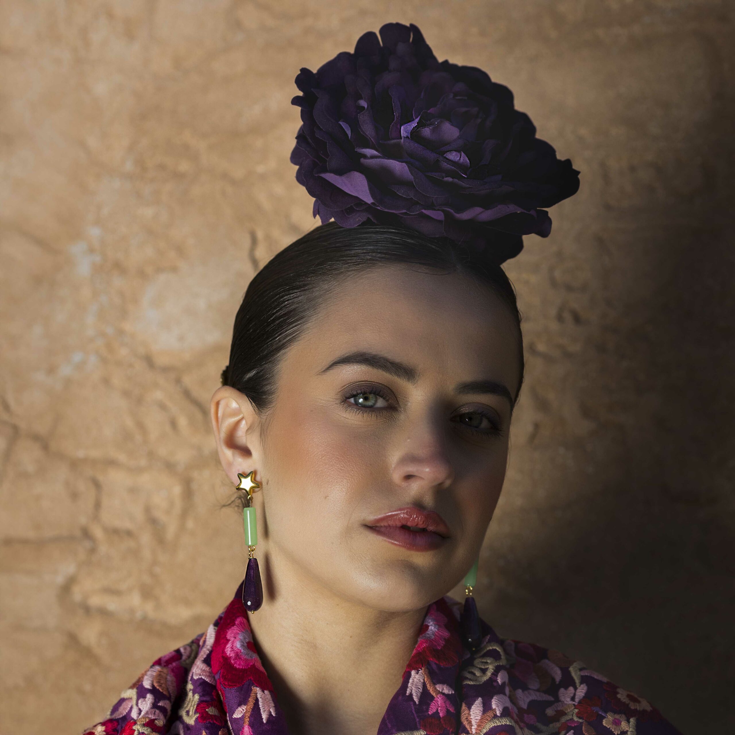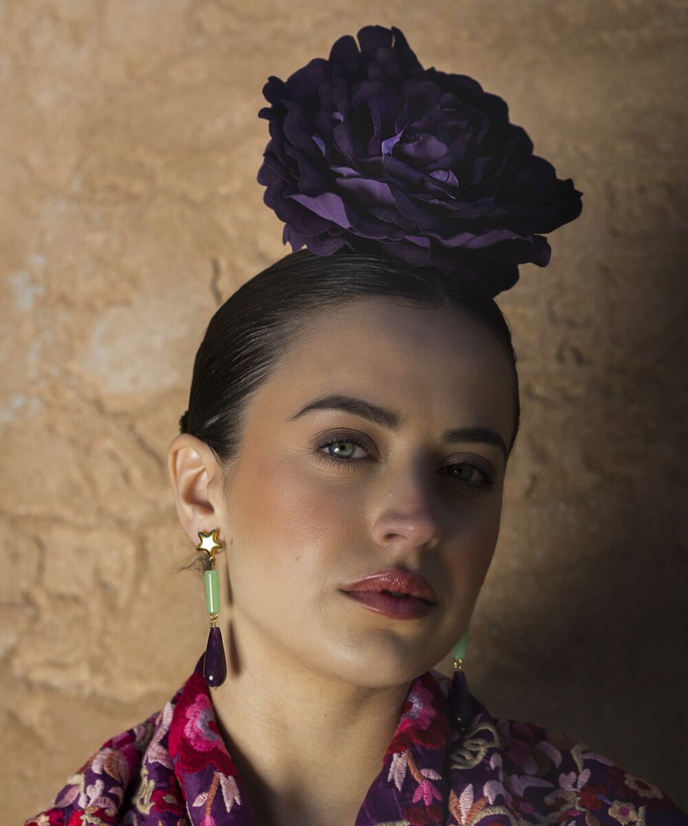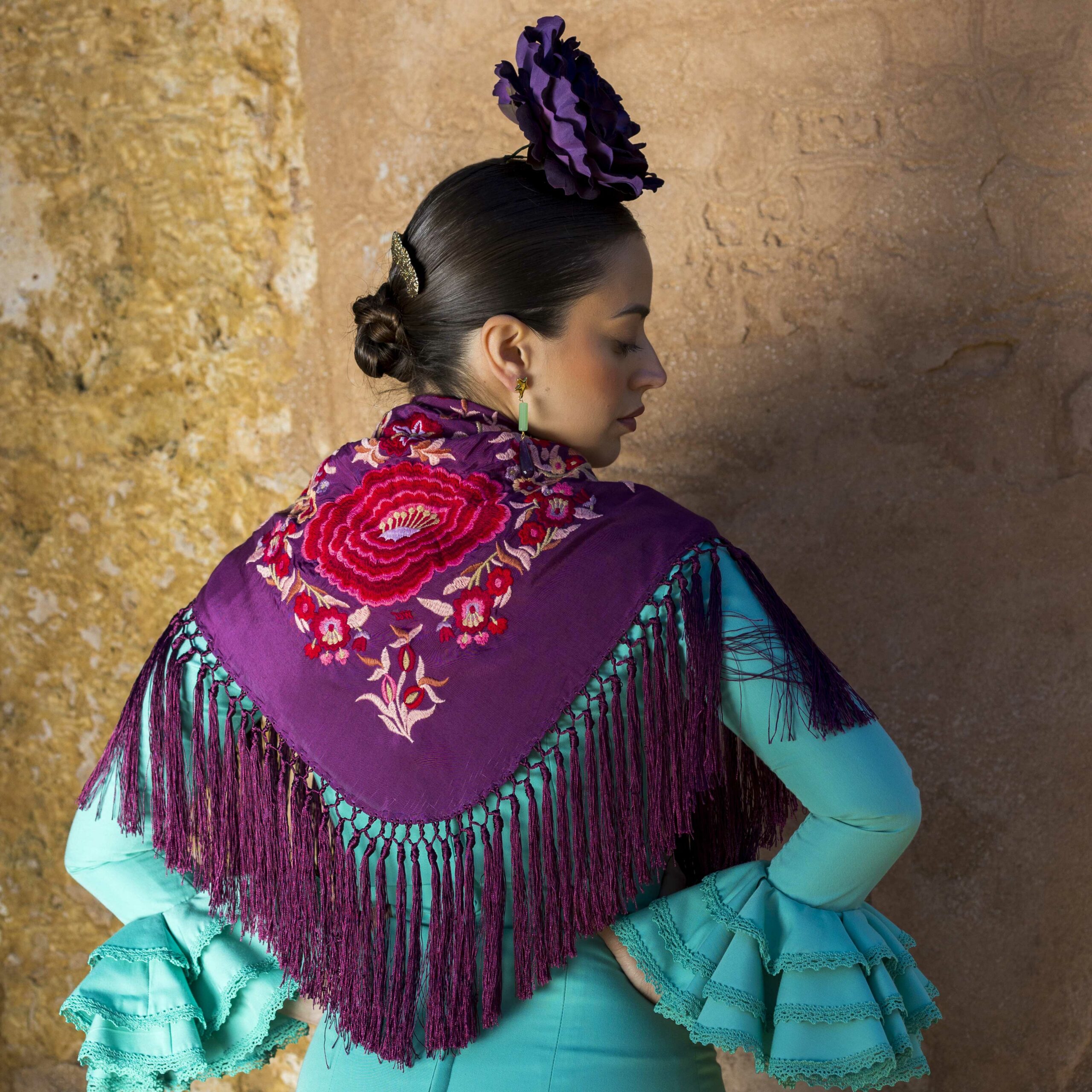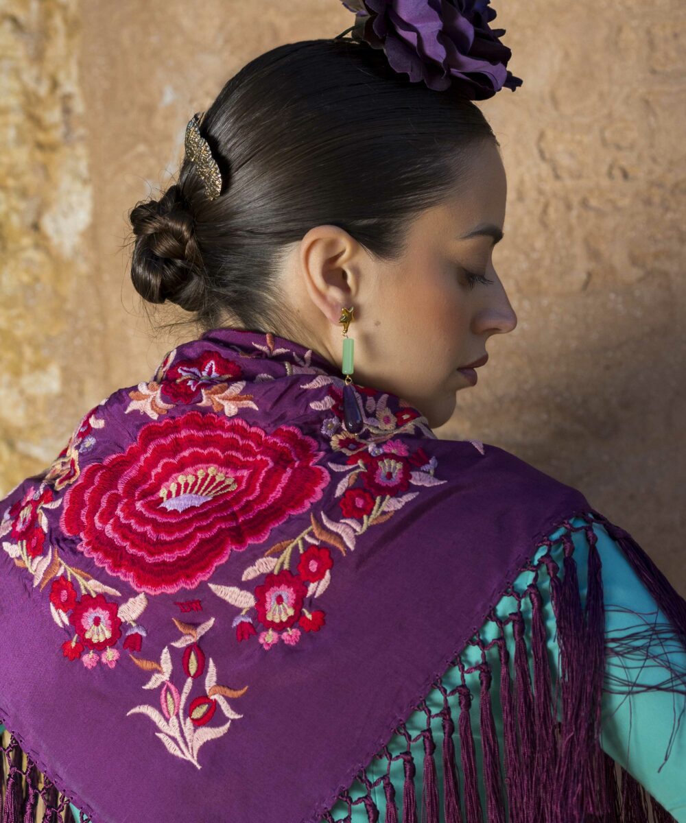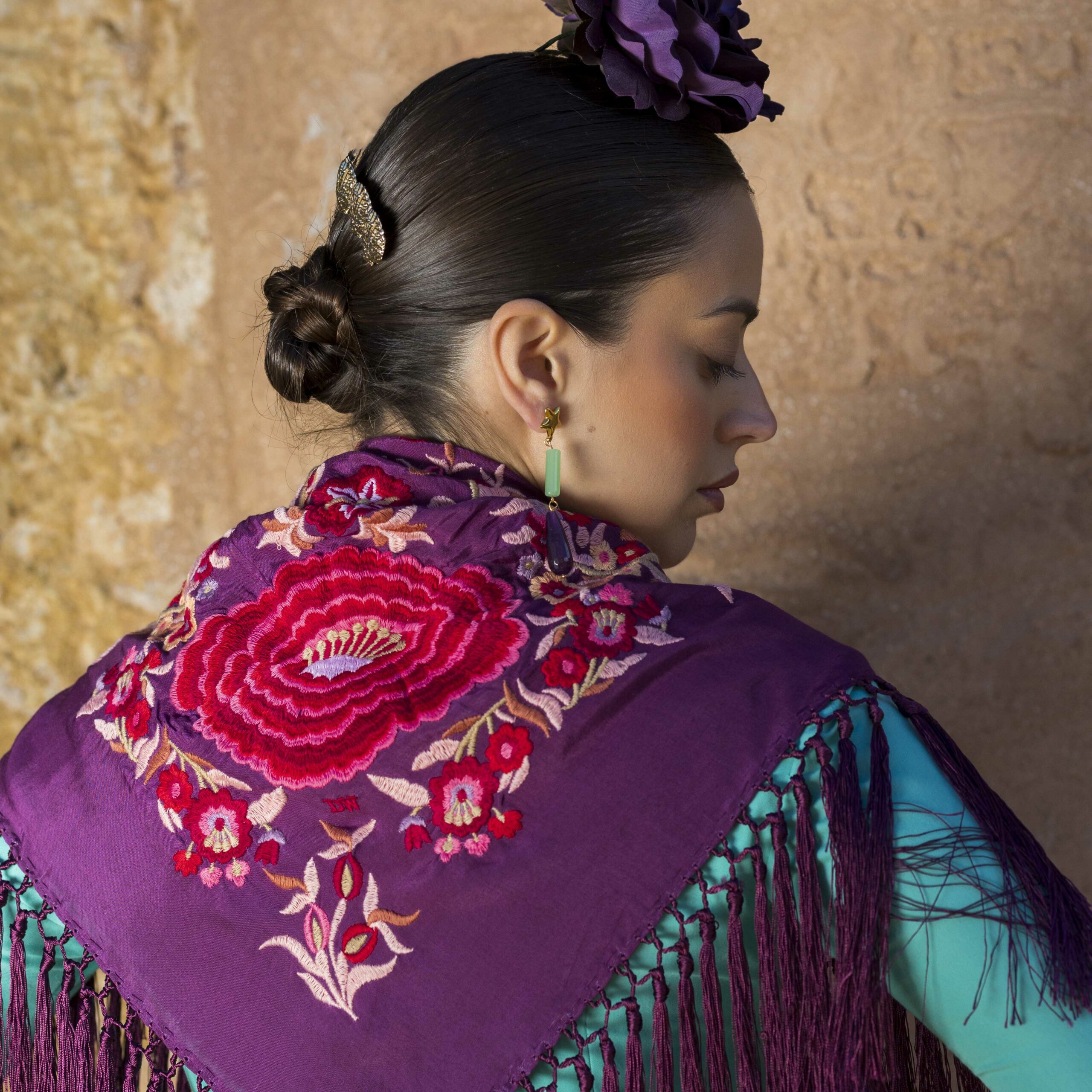 Además, no olvides explorar nuestra colección de complementos, como pendientes y peinecillos, diseñados y fabricados por nuestra marca aquí en el taller. ¡Atrévete a lucir única y elegante en la próxima feria con el Mantoncillo Lola DW en berenjena!