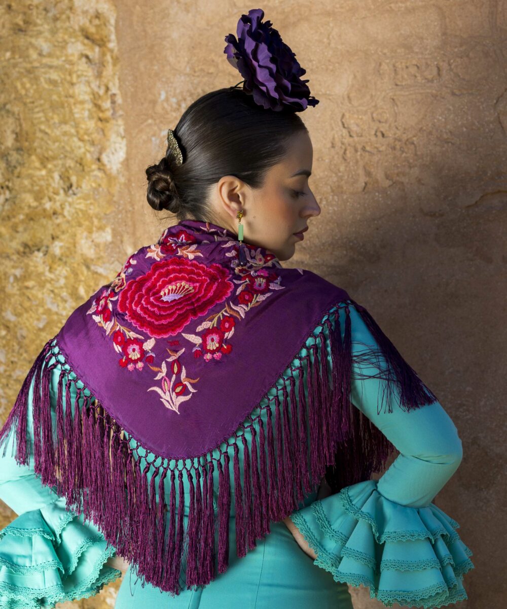 El flecado de nuestros mantones se realiza con gran destreza de forma artesanal. Además, este mantón de flamenca está bordado en varios colores, lo que le proporciona infinitas posibilidades de combinación.
