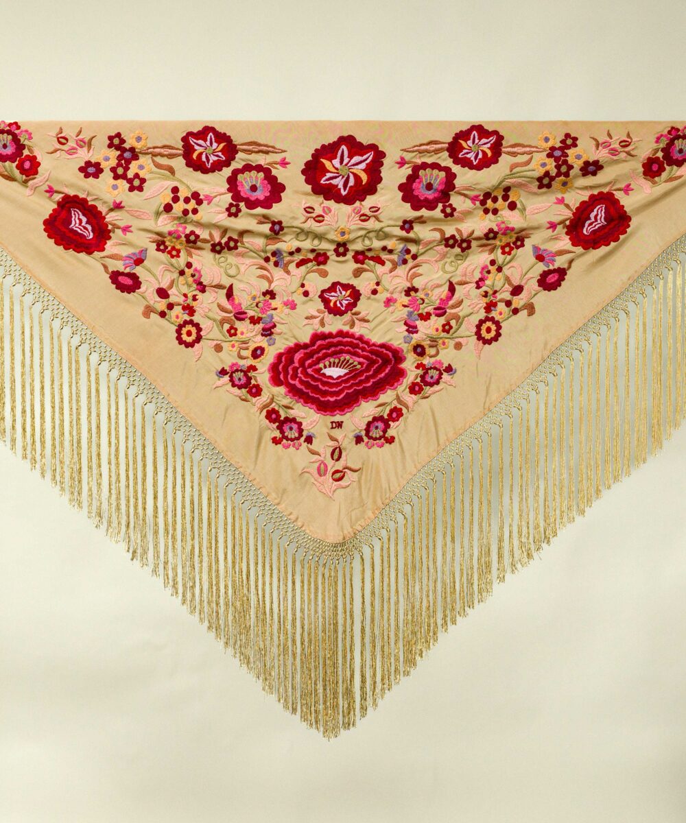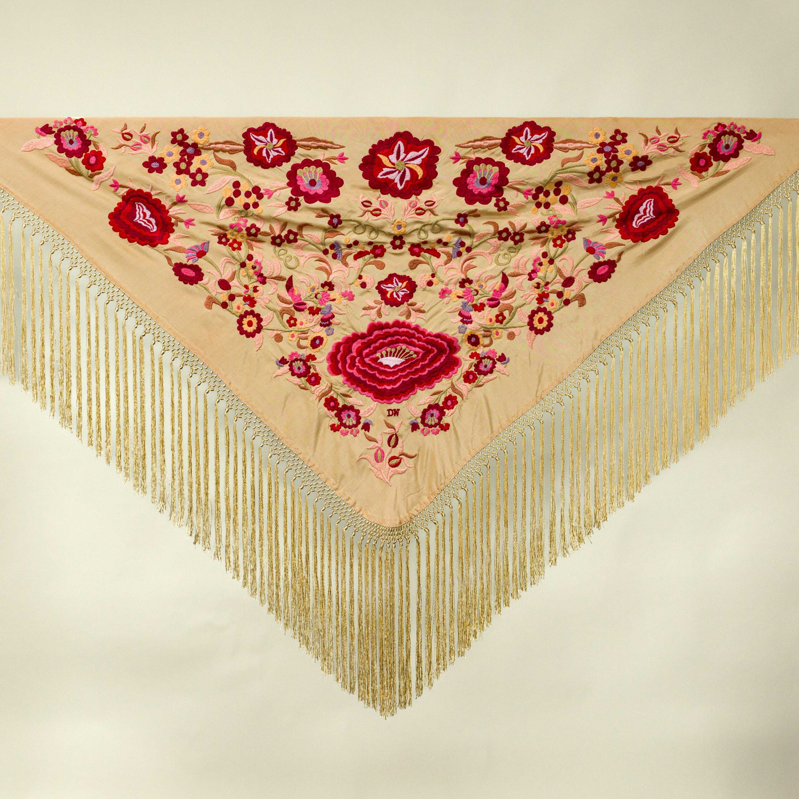 Este mantón presenta una gran cantidad de flores y ramas en la parte delantera de la seda, creando un patrón tradicional que realza la parte frontal del traje de flamenca. La parte trasera y el pico del mantón cuentan con una flor de gran tamaño y una pequeña cenefa , ofreciendo una elegancia atemporal.
