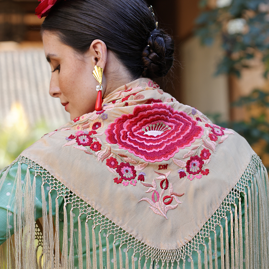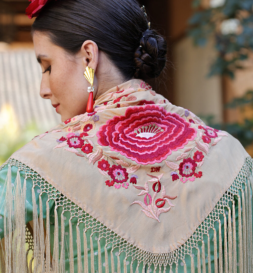 Además, no olvides explorar nuestra colección de complementos, como pendientes y peinecillos, diseñados y fabricados por nuestra marca aquí en el taller. ¡Atrévete a lucir única y elegante en la próxima feria con el Mantoncillo Lola DW en crudo!