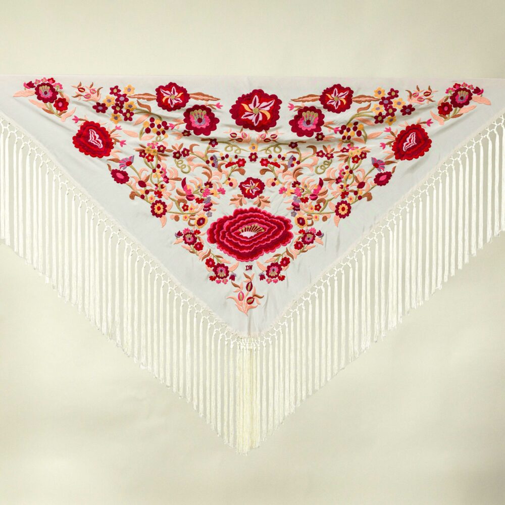 El flecado de nuestros mantones se realiza con gran destreza de forma artesanal. Además, este mantón de flamenca está bordado en varios colores, lo que le proporciona infinitas posibilidades de combinación.