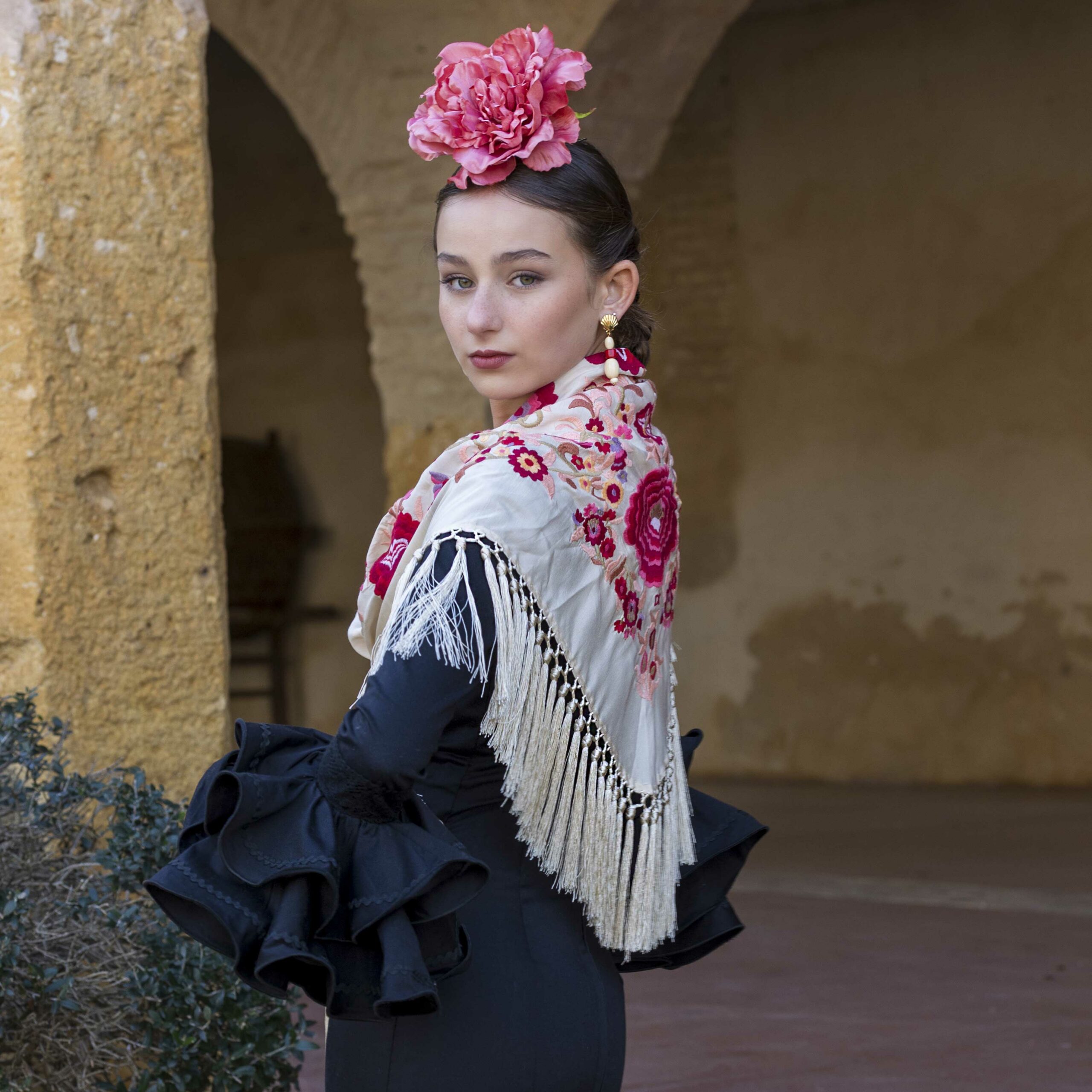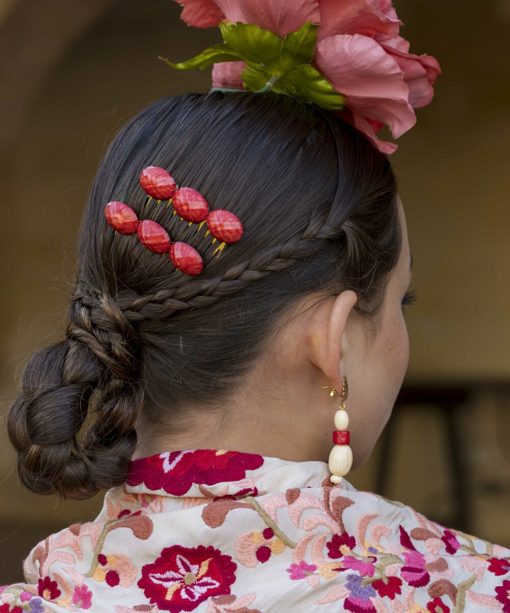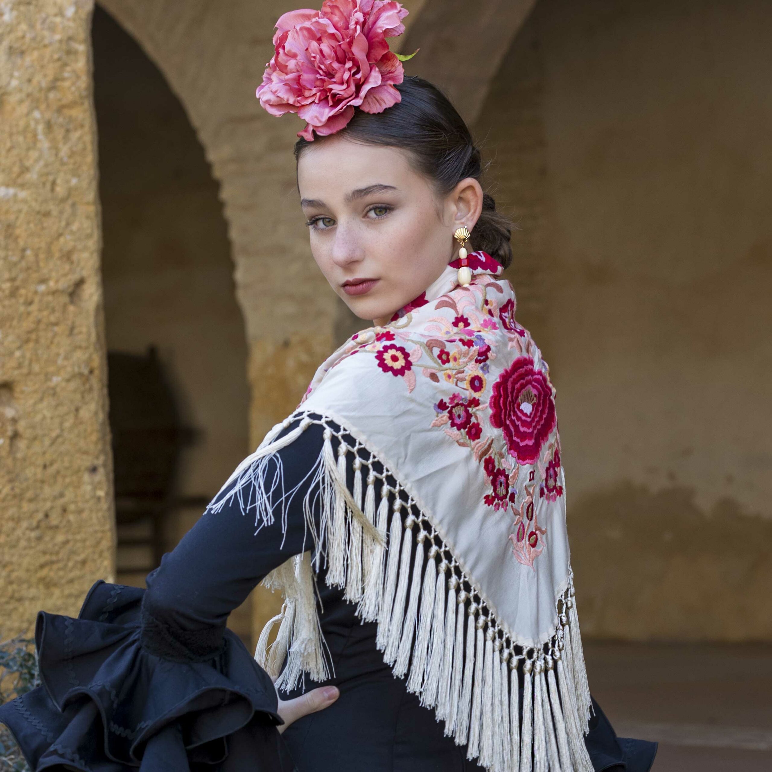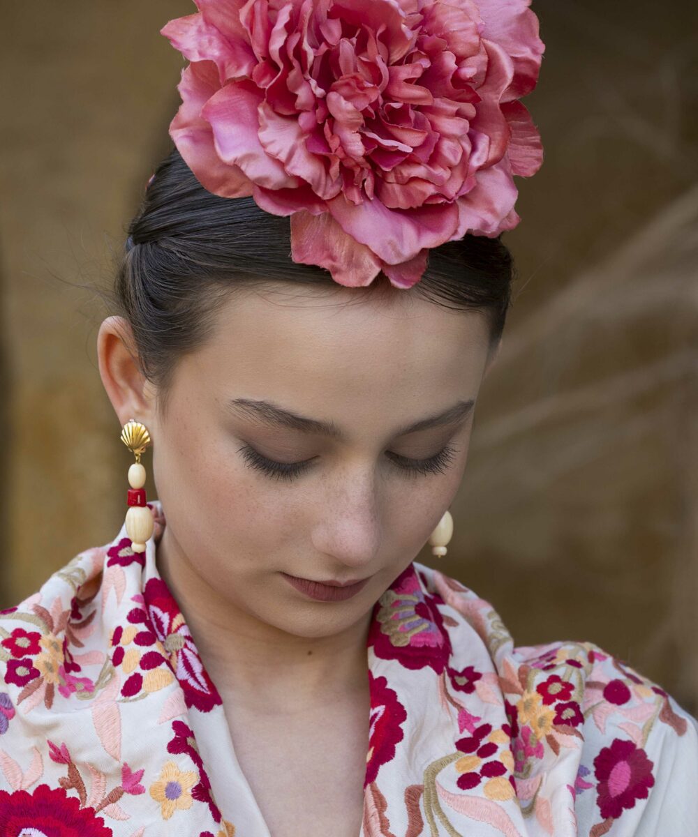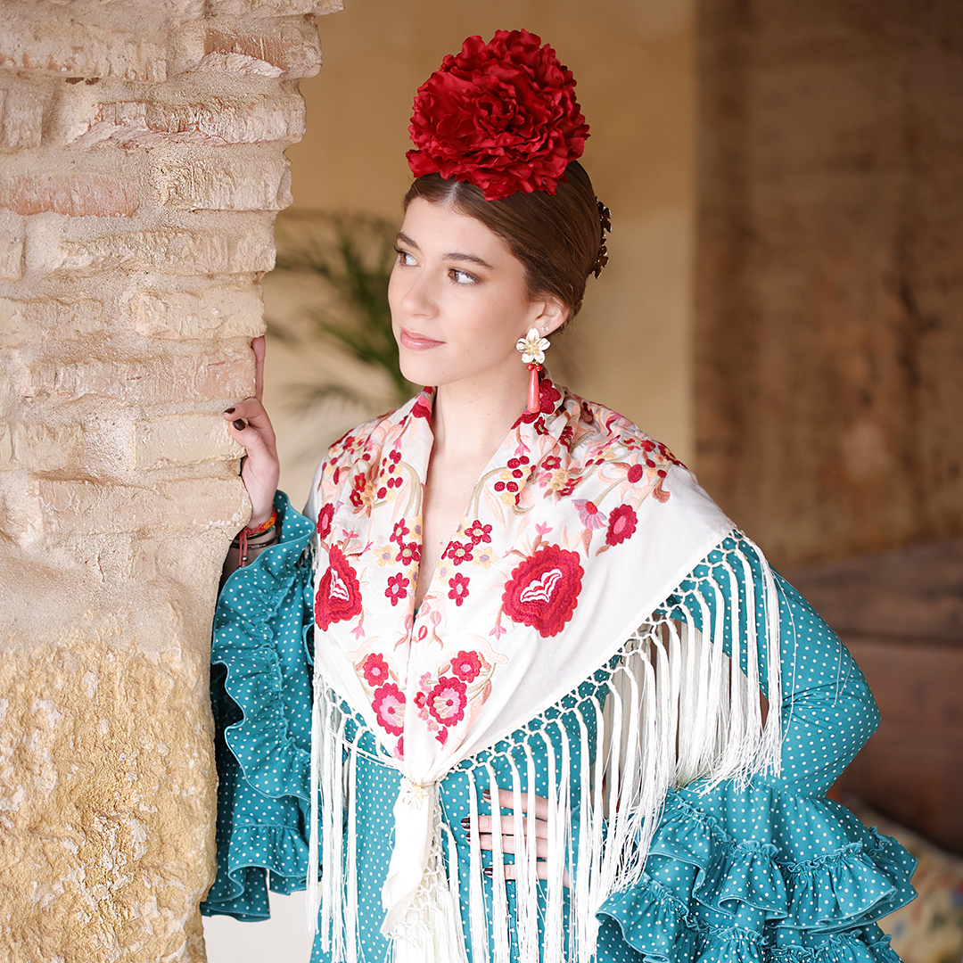 Además, no olvides explorar nuestra colección de complementos, como pendientes y peinecillos, diseñados y fabricados por nuestra marca aquí en el taller. ¡Atrévete a lucir única y elegante en la próxima feria con el Mantoncillo Lola DW en crudo!