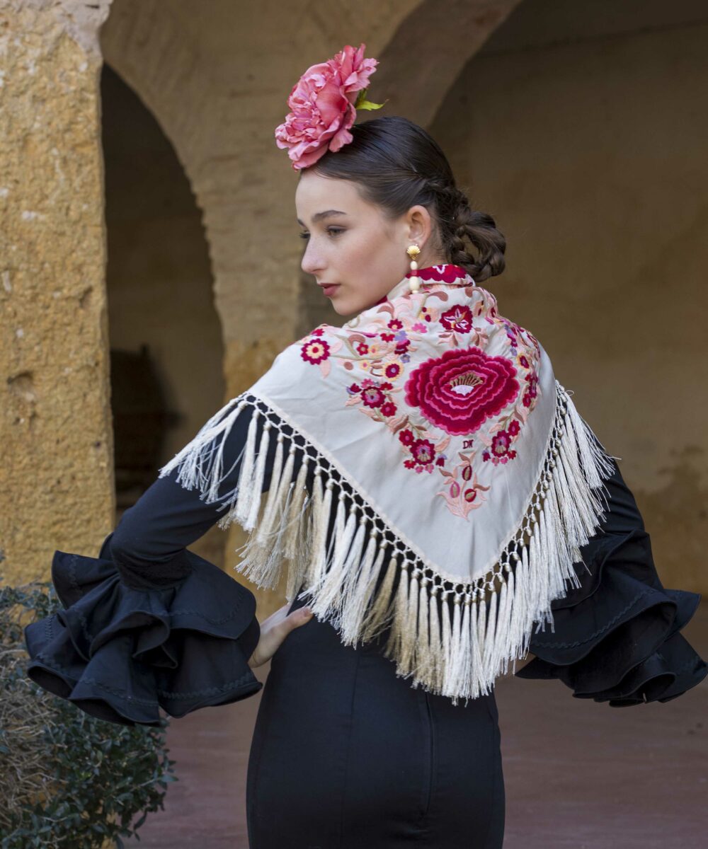 Este mantón presenta una gran cantidad de flores y ramas en la parte delantera de la seda, creando un patrón tradicional que realza la parte frontal del traje de flamenca. La parte trasera y el pico del mantón cuentan con una flor de gran tamaño y una pequeña cenefa , ofreciendo una elegancia atemporal.