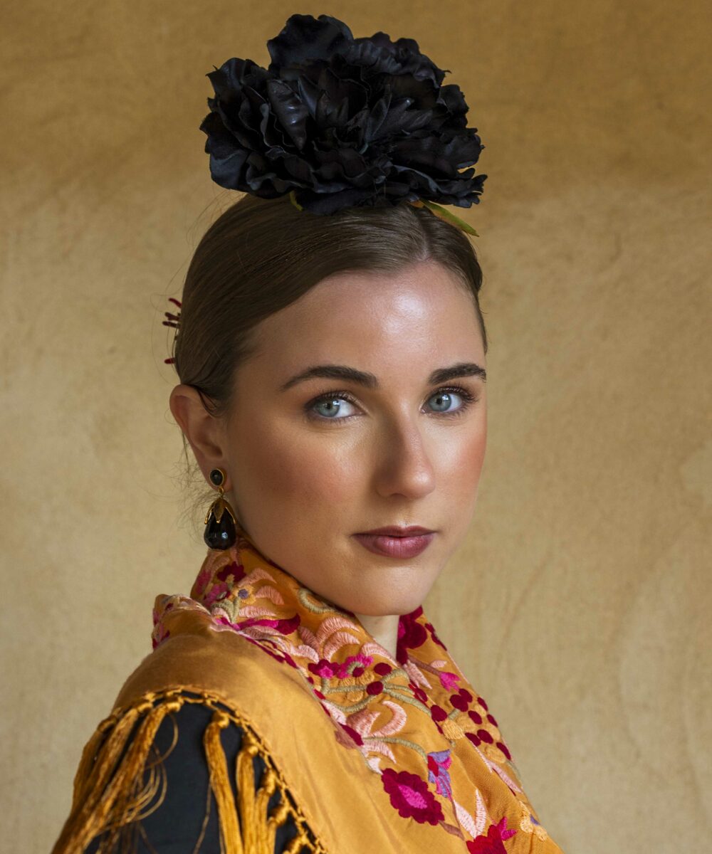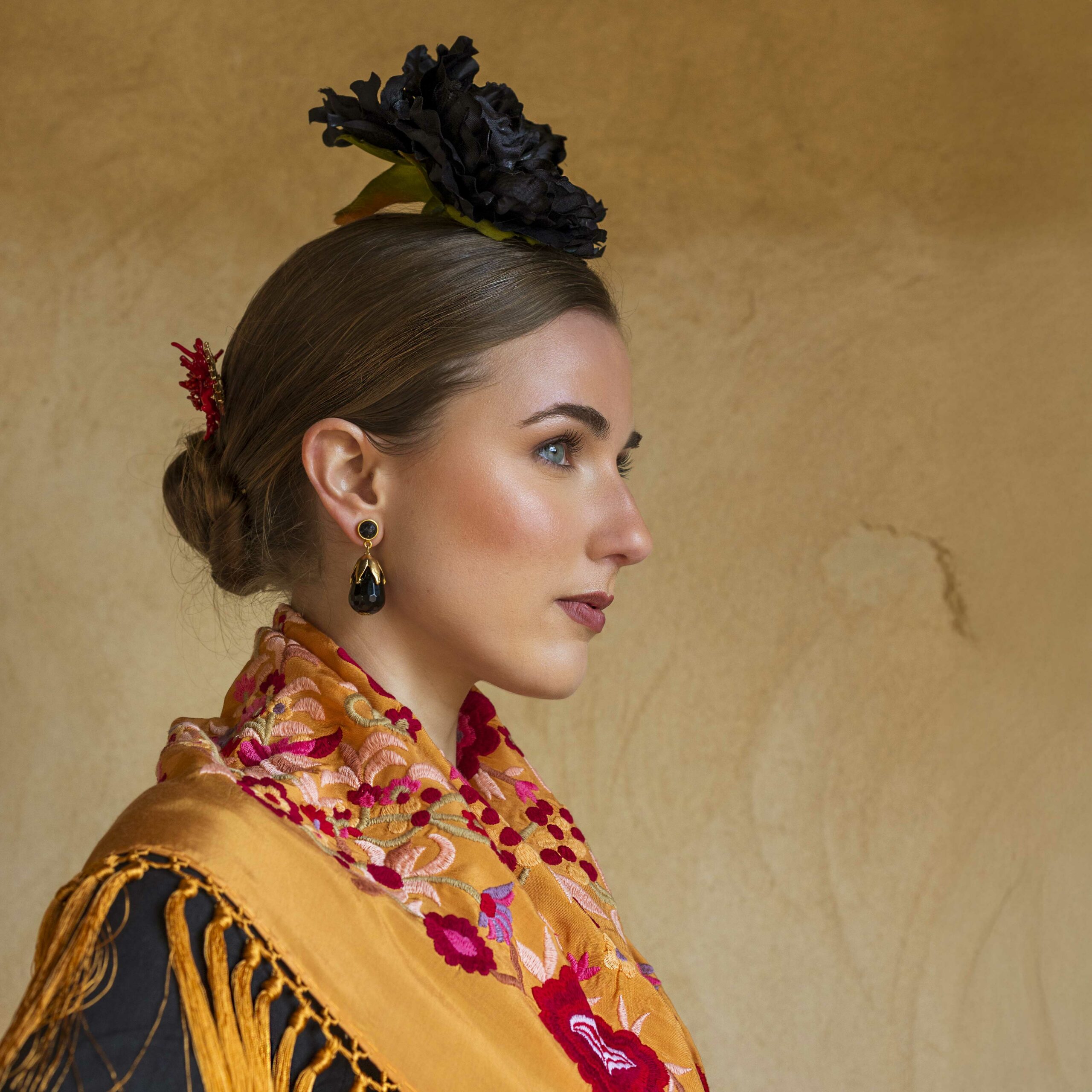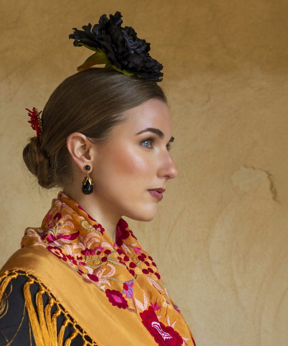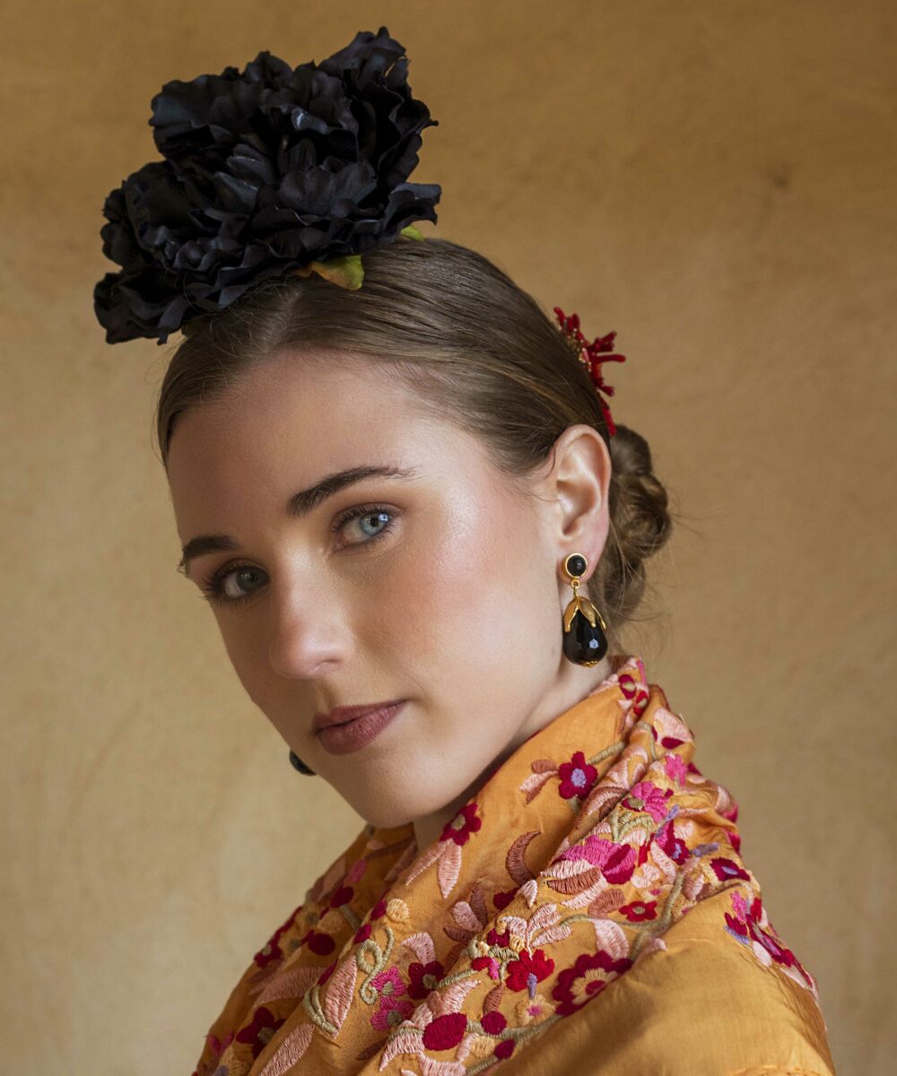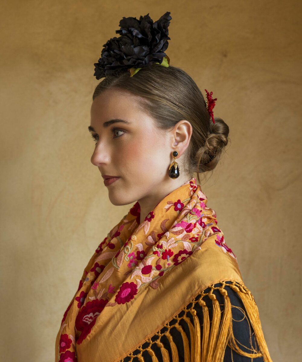 Además, no olvides explorar nuestra colección de complementos, como pendientes y peinecillos, diseñados y fabricados por nuestra marca aquí en el taller. ¡Atrévete a lucir única y elegante en la próxima feria con el Mantoncillo Lola DW en mandarina!