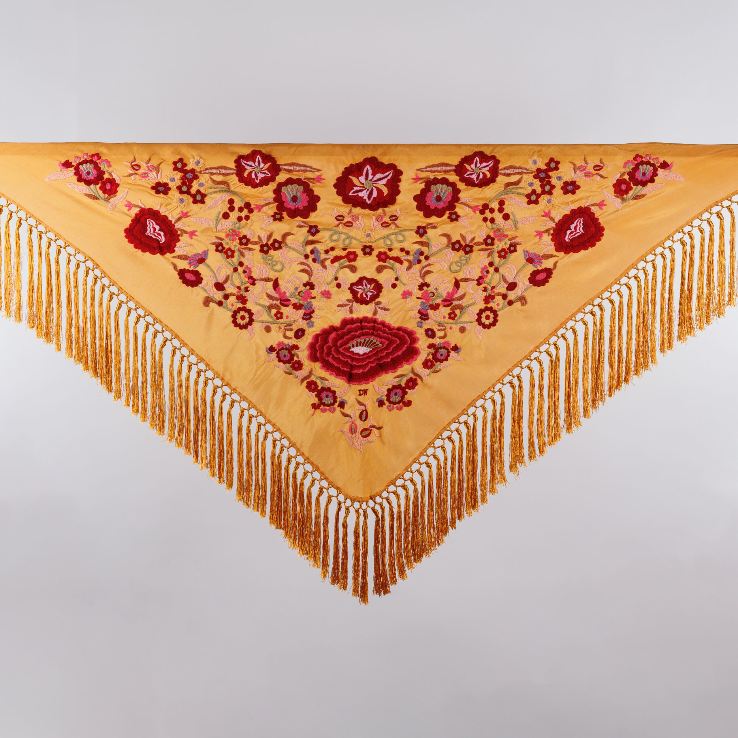 Este mantón presenta una gran cantidad de flores y ramas en la parte delantera de la seda, creando un patrón tradicional que realza la parte frontal del traje de flamenca. La parte trasera y el pico del mantón cuentan con una flor de gran tamaño y una pequeña cenefa , ofreciendo una elegancia atemporal.