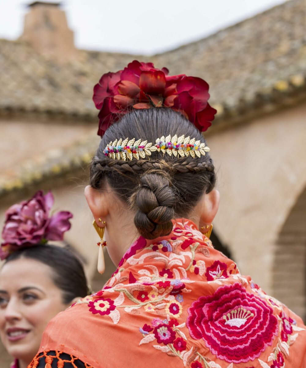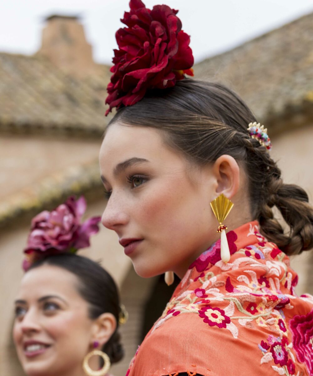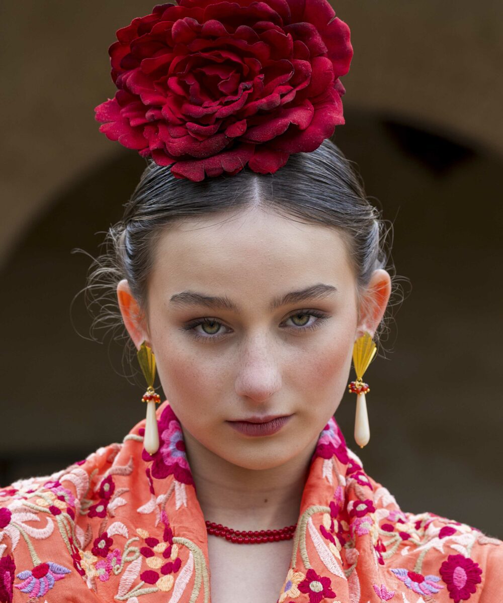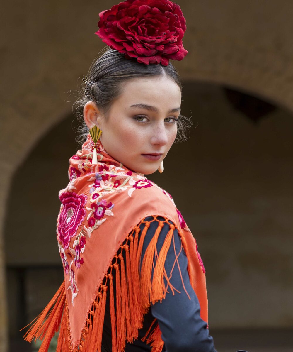 Además, no olvides explorar nuestra colección de complementos, como pendientes y peinecillos, diseñados y fabricados por nuestra marca aquí en el taller. ¡Atrévete a lucir única y elegante en la próxima feria con el Mantoncillo Lola DW en naranja!