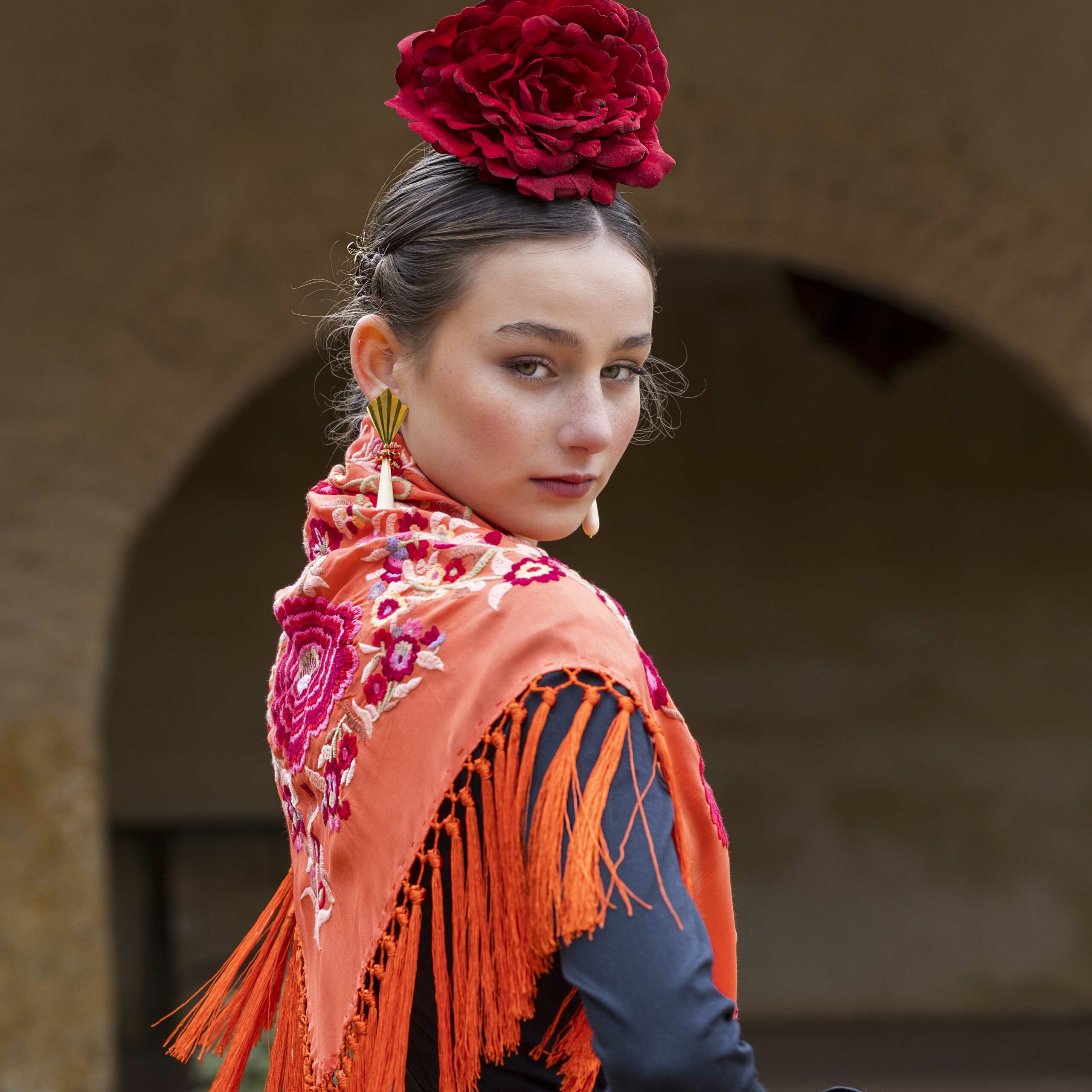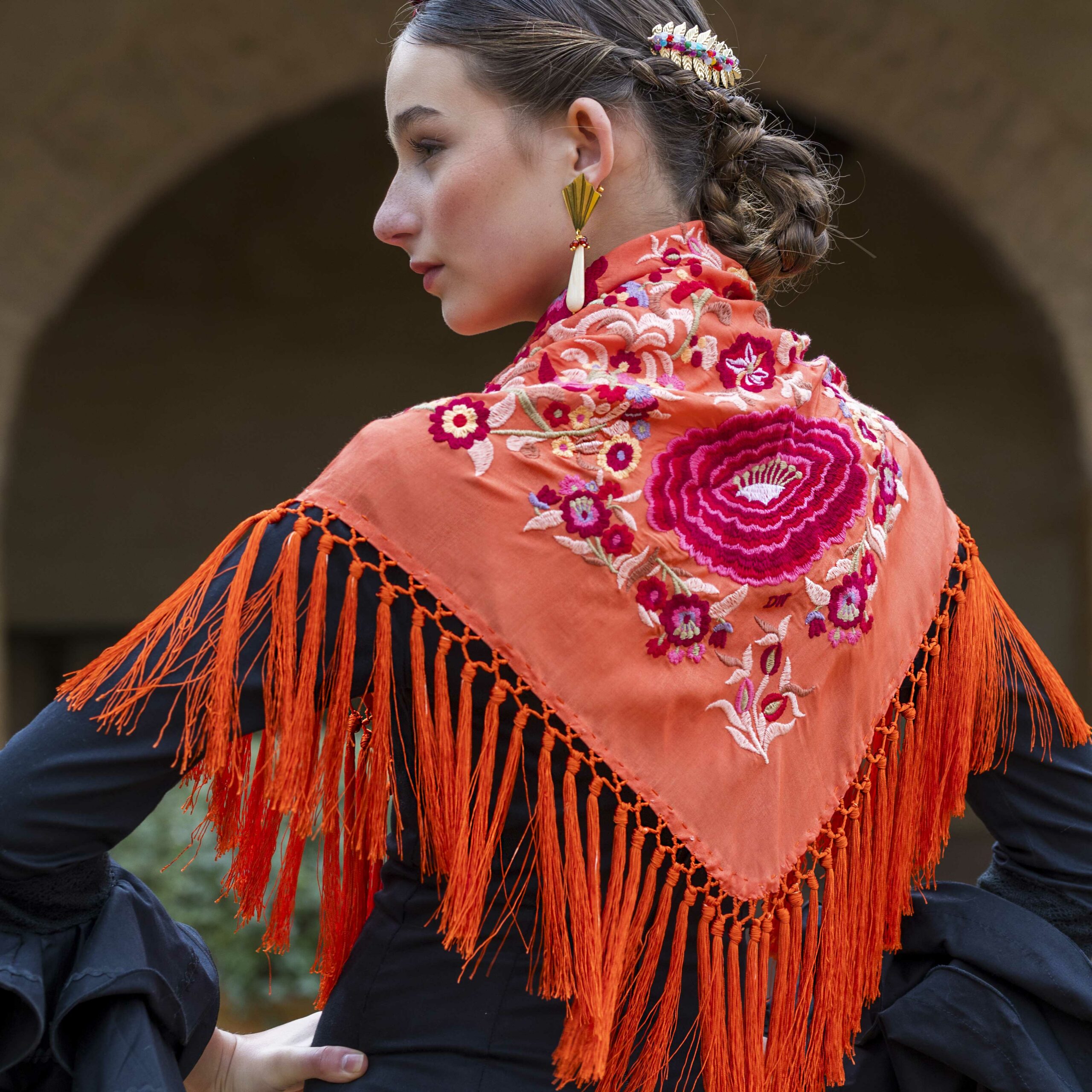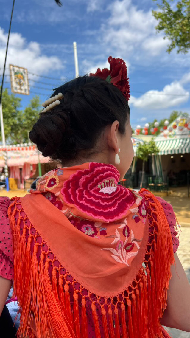 Además, no olvides explorar nuestra colección de complementos, como pendientes y peinecillos, diseñados y fabricados por nuestra marca aquí en el taller. ¡Atrévete a lucir única y elegante en la próxima feria con el Mantoncillo Lola DW en naranja!