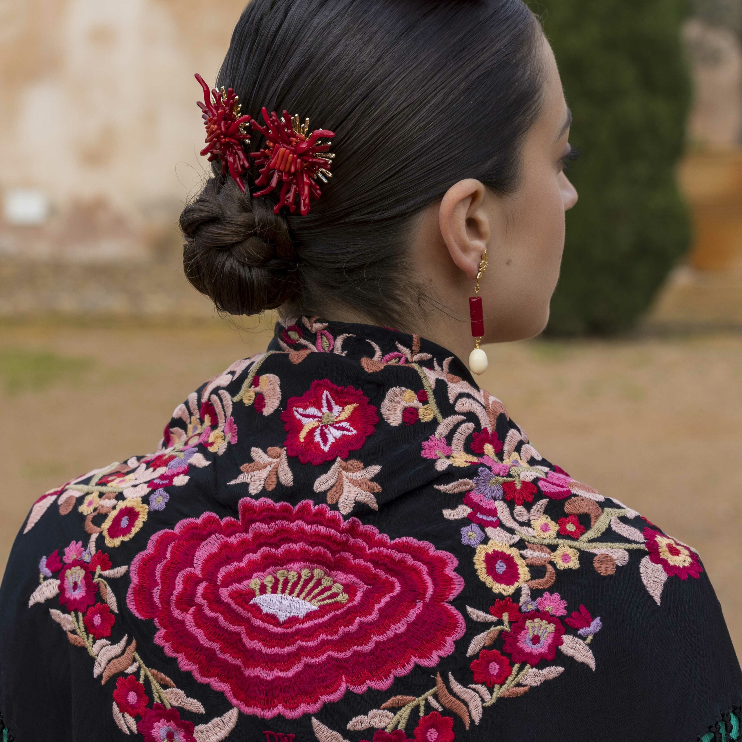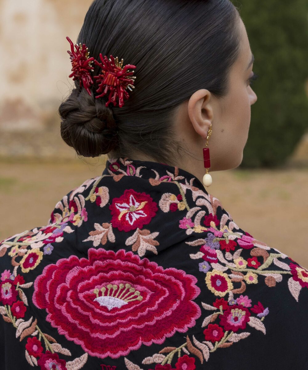 Además, no olvides explorar nuestra colección de complementos, como pendientes y peinecillos, diseñados y fabricados por nuestra marca aquí en el taller. ¡Atrévete a lucir única y elegante en la próxima feria con el Mantoncillo Lola DW en negro!