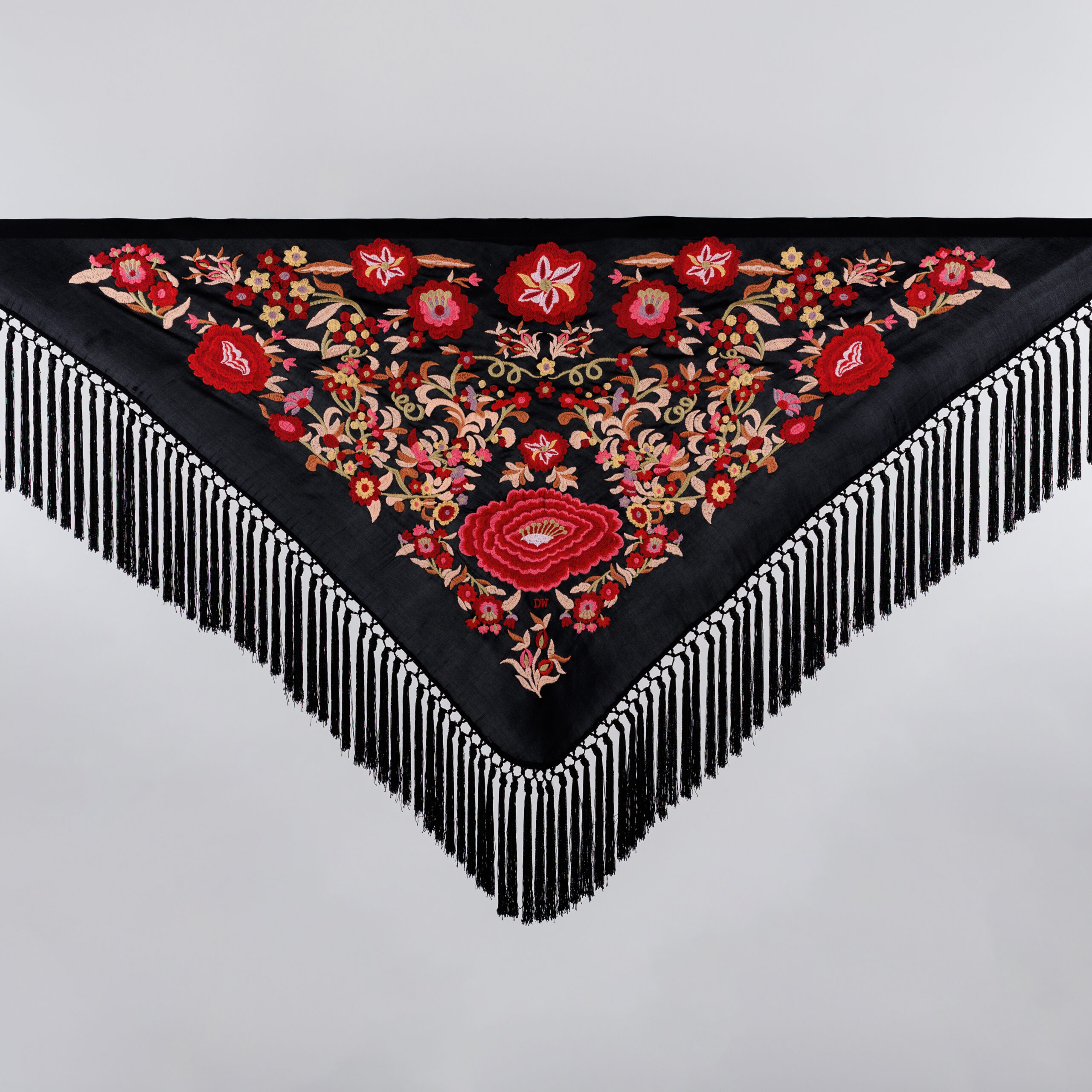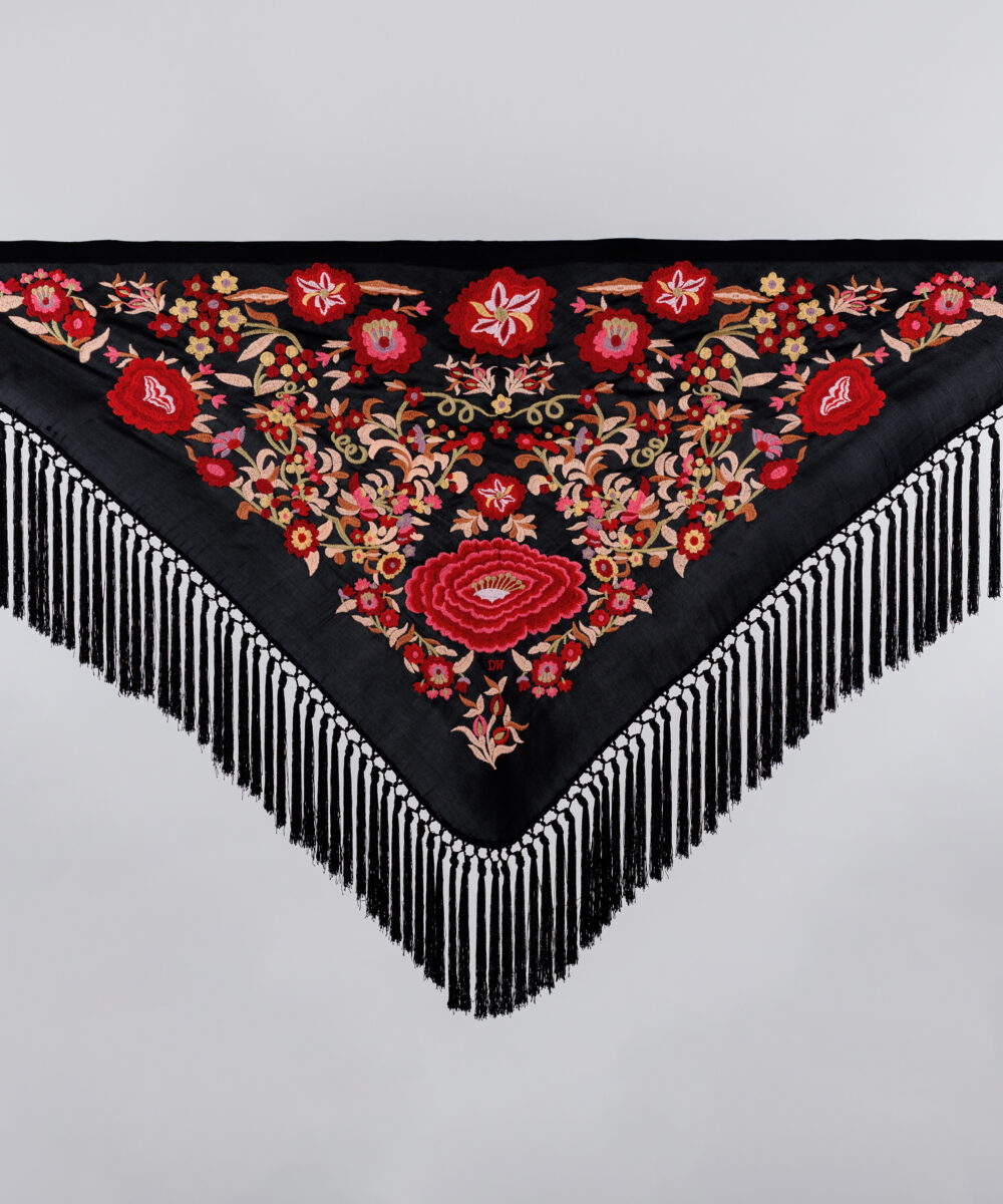 El flecado de nuestros mantones se realiza con gran destreza de forma artesanal. Además, este mantón de flamenca está bordado en varios colores, lo que le proporciona infinitas posibilidades de combinación.