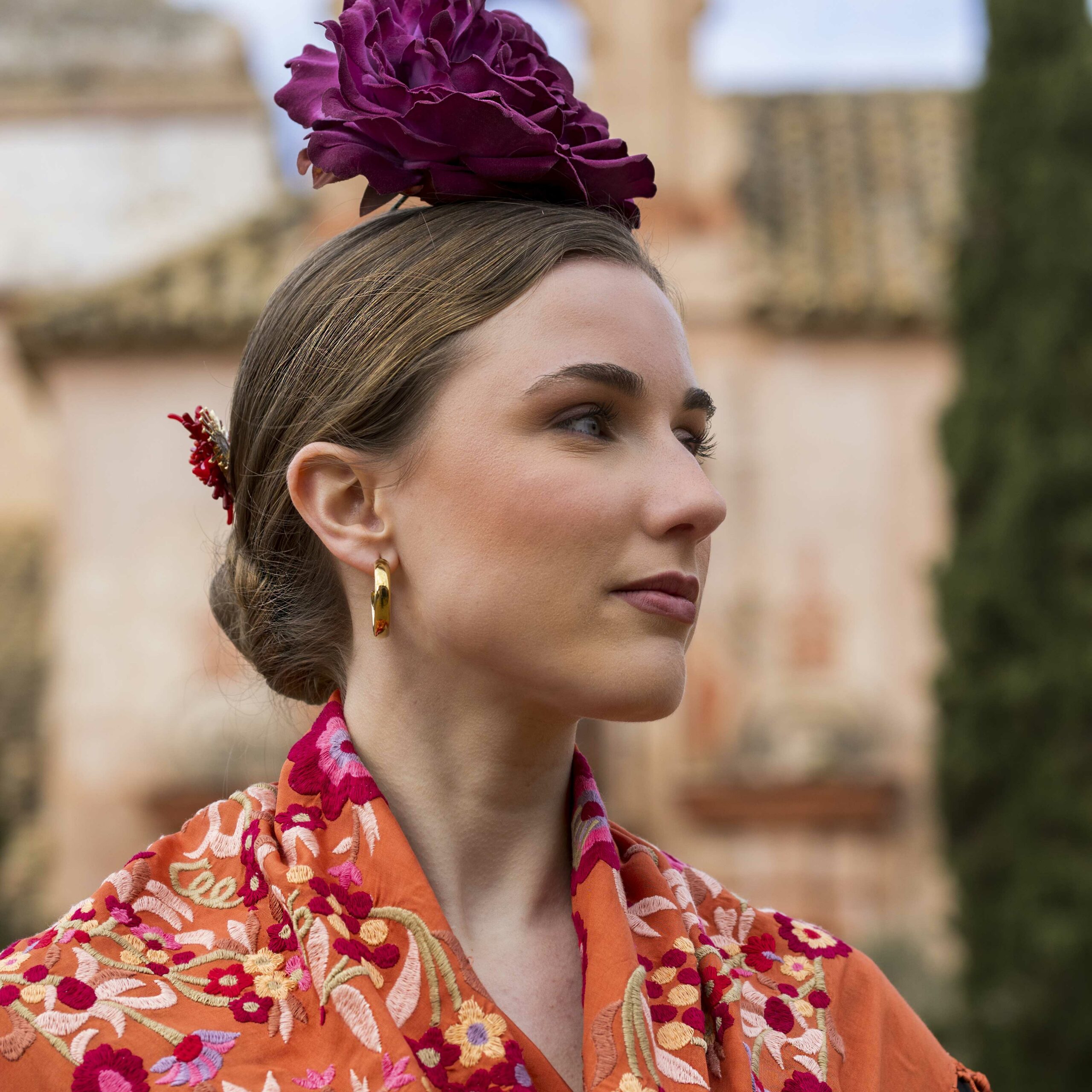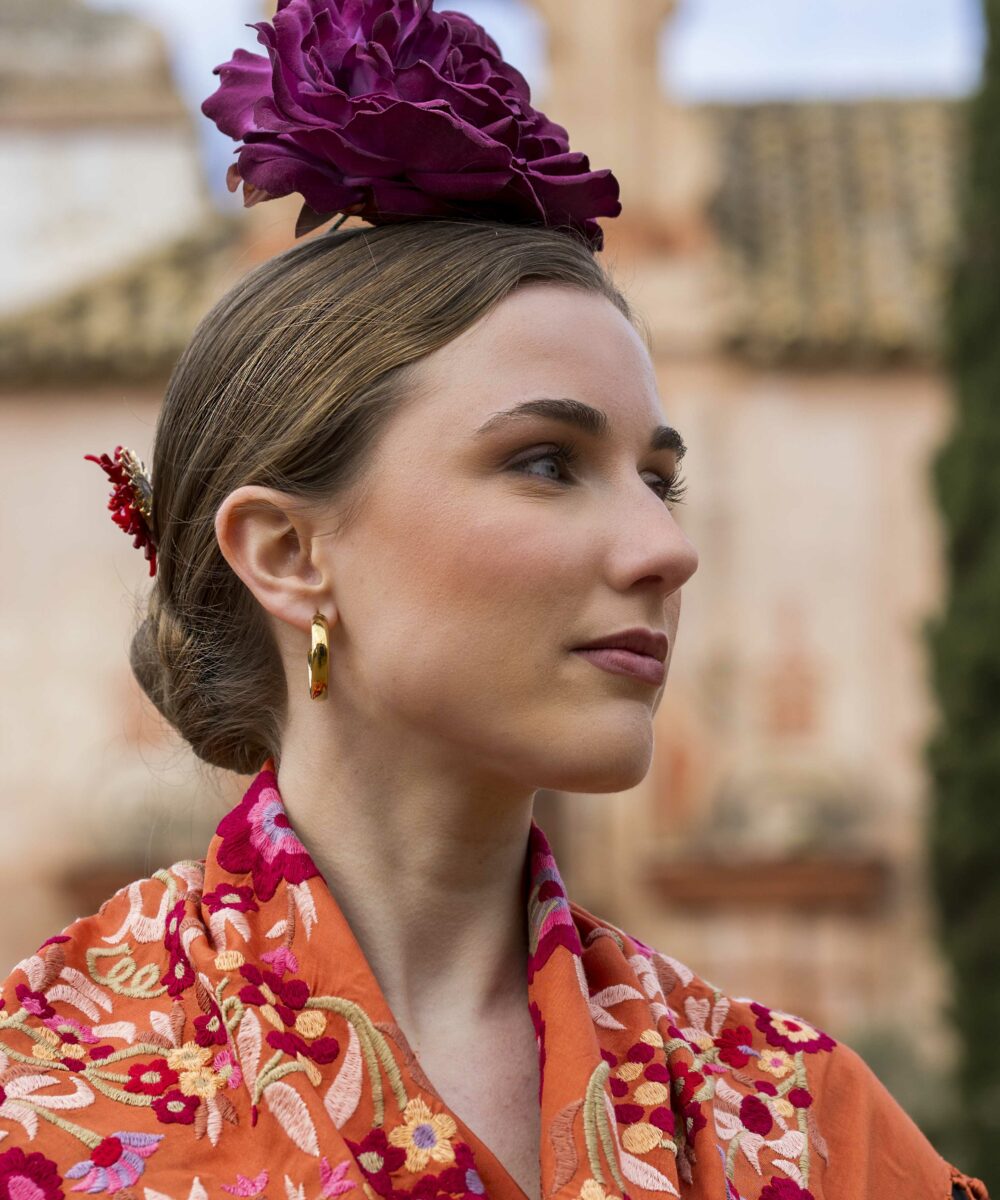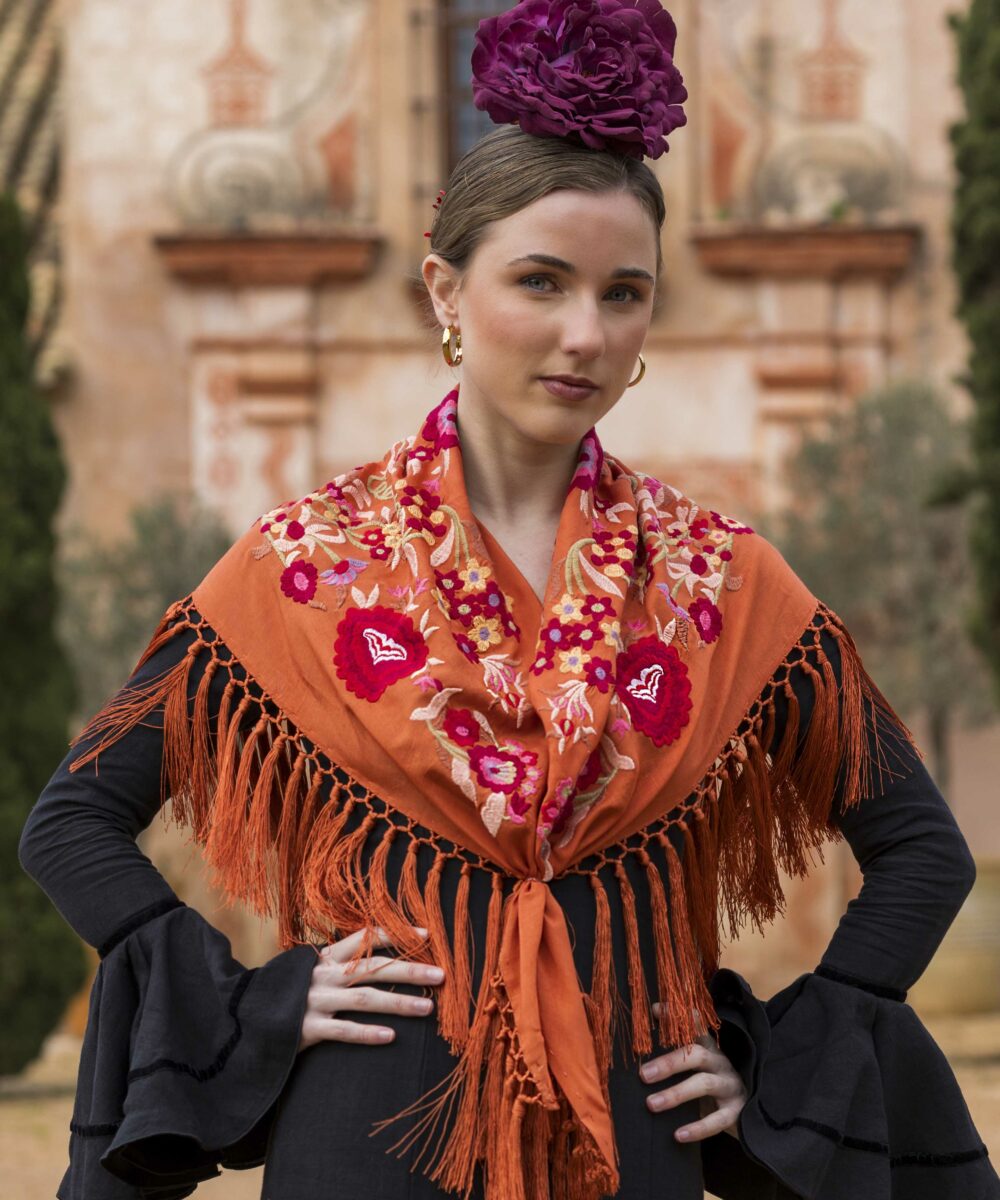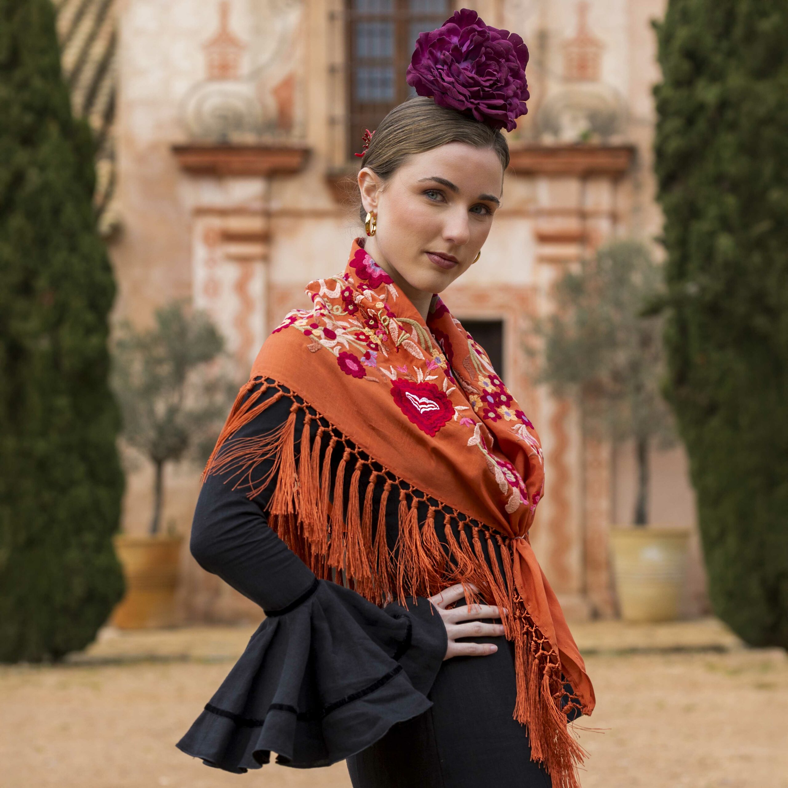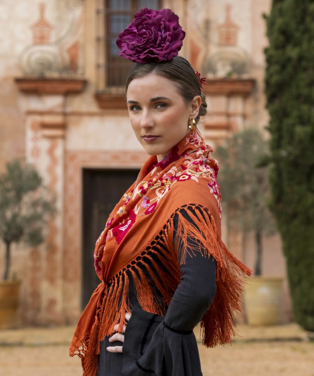 Además, no olvides explorar nuestra colección de complementos, como pendientes y peinecillos, diseñados y fabricados por nuestra marca aquí en el taller. ¡Atrévete a lucir única y elegante en la próxima feria con el Mantoncillo Lola DW en teja!