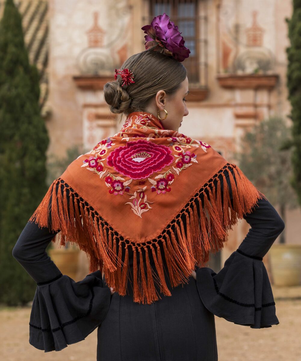 El flecado de nuestros mantones se realiza con gran destreza de forma artesanal. Además, este mantón de flamenca está bordado en varios colores, lo que le proporciona infinitas posibilidades de combinación.