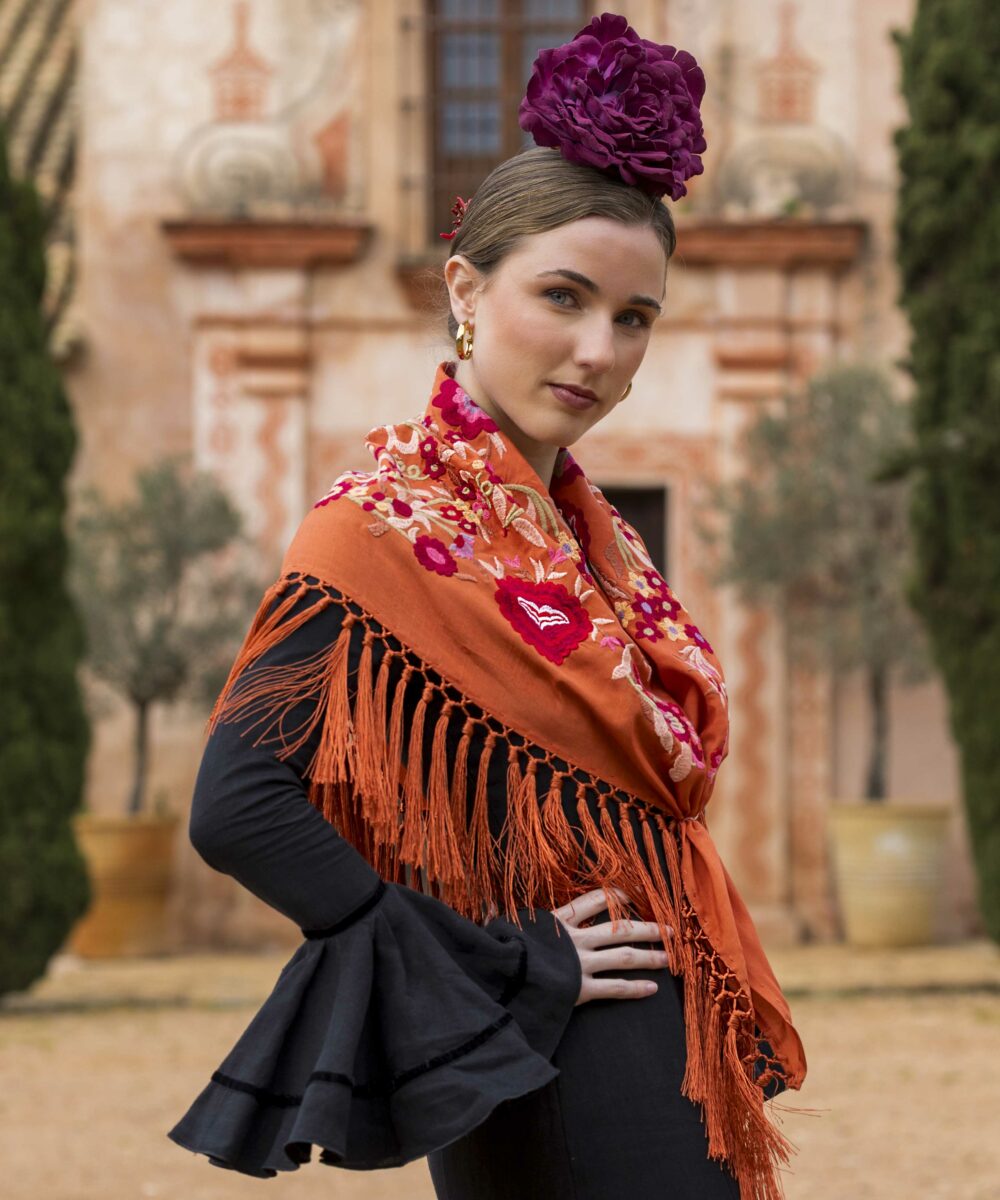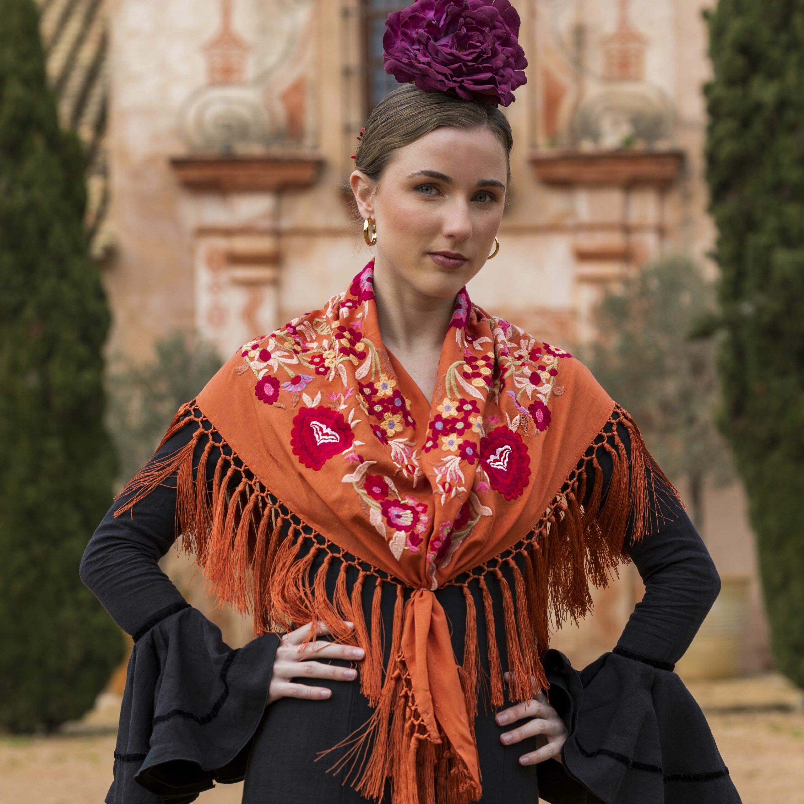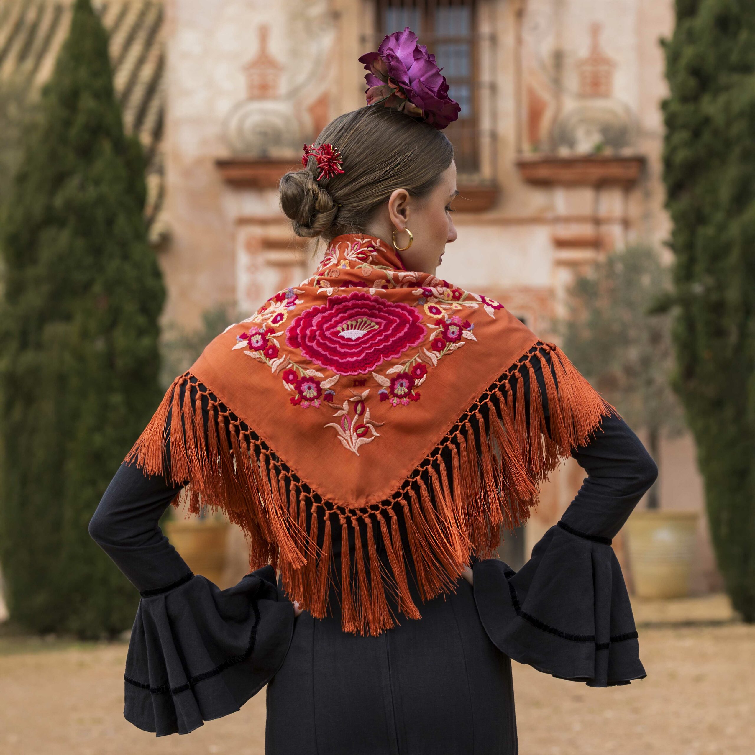 ¡Te presentamos el Mantoncillo Lola DW en color teja  de Darwin Collection! Este cautivador mantón es uno de los modelos exclusivos diseñados para la Colección de Feria 2025 y está disponible en unidades limitadas, lo que lo convierte en una joya única.