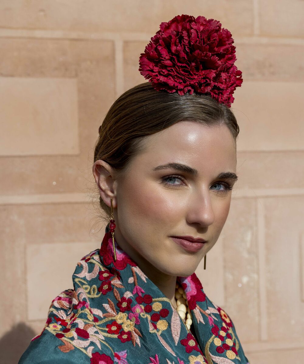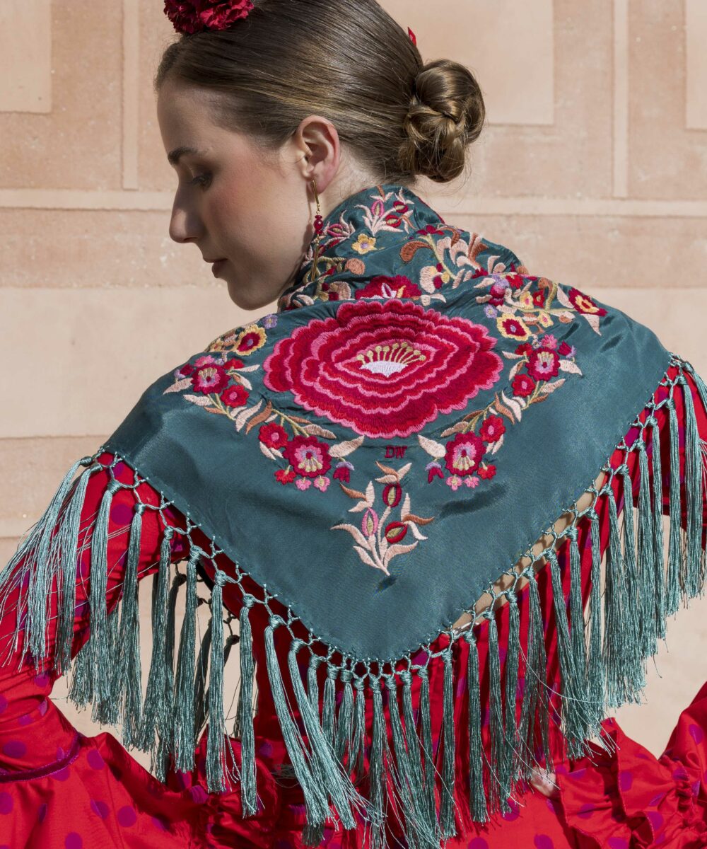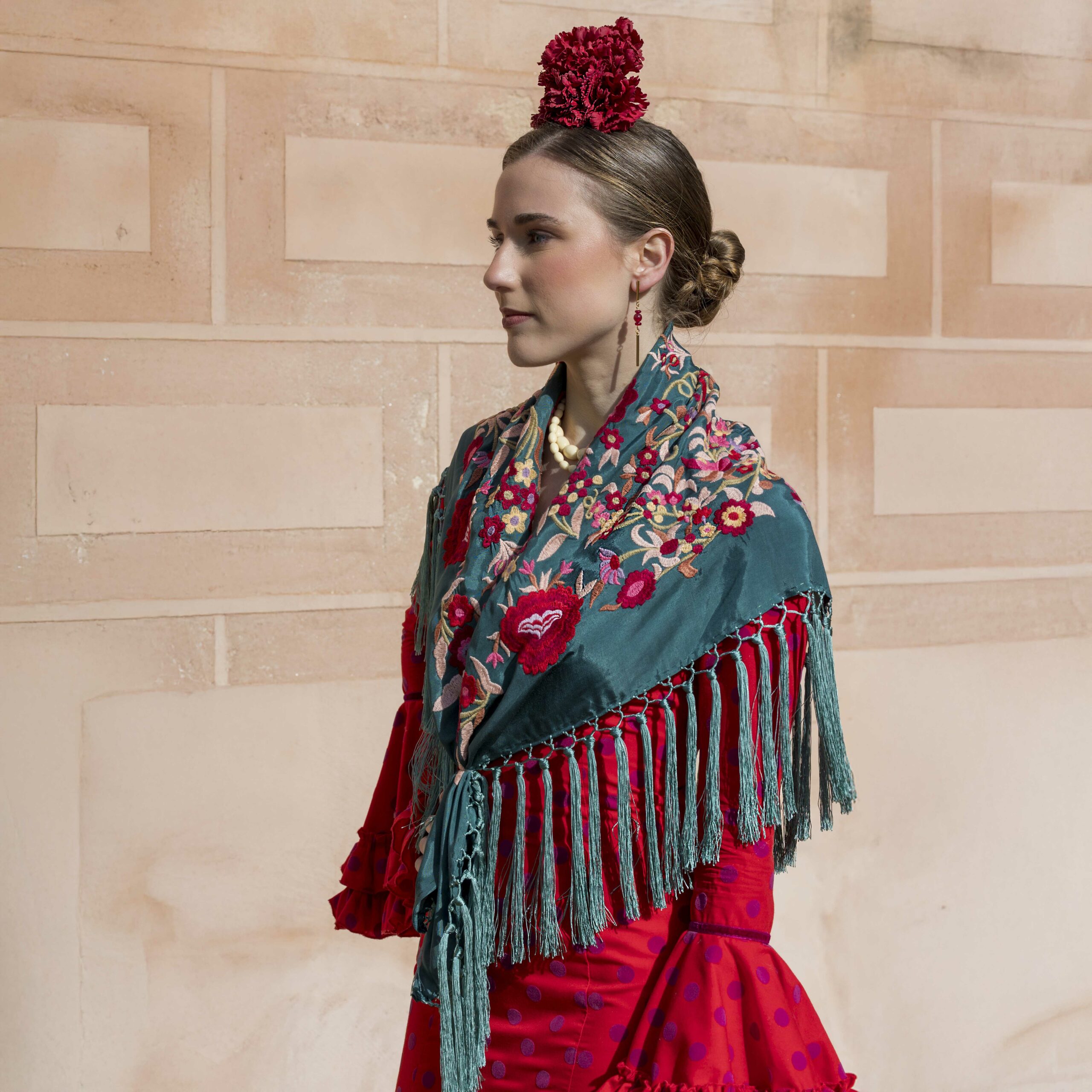 Además, no olvides explorar nuestra colección de complementos, como pendientes y peinecillos, diseñados y fabricados por nuestra marca aquí en el taller. ¡Atrévete a lucir única y elegante en la próxima feria con el Mantoncillo Lola DW en verde petróleo!