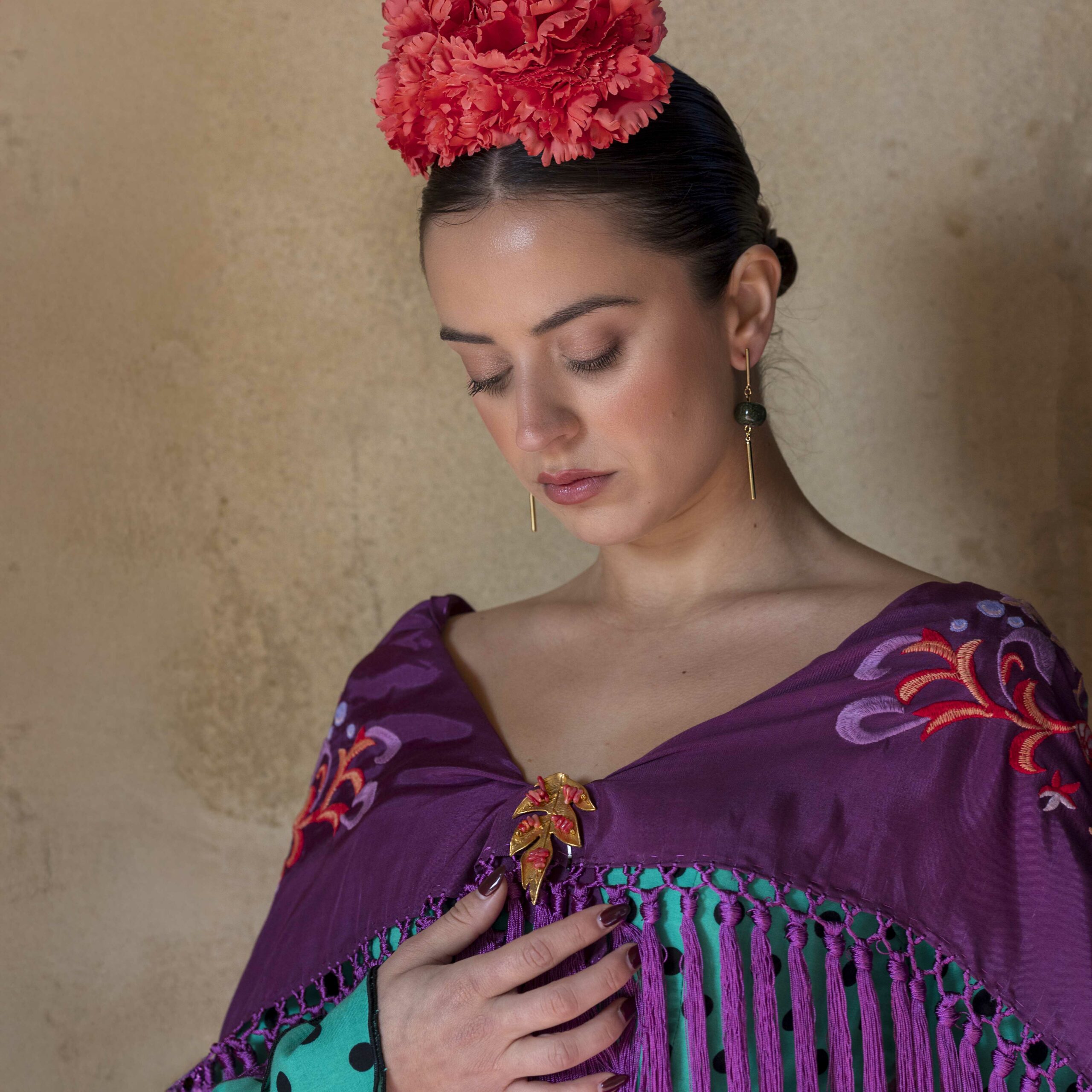 Además, explora nuestra colección de complementos, como pendientes y peinecillos, diseñados y fabricados por nuestra marca aquí en el taller. ¡Atrévete a lucir única y elegante en la próxima feria con el Mantoncillo Mar DW !