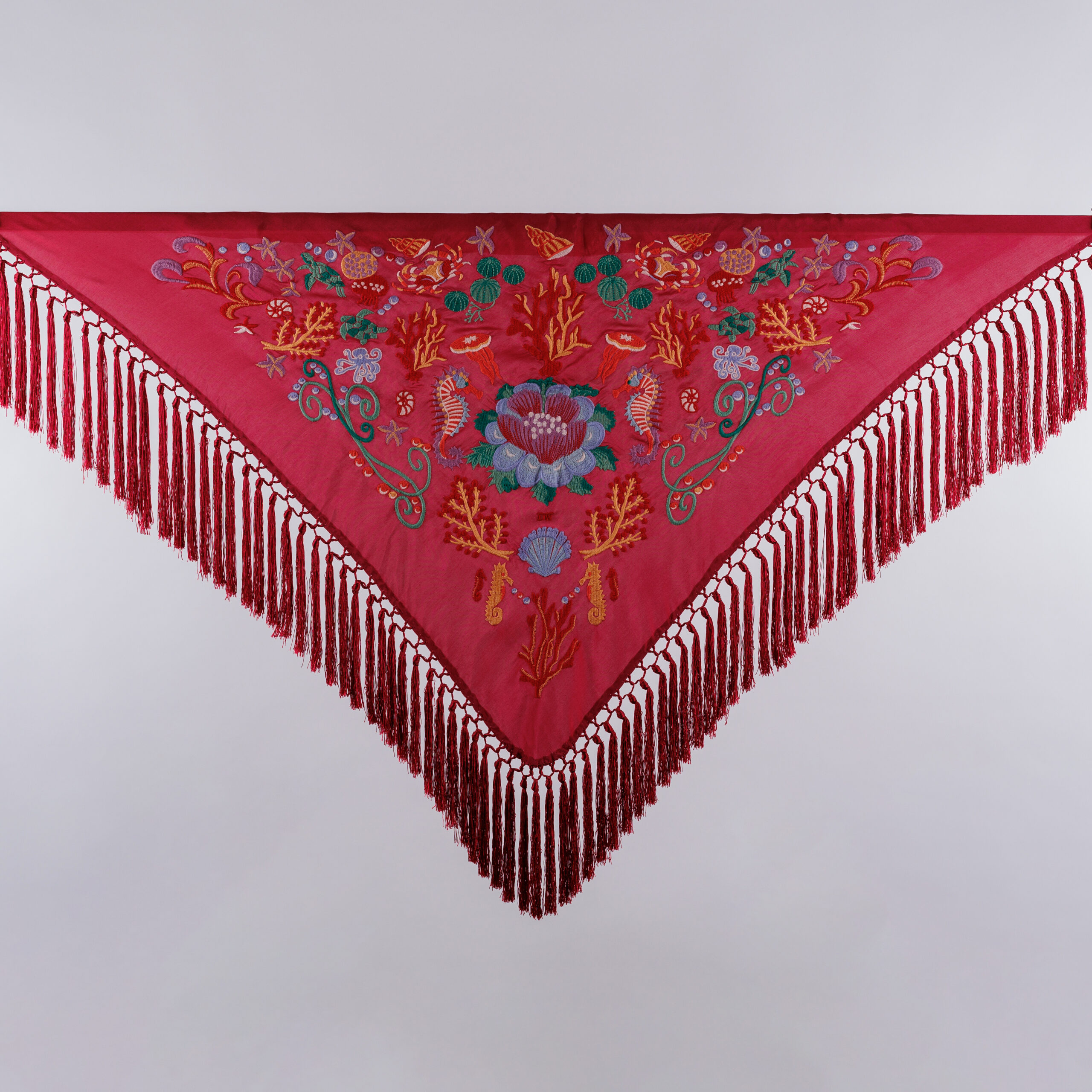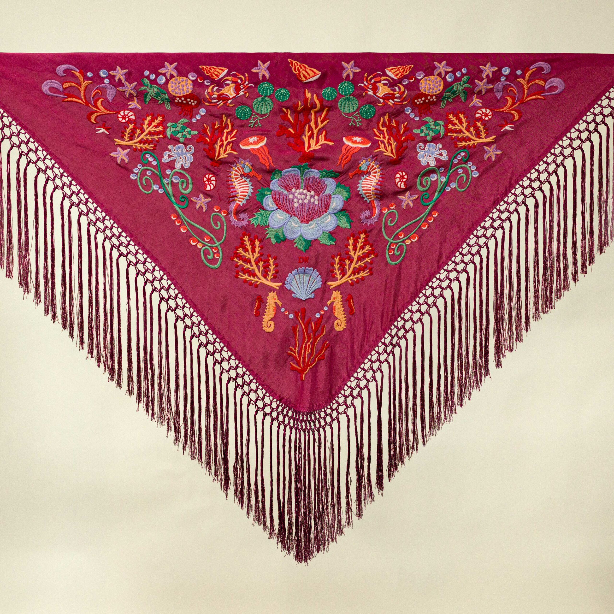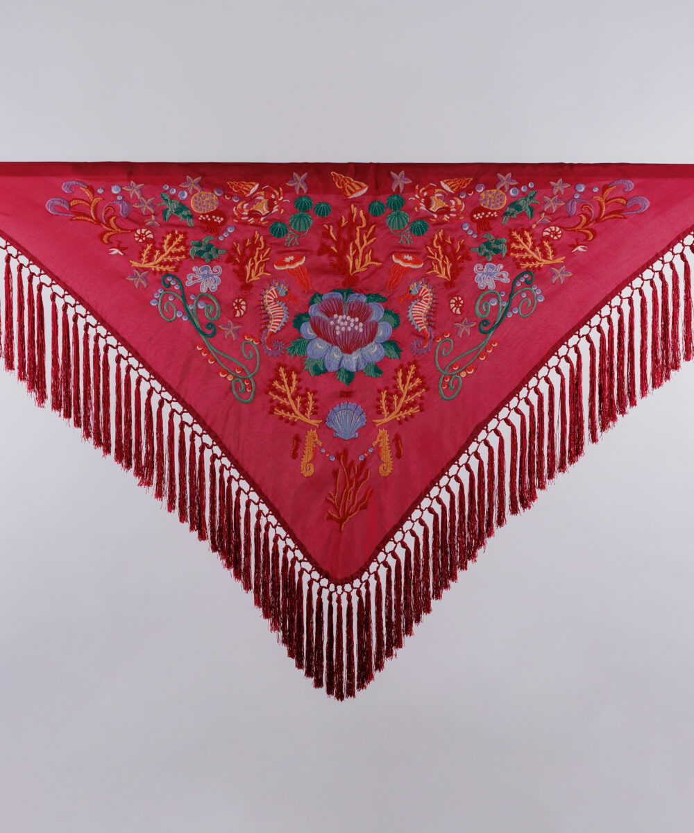 Los mantoncillos de la Darwin Collection son piezas artesanales confeccionadas con seda teñida a mano y flecado manual, utilizando hilo del mismo tono. Esta dedicación artesanal los convierte en piezas delicadas y únicas.