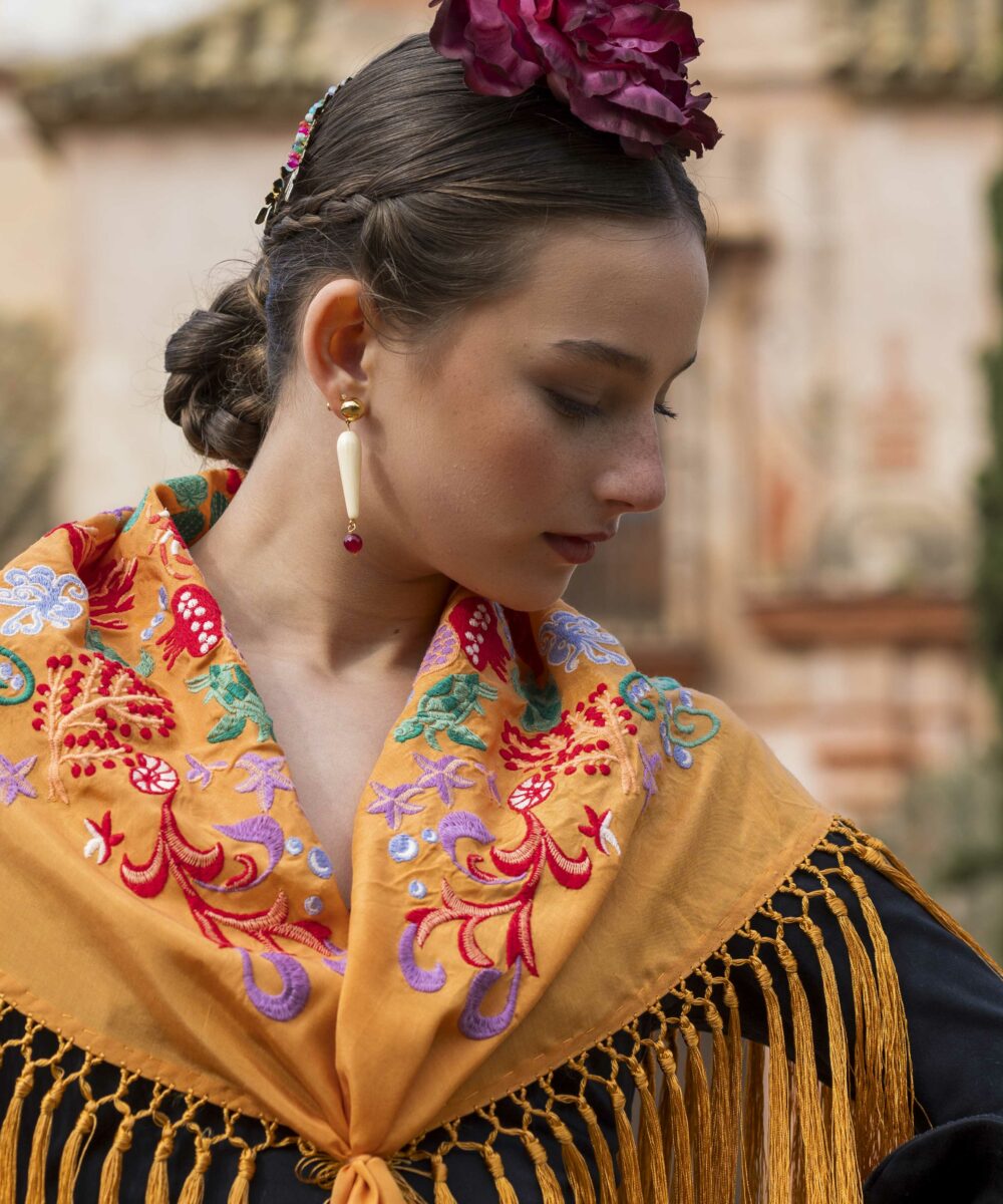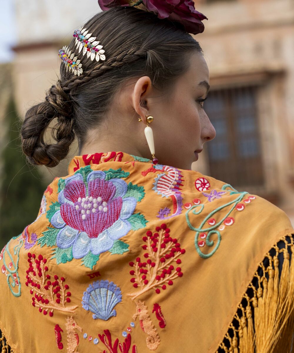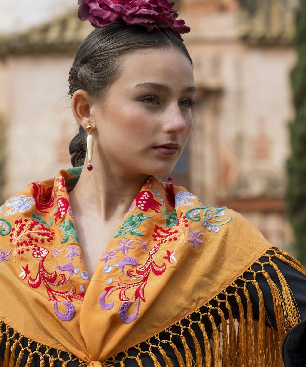 Además, explora nuestra colección de complementos, como pendientes y peinecillos, diseñados y fabricados por nuestra marca aquí en el taller. ¡Atrévete a lucir única y elegante en la próxima feria con el Mantoncillo Mar DW mandarina!