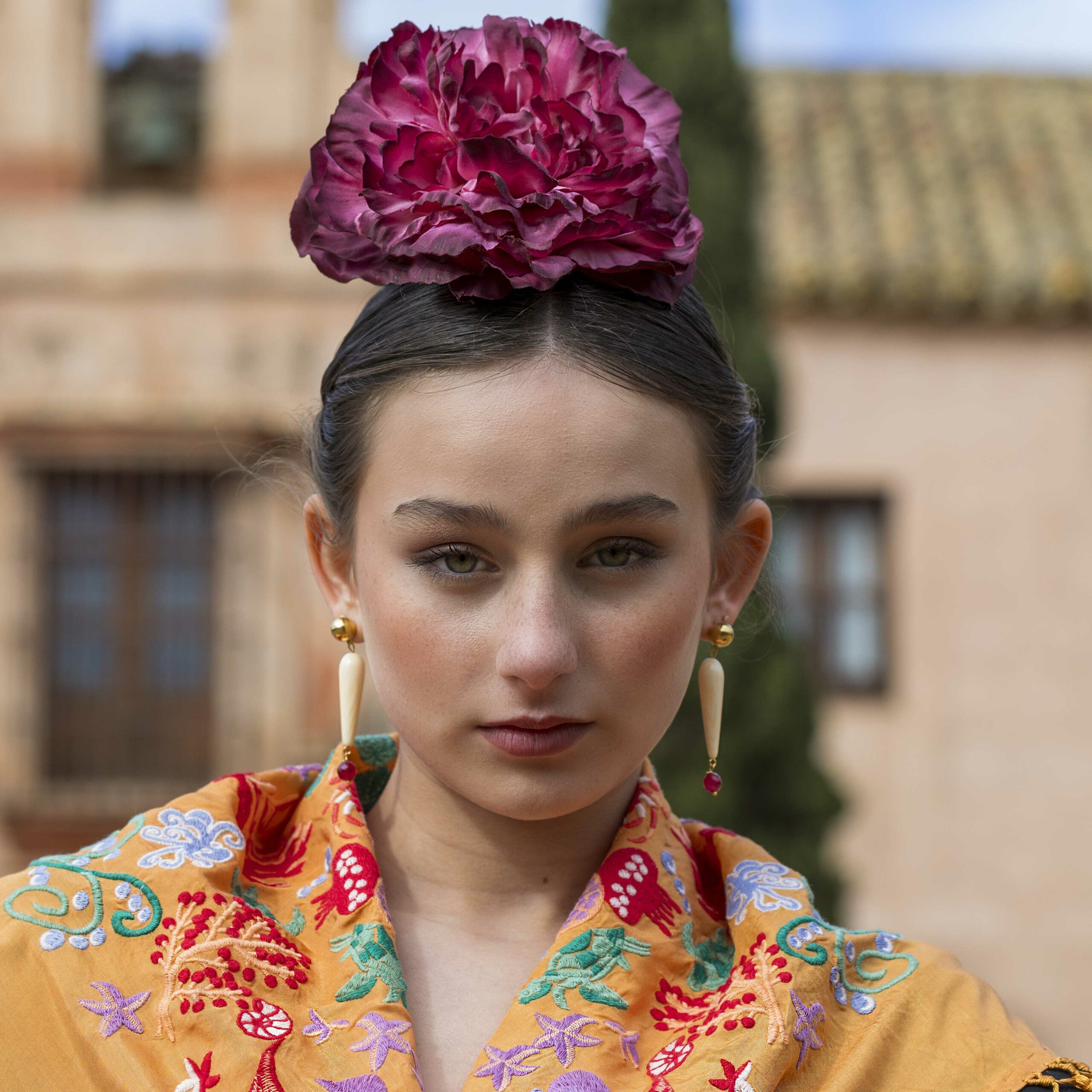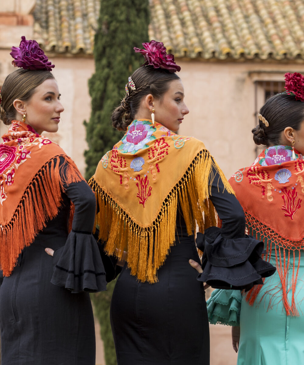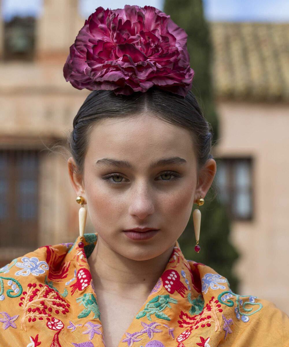 Además, explora nuestra colección de complementos, como pendientes y peinecillos, diseñados y fabricados por nuestra marca aquí en el taller. ¡Atrévete a lucir única y elegante en la próxima feria con el Mantoncillo Mar DW mandarina!