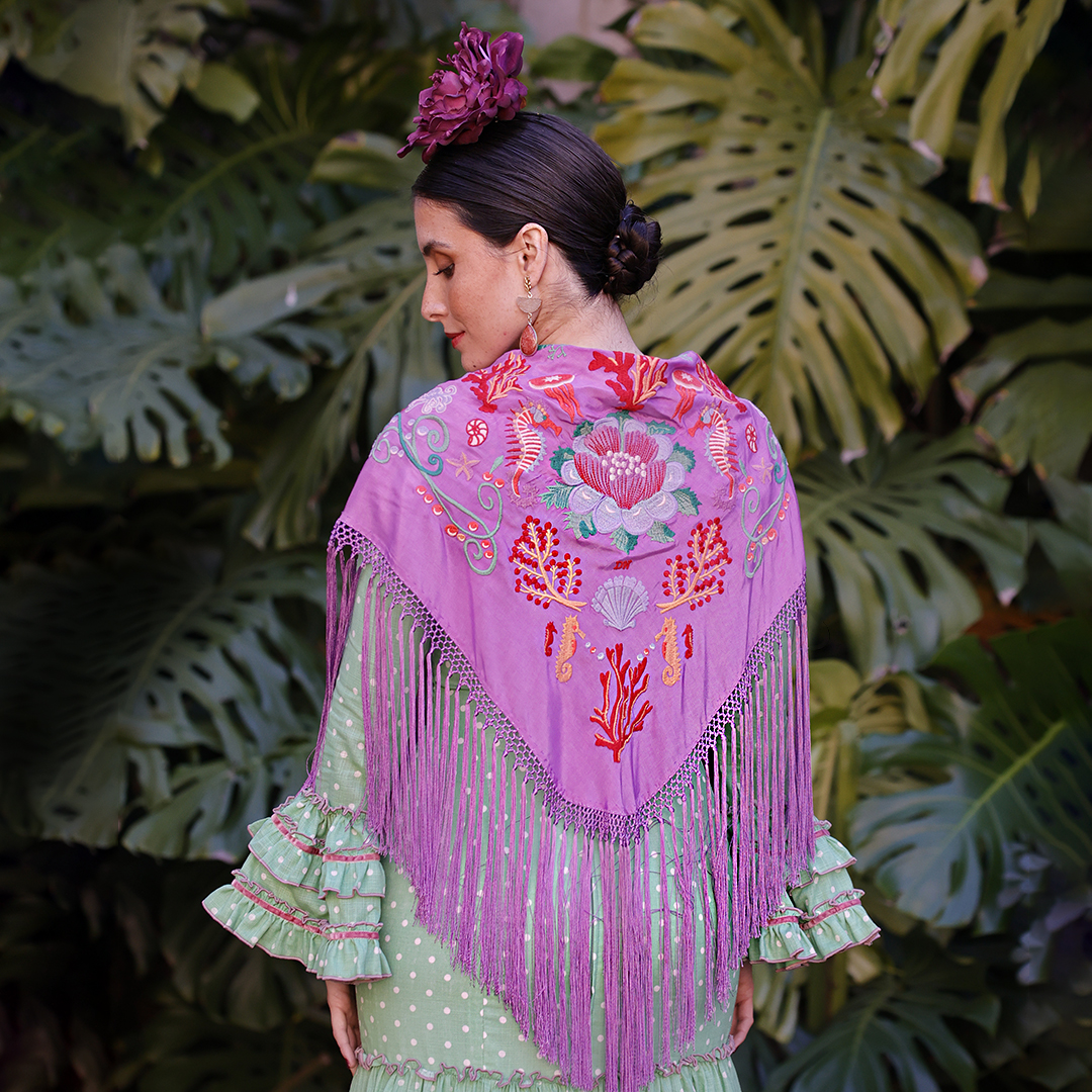 Además, explora nuestra colección de complementos, como pendientes y peinecillos, diseñados y fabricados por nuestra marca aquí en el taller. ¡Atrévete a lucir única y elegante en la próxima feria con el Mantoncillo Mar DW morado!