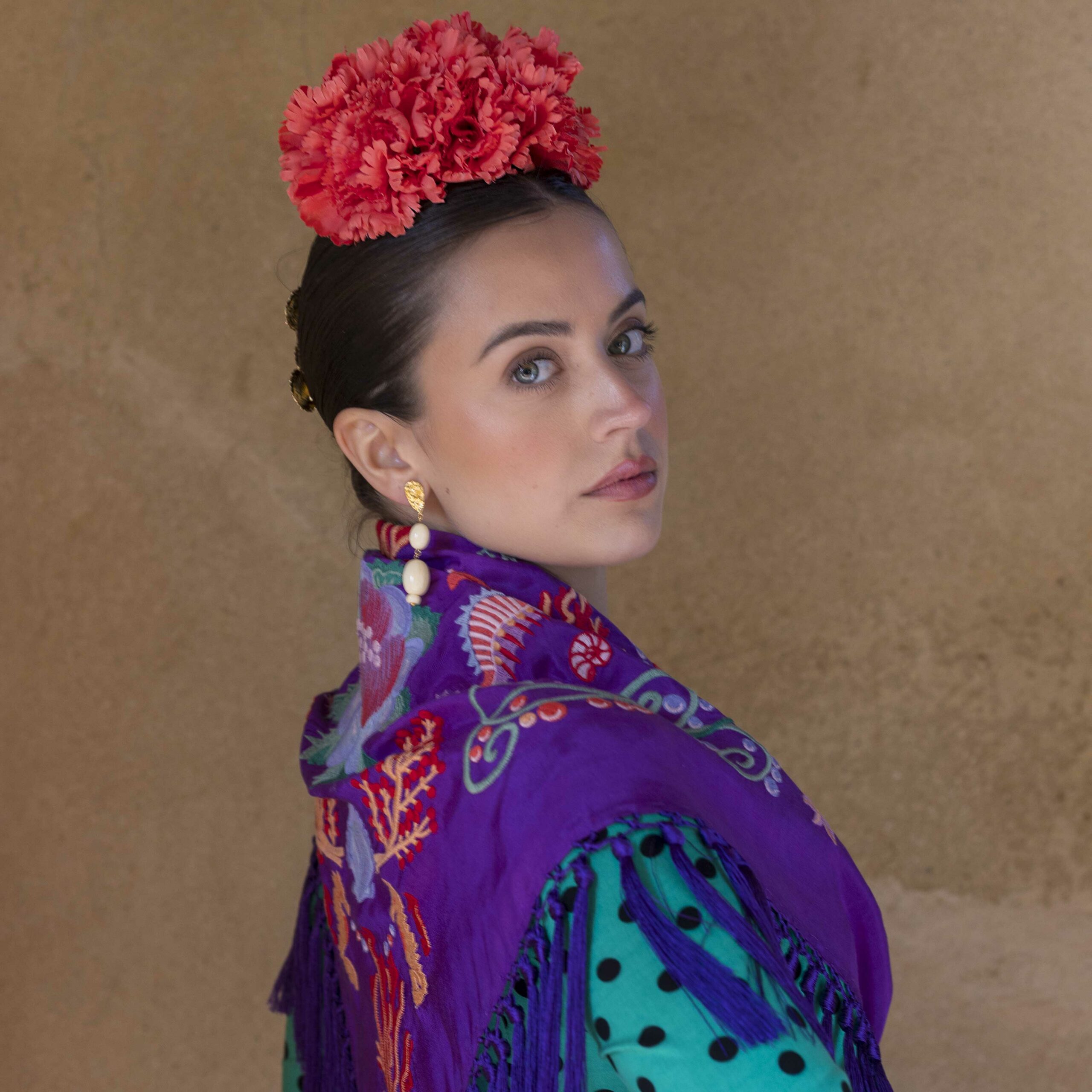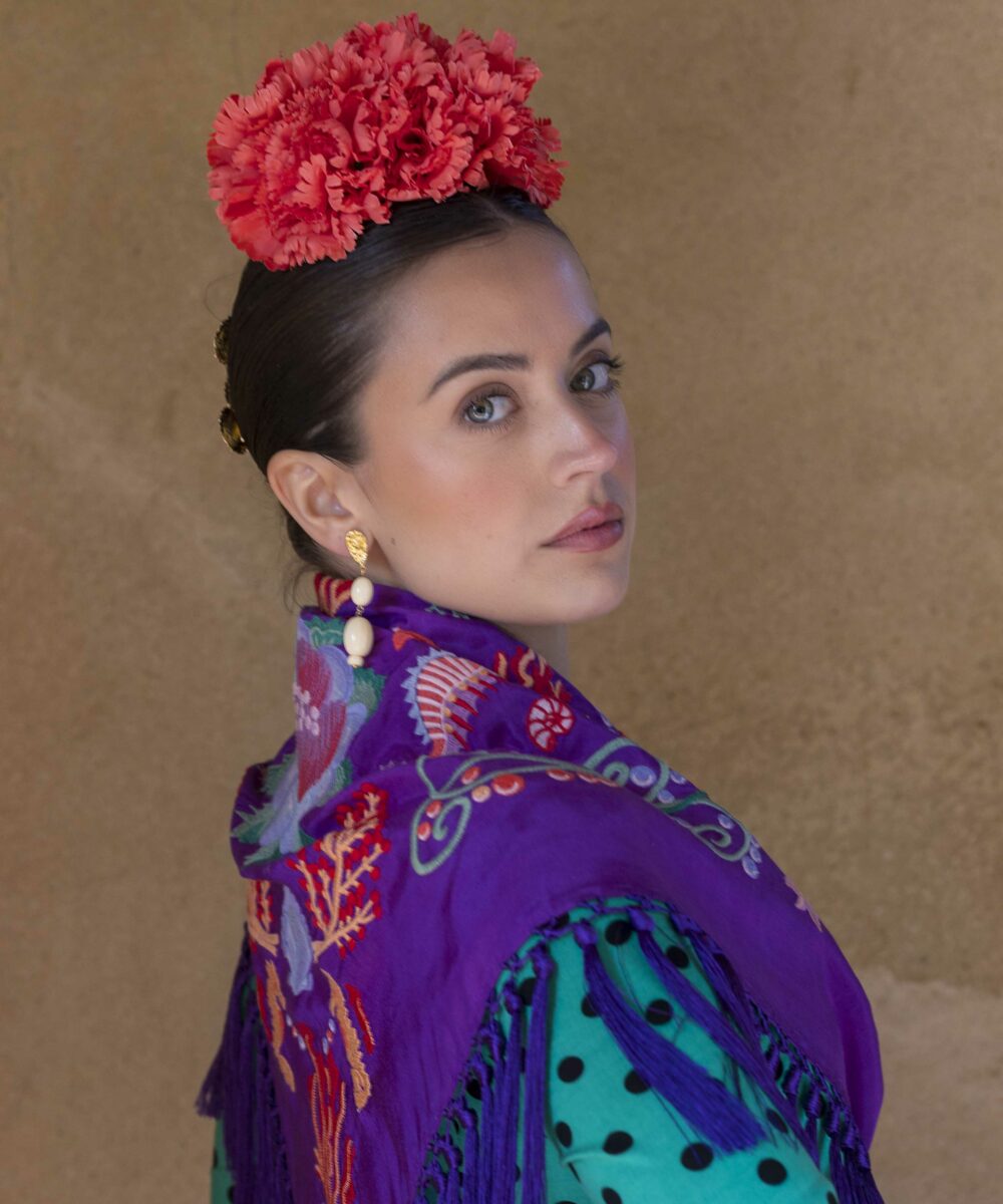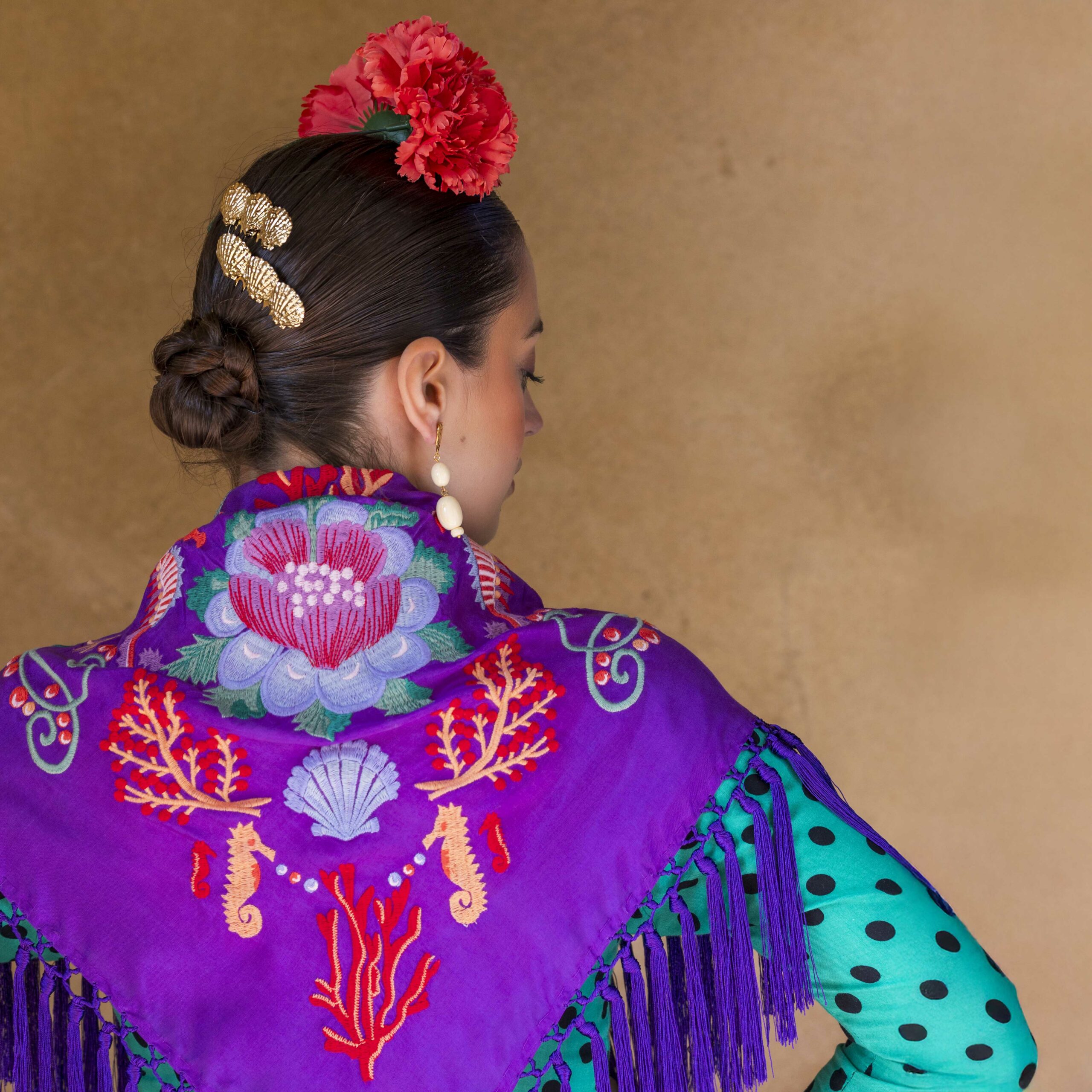 Además, explora nuestra colección de complementos, como pendientes y peinecillos, diseñados y fabricados por nuestra marca aquí en el taller. ¡Atrévete a lucir única y elegante en la próxima feria con el Mantoncillo Mar DW !