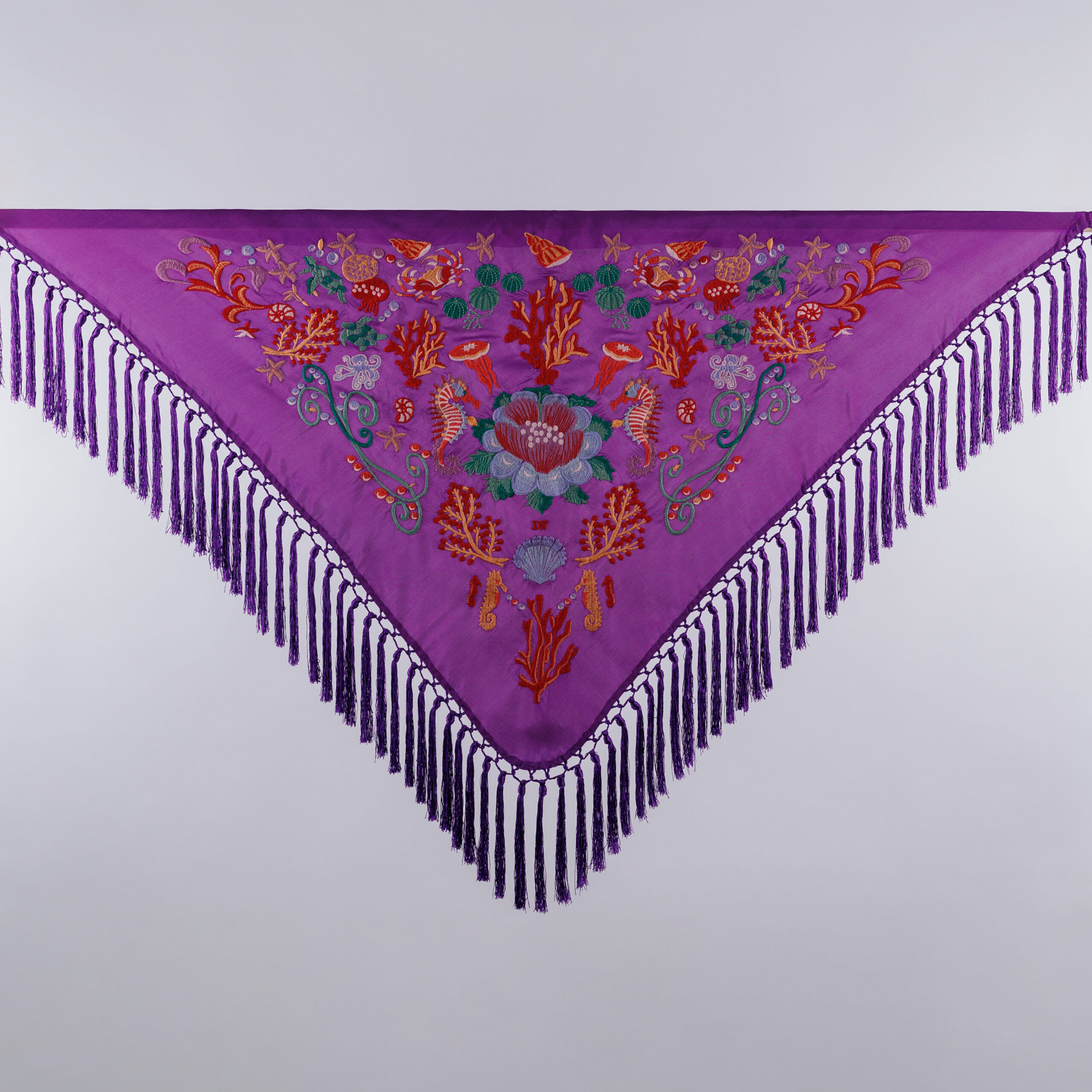 Los mantoncillos de la Darwin Collection son piezas artesanales confeccionadas con seda teñida a mano y flecado manual, utilizando hilo del mismo tono. Esta dedicación artesanal los convierte en piezas delicadas y únicas.