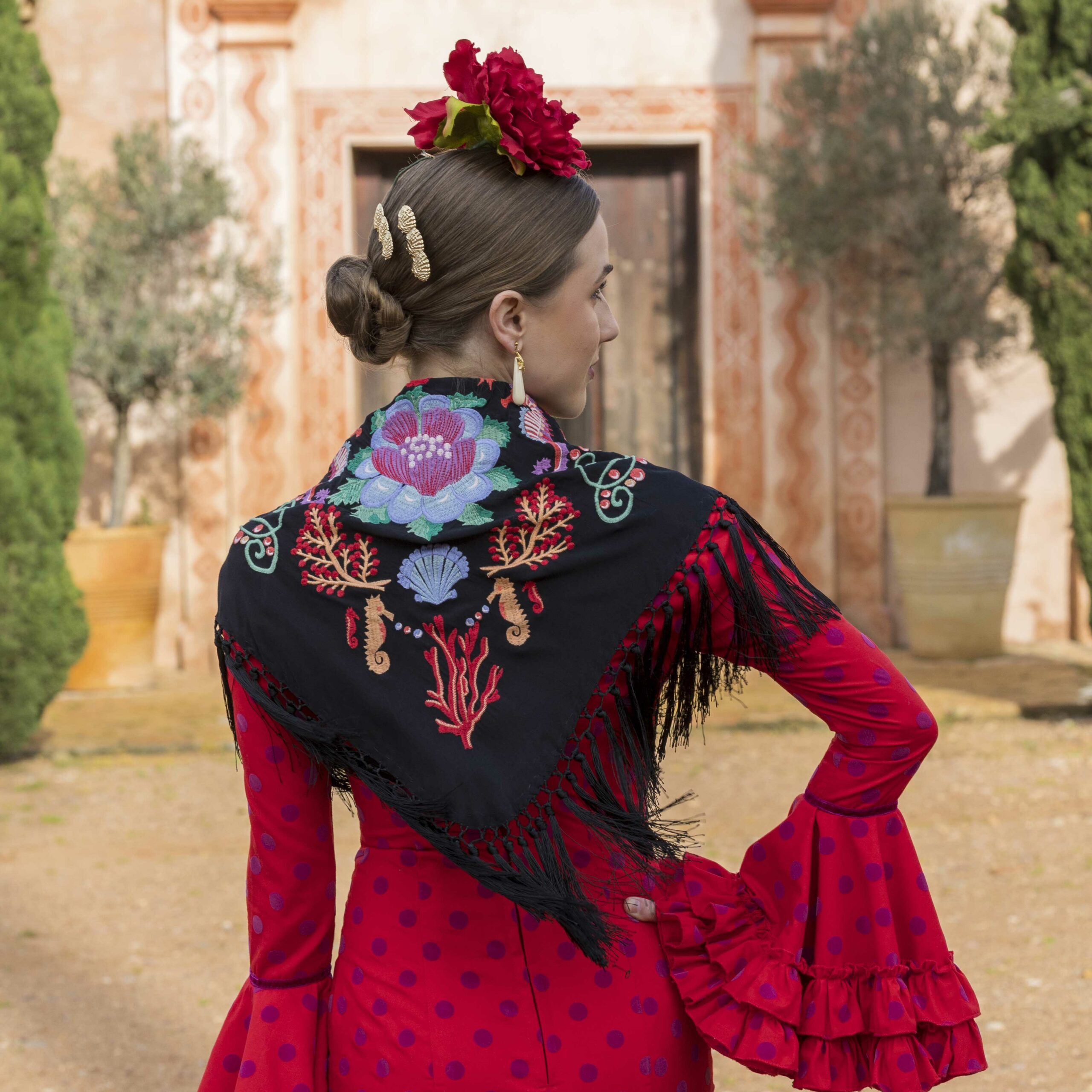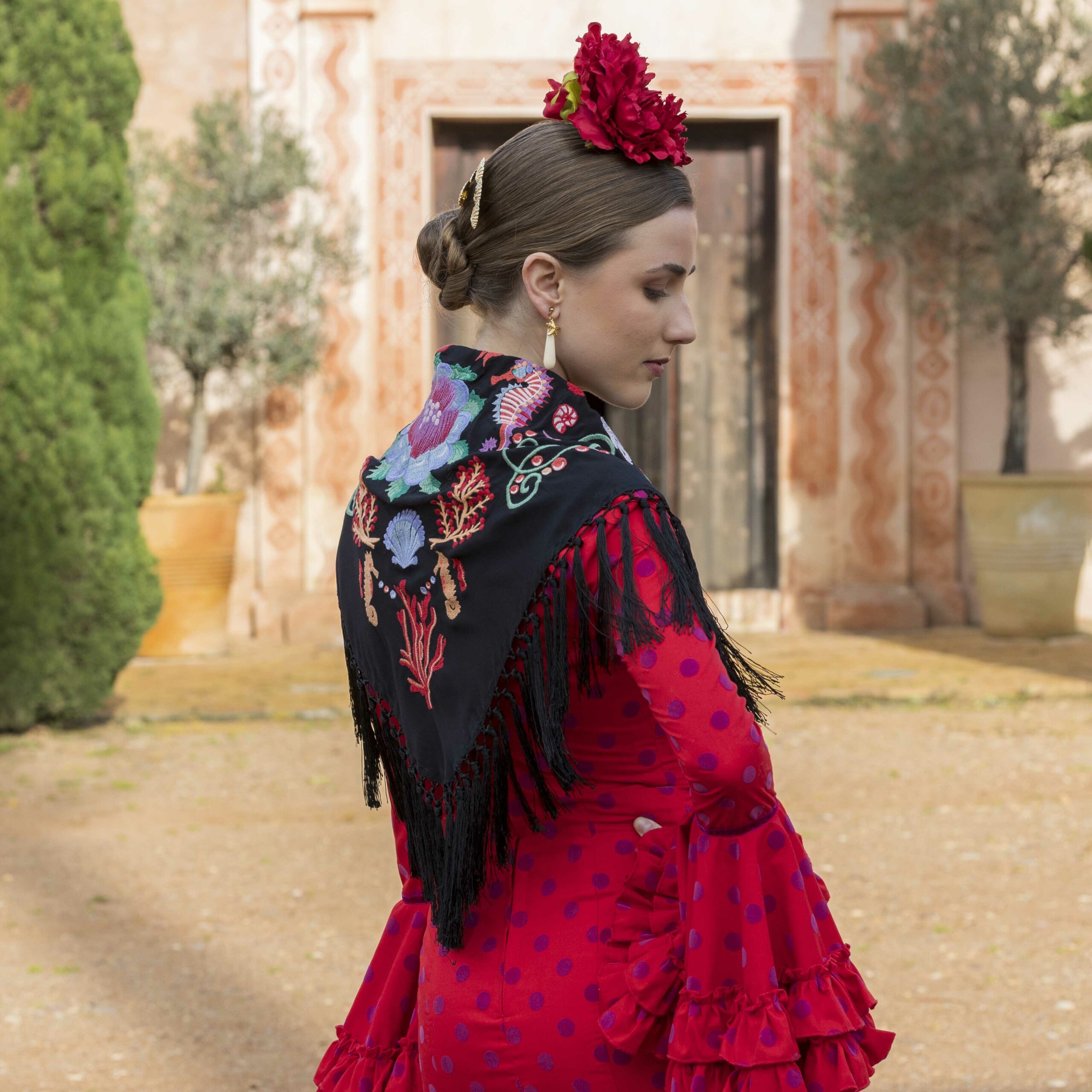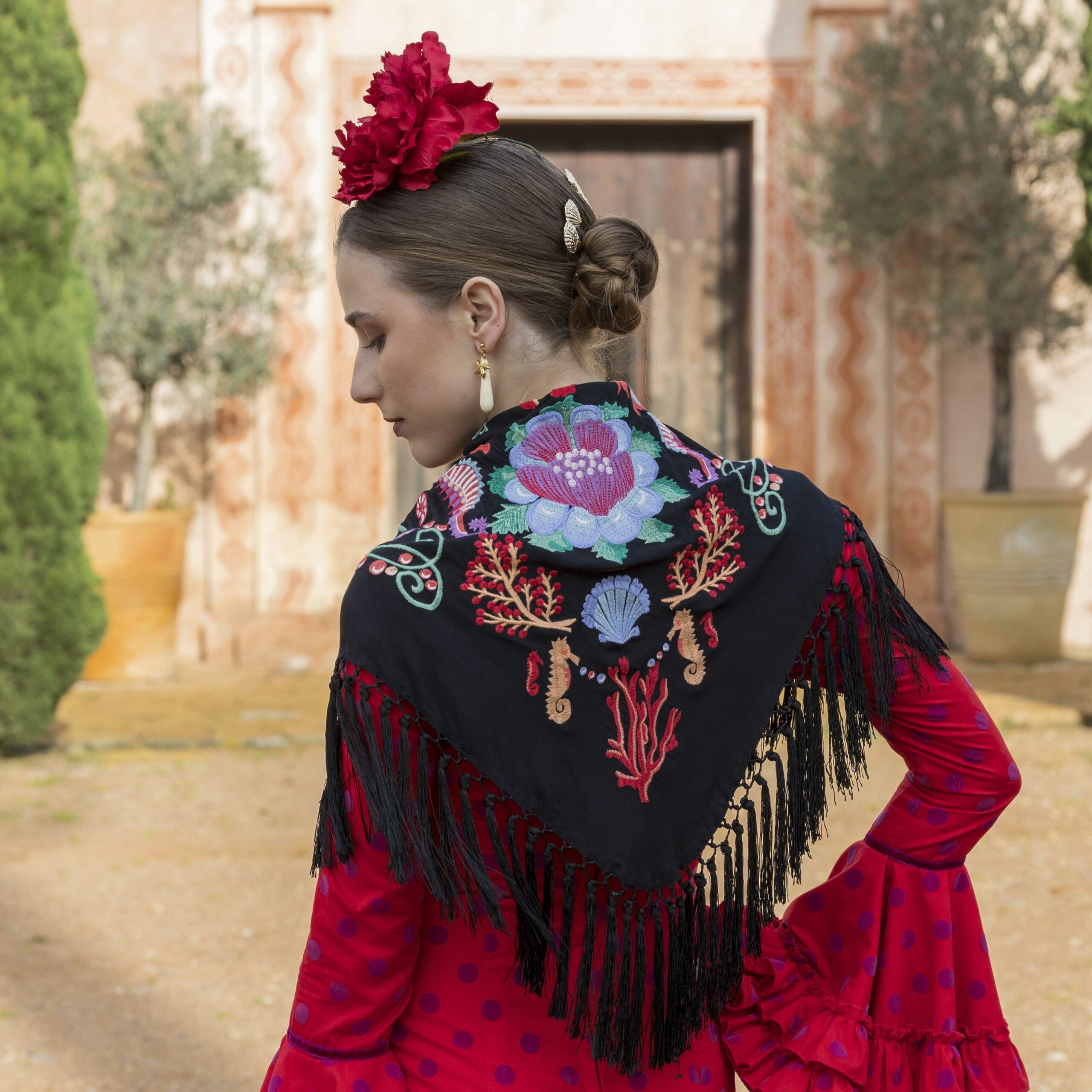 Además, explora nuestra colección de complementos, como pendientes y peinecillos, diseñados y fabricados por nuestra marca aquí en el taller. ¡Atrévete a lucir única y elegante en la próxima feria con el Mantoncillo Mar DW negro!