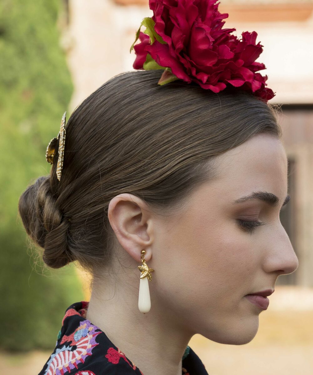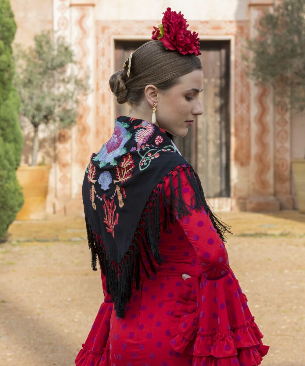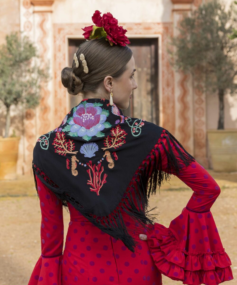Además, explora nuestra colección de complementos, como pendientes y peinecillos, diseñados y fabricados por nuestra marca aquí en el taller. ¡Atrévete a lucir única y elegante en la próxima feria con el Mantoncillo Mar DW negro!