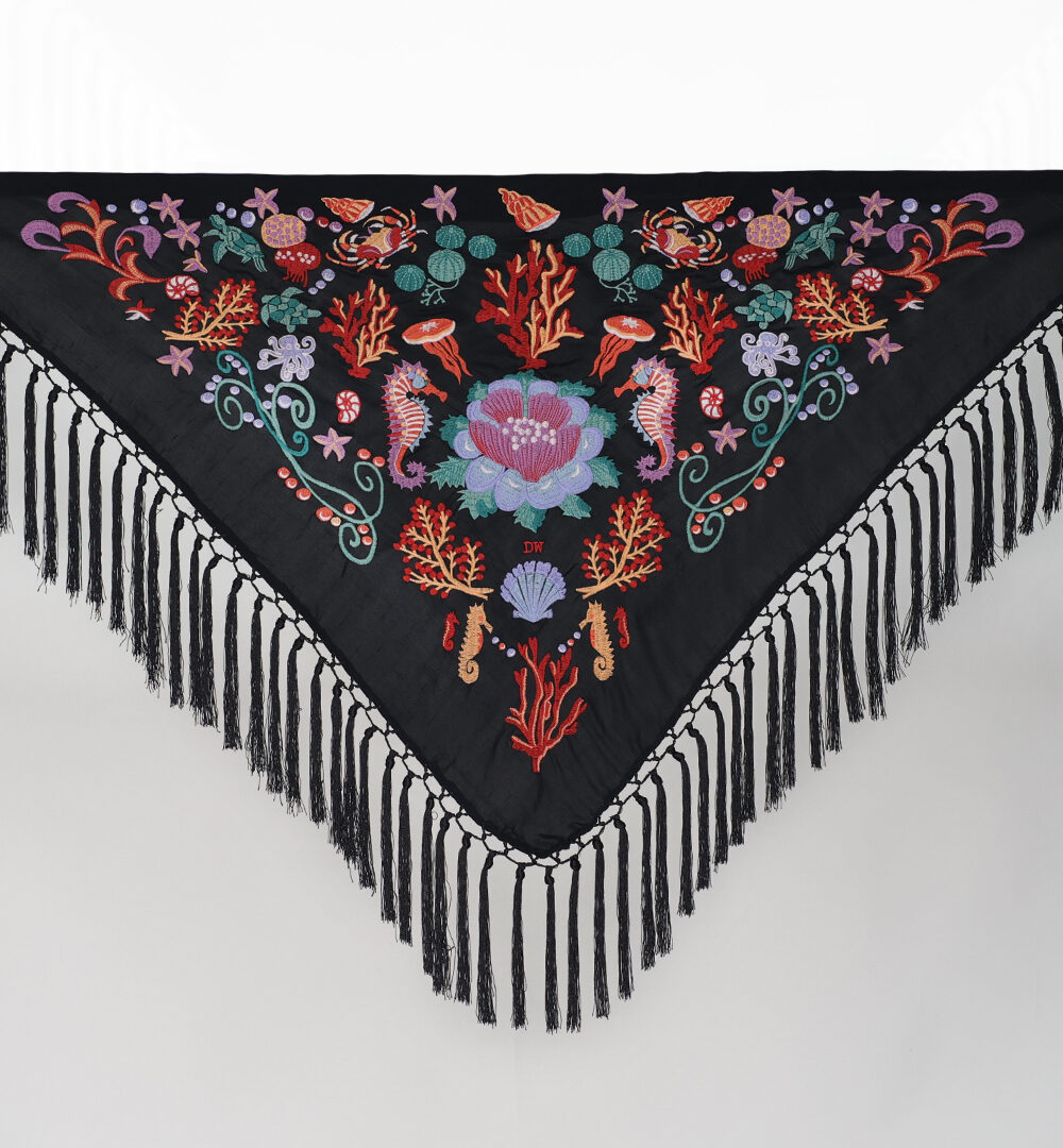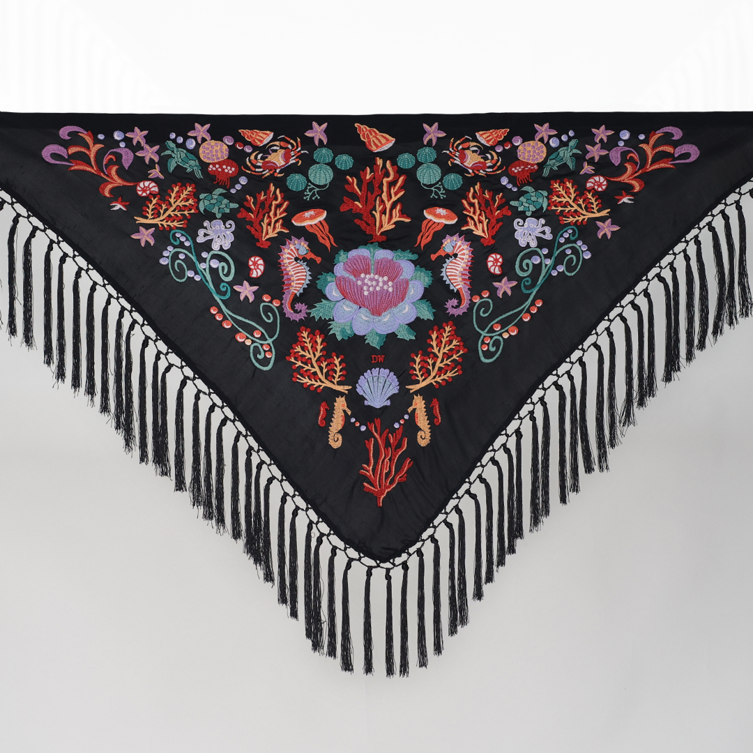 ¡Te presentamos el  Mantoncillo Mar DW negro  de Darwin Collection! Este encantador mantón es parte de los exclusivos diseños de la Colección de Feria 2024.Disponible  en unidades limitadas, convirtiéndolo en una joya única.
