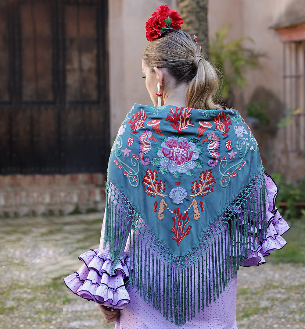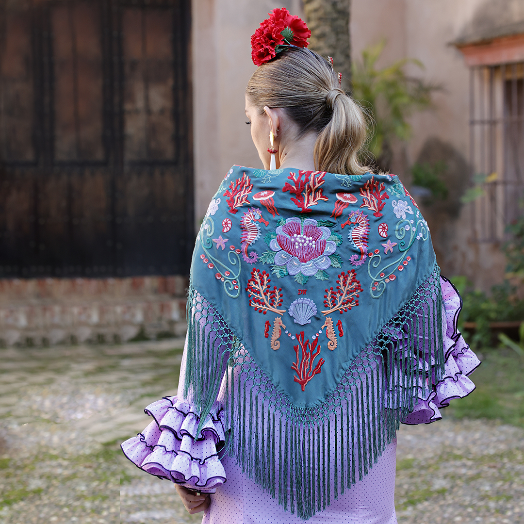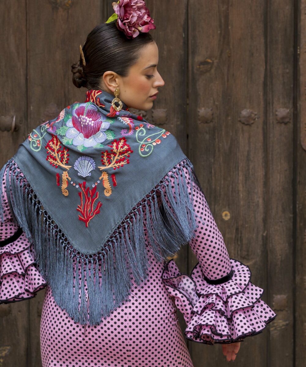 La inspiración para este diseño proviene del fondo marino, capturando la esencia del mar de manera innovadora en la moda flamenca. Cada detalle del dibujo se ha cuidado meticulosamente: una concha con perlas en el centro, corales, pulpos, medusas, erizos de mar, caballitos de mar, tortugas y hasta burbujas, todo se representa con gran detalle.